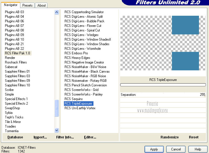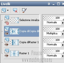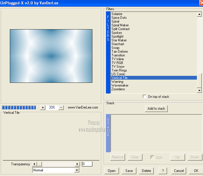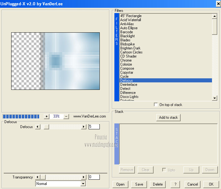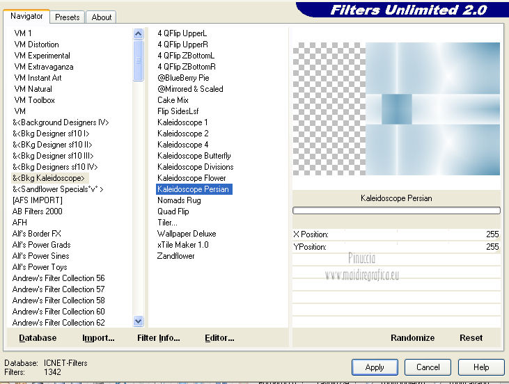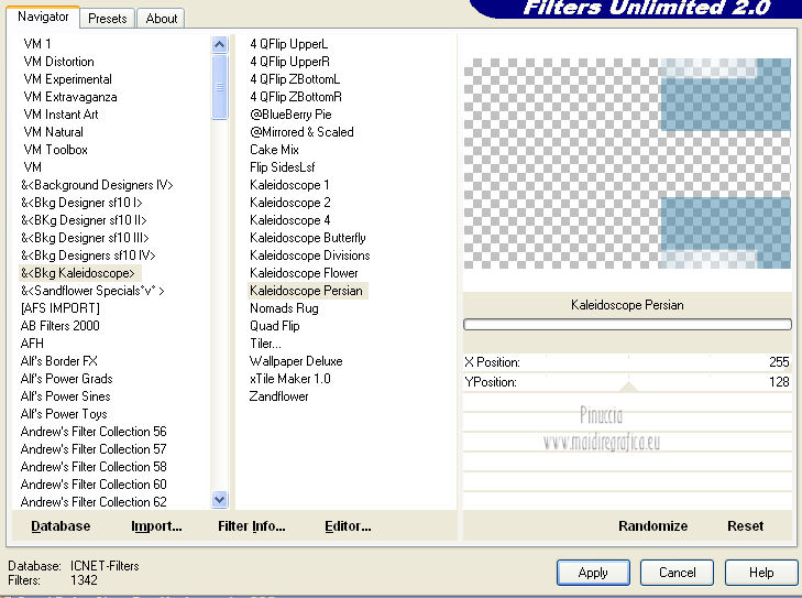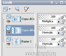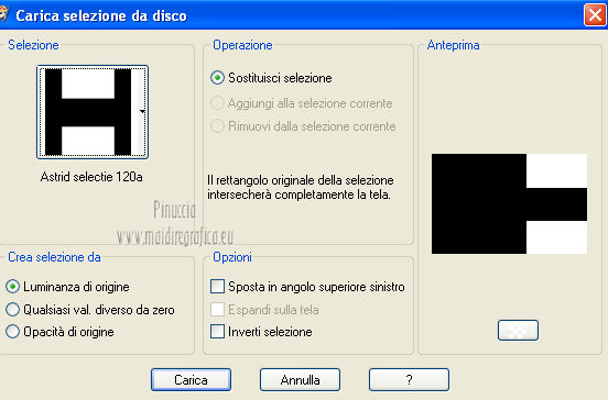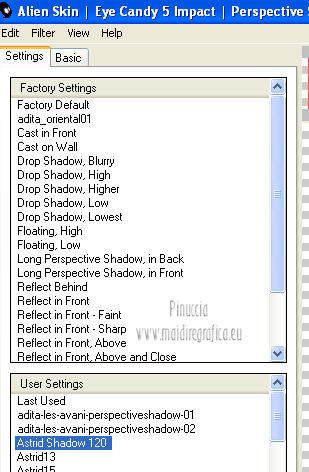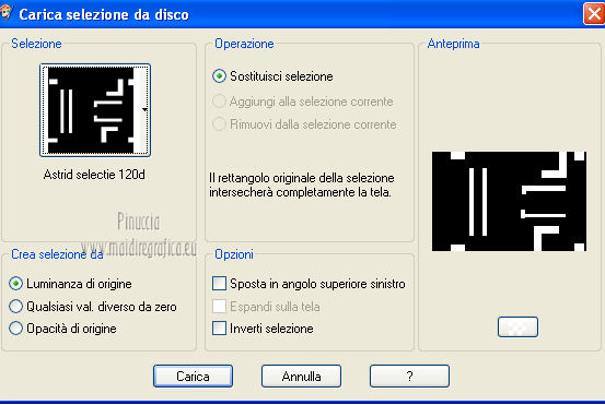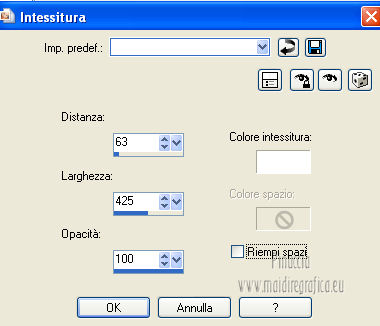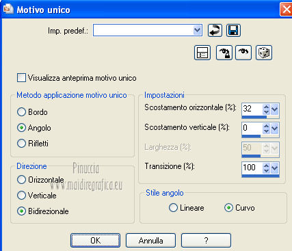 qui puoi trovare qualche risposta ai tuoi dubbi. Se l'argomento che ti interessa non è presente, ti prego di segnalarmelo. Per tradurre questo tutorial ho usato PSP X. Questo tutorial è una creazione di ©Araemae e non può essere copiato su altri siti nè essere offerto per il download. Lo stesso vale per la mia traduzione. Il materiale viene da vari gruppi di condivisione. Il copyright appartiene ai rispettivi autori. Grazie ai creatori dei tubes che mettono a disposizione il loro lavoro in vari gruppi di condivisione. Occorrente: Materiale qui Il tube della donna è di Annelies Filtri: consulta, se necessario, la mia sezione filtri qui Filters Unlimited 2.0 qui &<BKG Kaleidoscope> - Kaleidoscope Persian (da importare in Unlimited) qui &<Background Designers_IV> - sf10 Shades of Shadow (da importare in Unlimited) qui AP Lines - SilverLining qui VanDerLee - Unplugged-X qui RCS Filter Pak 1.0 - RCS Triple Exposure qui Simple - Left Right Wrap (bonus) qui Alien Skin Eye Candy 5 Impact - Perspective Shadow qui I filtri RCS Pack 1.0 e Simple si possono usare da soli o importati in Filters Unlimited ![]() Metti le selezioni nella cartella Selezioni. se stai usando altri colori, sei libero di sperimentare le modalità di miscelatura più adatte 1. Imposta il colore di primo piano con il bianco, e il colore di sfondo con un colore scelto dal tuo tube. I miei colori. ![]() Passa il colore di primo piano a Gradiente. ![]() Apri una nuova immagine trasparente 850 x 550 pixels, e riempila con il gradiente.2. Effetti>Plugins>VanDerLee - Unplugged-X - Vertical Tile. ![]() 3. Effetti>Effetti di trama>Intessitura. ![]() 4. Livelli>Duplica. Immagine>Rifletti. 5. Selezione>Carica/Salva selezione>Carica selezione da disco. Cerca e carica la selezione "Astrid selectie 120". ![]() Premi sulla tastiera il tasto CANC. Selezione>Deseleziona. 6. Effetti>Plugins>Filters Unlimited 2.0 - &<Bkg Kaleidoscope> - Kaleidoscope Persian ![]() 7. Effetti>Plugins>VanDerLee - Unplugged-X - Defocus. ![]() 8. Effetti>Effetti 3D>Sfalsa ombra, con il colore di sfondo. ![]() 9. Livelli>Duplica. Effetti>Effetti di immagine>Motivo unico. ![]() 10. Cambia la modalità di miscelatura di questo livello in Moltiplica. ![]() 11. Attiva il livello centrale. ![]() Selezione>Carica/Salva selezione>Carica selezione da disco. Cerca e carica la selezione "Astrid selectie 120a". ![]() Selezione>Innalza selezione a livello. Selezione>Deseleziona. Livelli>Disponi>Porta in alto. 12. Chiudi il livello superiore e attiva il livello sottostante. ![]() Livelli>Unisci>Unisci visibile. Effetti>Effetti di bordo>Aumenta. 13. Riapri e attiva il livello superiore. Effetti>Plugins>Filters Unlimited 2.0 - &<Bkg Kaleidoscope> - Kaleidoscope Persian ![]() Cambia la modalità di miscelatura di questo livello in Sovrapponi. 14. Livelli>Nuovo livello raster. Selezione>Carica/Salva selezione>Carica selezione da disco. Cerca e carica la selezione "Astrid selectie 120b" ![]() 15. Riempi la selezione con il colore di sfondo.Selezione>Deseleziona. 16. Effetti>Plugins>RCS Filter Pak 1.0 - RCS TripleExposure. ![]() Ripeti l'Effetto una seconda volta. ![]() 17. Effetti>Plugins>Filters Unlimited 2.0 - &<Background Designers IV> - sf10 Shades of Shadow. ![]() 18. Sullo stesso livello. Selezione>Carica/Salva selezione>Carica selezione da disco. Cerca e carica la selezione "Astrid selectie 120c". ![]() 19. Effetti>Plugins>Simple - Left Right Wrap. Effetti>Effetti di bordo>Aumenta. 20. Effetti>Effetti 3D>Sfalsa ombra. ![]() Selezione>Deseleziona. 21. Apri "Astrid blokjes 120" e vai a Modifica>Copia. Torna al tuo lavoro e vai a Modifica>Incolla come nuovo livello. Sposta il tube come nell'esempio.![]() Per il mio esempio ho cambiato la modalità di miscelatura di questo livello in Filtra. 22. Apri il tube "Astrid tekst 120" e vai a Modifica>Copia. Torna al tuo lavoro e vai a Modifica>Incolla come nuovo livello. Sposta il testo a sinistra.![]() 23. Livelli>Unisci>Unisci visibile. 24. Selezione>Carica/Salva selezione>Carica selezione da disco. Cerca e carica la selezione "Astrid selectie 120d". ![]() 25. Regola>Aggiungi/Rimuovi disturbo>Aggiungi disturbo. ![]() Selezione>Deseleziona. 26. Apri "Astrid deco 120" e vai a Modifica>Copia. Torna al tuo lavoro e vai a Modifica>Incolla come nuovo livello. Spostalo contro il bordo superiore.![]() 27. Apri "Astrid tekst 120a" e vai a Modifica>Copia. Torna al tuo lavoro e vai a Modifica>Incolla come nuovo livello. Sposta questo testo a destra, al centro.![]() 28. Apri il tube "Alies 10VR85-woman-15102012" e vai a Modifica>Copia. Torna al tuo lavoro e vai a Modifica>Incolla come nuovo livello. Immagine>Ridimensiona, al 90%, tutti i livelli non selezionato. Lascialo come sta. 29. Effetti>Plugins>Alien Skin Eye Candy 5 Impact - Perspective Shadow. Seleziona il preset Astrid Shadow 120 e ok. ![]() 30. Aggiungi il tuo nome e/o il tuo watermark su un nuovo livello. Livelli>Unisci>Unisci tutto e salva in formato jpg. Per questi esempi ho usato tubes di Thafs ![]() Mary ![]() ![]() Se hai problemi o dubbi, o trovi un link non funzionante, o anche soltanto per un saluto, scrivimi. 24 Gennaio 2013 |