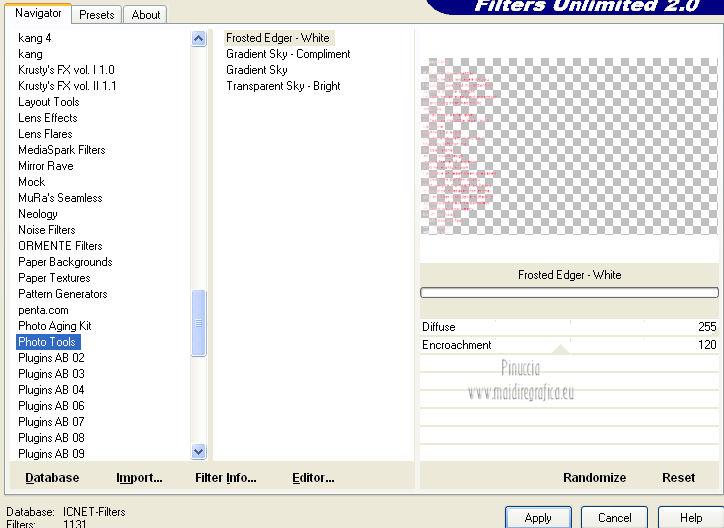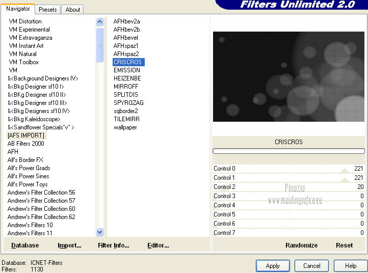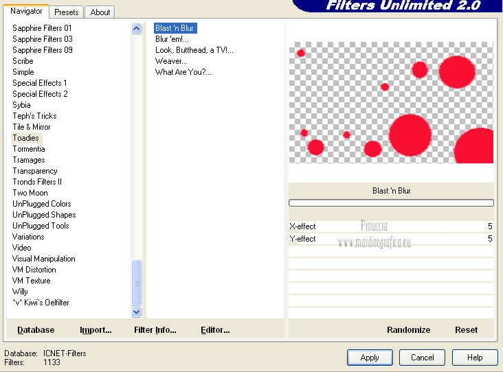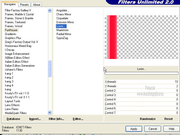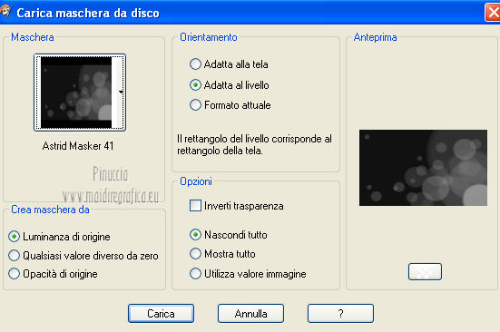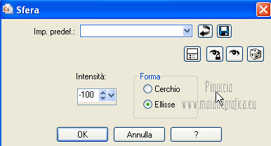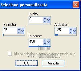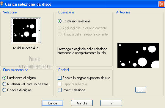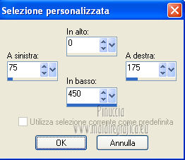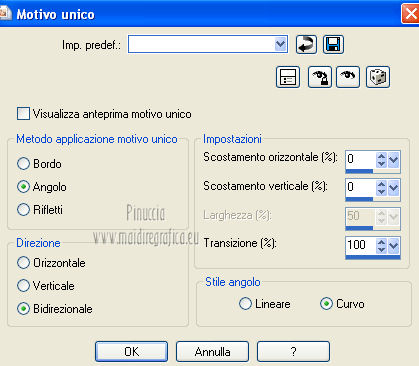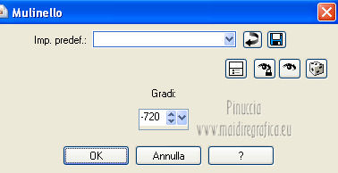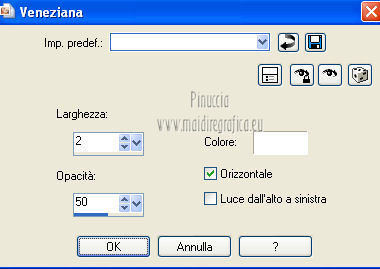 qui puoi trovare qualche risposta ai tuoi dubbi. Se l'argomento che ti interessa non è presente, ti prego di segnalarmelo. Per tradurre questo tutorial ho usato PSP X. Questo tutorial è una creazione di ©Araemae e non può essere copiato su altri siti nè essere offerto per il download. Lo stesso vale per la mia traduzione. Il materiale viene da vari gruppi di condivisione. Il copyright appartiene ai rispettivi autori. Grazie ai creatori dei tubes che mettono a disposizione il loro lavoro in vari gruppi di condivisione. Occorrente: Materiale qui Il tube della donna è di LuzCristina Filtri: consulta, se necessario, la mia sezione filtri qui Filters Unlimited 2.0 qui AFS IMPORT - CrisCros qui Funhouse - Loom qui Photo Tools - Frosted Edger White qui Toadies - Blast 'n Blur qui ![]() se stai usando altri colori, sei libero di sperimentare le modalità di miscelatura più adatte Apri il font e minimizzalo. Lo troverai nella lista dei font disponibili quando ti servirà. Metti la maschera nella cartella Maschere. Metti le selezioni nella cartella Selezioni. 1. Scegli un colore dal tuo tube, e impostalo come colore di primo piano. Imposta il colore di sfondo con il colore bianco. ![]() Apri una nuova immagine trasparente 750 x 450 pixels, e riempila con il colore bianco.2. Livelli>Nuovo livello raster. Attiva lo strumento Selezione ![]() clicca sull'icona Selezione personalizzata ![]() e imposta i seguenti settaggi. ![]() Riempi la selezione con il colore di primo piano.Selezione>Deseleziona. 3. Effetti>Plugins>Filters Unlimited 2.0 - Funhouse - Loom. ![]() Abbassa l'opacità di questo livello all'80%. 4. Livelli>Nuovo livello raster. Selezione personalizzata ![]() ![]() Riempi la selezione con il colore di primo piano.Selezione>Deseleziona. Effetti>Effetti di bordo>Aumenta. 5. Effetti>Effetti geometrici>Sfera. ![]() 6. Effetti>Effetti di distorsione>Mulinello. ![]() 7. Effetti>Effetti di immagine>Motivo unico. ![]() 8. Livelli>Nuovo livello raster. Riempi il livello con il colore di primo piano.Livelli>Carica/Salva maschera>Carica maschera da disco. Cerca e carica la maschera "Astrid Masker 41". ![]() Rimani sul livello della maschera. Effetti>Plugins>Filters Unlimited 2.0 - AFS Import - CrisCros. ![]() Effetti>Effetti di bordo>Aumenta. Livelli>Unisci>Unisci gruppo. 9. Apri il tube "41 Astrid tekst 41" e vai a Modifica>Copia. Torna al tuo lavoro e vai a Modifica>Incolla come nuovo livello. Spostalo contro il bordo a sinistra.![]() Livelli>Duplica. Livelli>Unisci>Unisci giù. 10. Effetti>Plugins>Filters Unlimited 2.0 - PhotoTools - Frosted Edger-White. ![]() 11. Effetti>Effetti di immagine>Motivo unico. ![]() 12. Livelli>Nuovo livello raster. Selezione>Carica/Salva selezione>Carica selezione da disco. Cerca e carica la selezione "Astrid selectie 41". ![]() Riempi la selezione con il colore di primo piano.13. Selezione>Modifica>Contrai - 1 pixel. Premi sulla tastiera il tasto CANC. Selezione>Deseleziona. 14. Livelli>Nuovo livello raster. Selezione>Carica/Salva selezione>Carica selezione da disco. Cerca e carica la selezione "Astrid selectie 41a". ![]() Riempi la selezione con il colore di primo piano.Selezione>Deseleziona. 15. Effetti>Plugnis>Filters Unlimited 2.0 - Toadies - Blast 'n Blur. ![]() Ripeti l'Effetto una seconda volta. Attenzione, devi impostare nuovamente Y-effect con 5 perchè Unlimited non tiene in memoria i settaggi precedenti. 16. Apri il tube "2737-luzcristina" e vai a Modifica>Copia. Torna al tuo lavoro e vai a Modifica>Incolla come nuovo livello. Immagine>Ridimensiona, all'80%, tutti i livelli non selezionato. Spostalo un po' più a sinistra, come nel mio esempio.17. Livelli>Duplica. Livelli>Unisci>Unisci giù. 18. Immagine>Aggiungi bordatura, 1 pixel, simmetriche, con il colore di primo piano. Immagine>Aggiungi bordatura, 5 pixels, simmetriche, con un colore chiaro scelto dall'immagine. Immagine>Aggiungi bordatura, 1 pixel, simmetriche, con il colore di primo piano. Immagine>Aggiungi bordatura, 75 pixels, simmetriche, con un colore chiaro scelto dall'immagine. Immagine>Aggiungi bordatura, 1 pixel, simmetriche, con il colore di primo piano. Immagine>Aggiungi bordatura, 5 pixels, simmetriche, con un colore chiaro scelto dall'immagine. Immagine>Aggiungi bordatura, 5 pixels, simmetriche, con il colore di primo piano. 19. Inverti i colori nella paletta dei materiali. Attiva lo strumento Testo ![]() ![]() Scrivi nel bordo da 75 pixels "OOPSY-DAISY". Livelli>Converti in livello raster. 20. Livelli>Duplica e attiva il livello sottostante dell'originale. Effetti>Effetti di distorsione>Vento - da destra, intensità 100. ![]() 21. Effetti>Effetti di trama>Veneziana - colore bianco. ![]() 22. Livelli>Unisci>Unisci tutto. Immagine>Ridimensiona, all'80%, tutti i livelli selezionato. Regola>Messa a fuoco>Metti a fuoco. 23. Aggiungi il tuo nome e/o il tuo watermark su un nuovo livello. Livelli>Unisci>Unisci tutto. ![]() Se hai problemi o dubbi, o trovi un link non funzionante, o anche soltanto per un saluto, scrivimi. 26 Luglio 2012 |