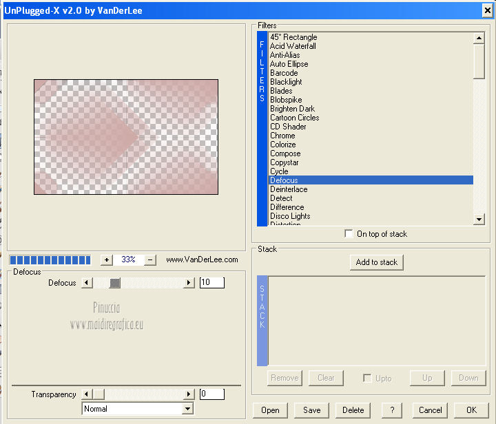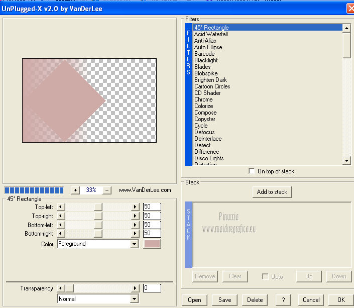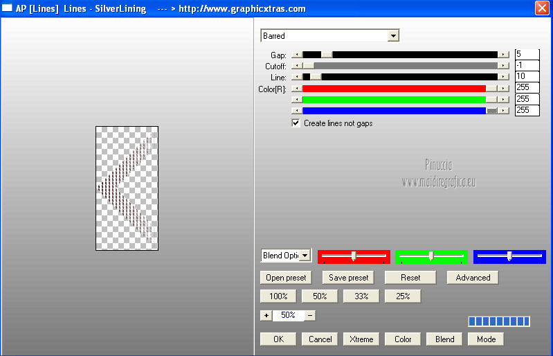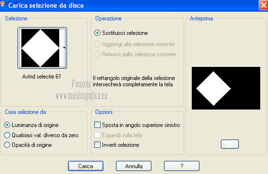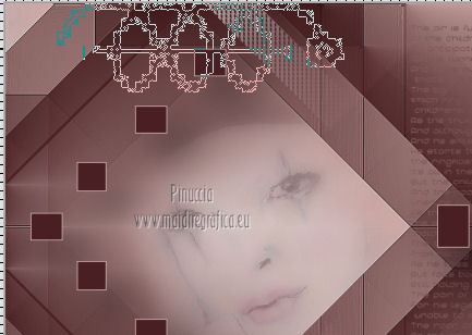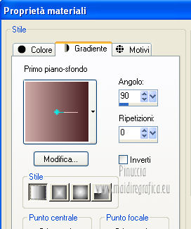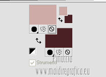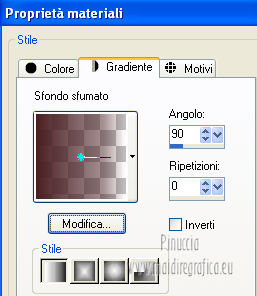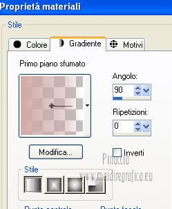qui puoi trovare qualche risposta ai tuoi dubbi. Se l'argomento che ti interessa non è presente, ti prego di segnalarmelo. Per tradurre questo tutorial ho usato PSP X. Questo tutorial è una creazione di ©Araemae e non può essere copiato su altri siti nè essere offerto per il download. Lo stesso vale per la mia traduzione. Il materiale viene da vari gruppi di condivisione. Il copyright appartiene ai rispettivi autori. Grazie ai creatori dei tubes che mettono a disposizione il loro lavoro in vari gruppi di condivisione. Occorrente: Materiale qui I tubes dei pierrot sono di Dorien Filtri: consulta, se necessario, la mia sezione filtri qui VanDerLee - Unplugged X qui AP lines - Lines SilverLining qui Alien Skin Eye Candy 5 Impact - Perspective Shadow qui ![]() se stai usando altri colori, sei libero di sperimentare le modalità di miscelatura più adatte Metti le selezioni nella cartella Selezioni. Apri "Astrid deco 61a", "Astrid deco 61b" e "Astrid tekst 61" in PSP, ed esportali come pennelli personalizzati. Scegli due colori dai tuoi tube e imposta il colore di primo piano con il colore chiaro, e il colore di sfondo con il colore scuro. I miei colori. ![]() Passa il colore di primo piano a Gradiente e selezione il Gradiente di primo piano sfumato, (se stai usando le versioni più recenti di PSP corrisponde al gradiente Corel_06_026). ![]() 1. Apri una nuova immagine trasparente 800 x 500 pixels, e riempila con il colore di sfondo.2. Livelli>Nuovo livello raster. Riempi con il gradiente.3. Premi il tasto D (valido per tutte le versioni) per attivare lo strumento Deformazione ![]() e, in modalità Scala, spingi il nodo centrale a destra all'interno, fino a 400 pixels. ![]() Premi il tasto M per deselezionare la griglia dello strumento. 4. Effetti>Plugins>VanDerLee - Unplugged X - 45° Rectangle. ![]() 5. Effetti>Effetti di immagine>Motivo unico. ![]() 6. Effetti>Plugins>VanDerLee - Unplugged-X - Defocus. ![]() Effetti>Effetti di bordo>Aumenta. 7. Livelli>Duplica. Immagine>Rifletti. Cambia la modalità di miscelatura di questo livello in Moltiplica. Livelli>Disponi>Sposta giù. 8. Attiva il livello superiore. Selezione>Carica/Salva selezione>Carica selezione da disco. Cerca e carica la selezione "Astrid selectie 61". ![]() 9. Apri il tube "Dorien_Misted_Face_Pierrot_November2011" e vai a Modifica>Copia. Torna al tuo lavoro e vai a Modifica>Incolla come nuovo livello. Immagine>Ridimensiona, al 75%, tutti i livelli non selezionato. 10. Sposta il tube nell'area selezionata.![]() Selezione>Inverti. Premi sulla tastiera il tasto CANC. Selezione>Deseleziona. 11. Effetti>Effetti di immagine>Motivo unico. ![]() Abbassa l'opacità di questo livello al 50%. 12. Livelli>Nuovo livello raster. Inverti i colori nella paletta dei materiali e chiudi il colore di sfondo. ![]() 13. Attiva lo strumento Penna ![]() linea di stile Pieno; larghezza 3. ![]() Traccia una linea nell'angolo in alto a sinistra, come nell'esempio. ![]() 14. Livelli>Duplica. Immagine>Capovolgi. Livelli>Unisci>Unisci giù. 15. Livelli>Nuovo livello raster. Inverti nuovamente i colori nella paletta dei materiali. Passa il colore di primo piano a Gradiente di primo piano/sfondo, con i seguenti settaggi. ![]() 16. Attiva lo strumento Pennello ![]() cerca e seleziona il pennello "Astrid tekst 61" e applicalo come nell'esempio. ![]() 17. Livelli>Nuovo livello raster. Selezione>Carica/Salva selezione>Carica selezione da disco. Cerca e carica la selezione "Astrid selectie 61a". ![]() 18. Passa il colore di primo piano a Gradiente di Sfondo sfumato (nelle versioni più recenti corrisponde a Corel_06_025) ![]() Riempi la selezione con il gradiente.Selezione>Deseleziona. 19. Effetti>Plugins>AP lines - SilverLining - Barred. ![]() 20. Effetti>Effetti di immagine>Motivo unico. ![]() Abbassa l'opacità di questo livello al 65%. 21. Livelli>Nuovo livello raster. Selezione>Carica/Salva selezione>Carica selezione da disco. Cerca e carica la selezione "Astrid selectie 61b". ![]() 22. Riempi la selezione con il colore di primo piano.Selezione>Modifica>Contrai - 1 pixel. Riempi la selezione con il colore di sfondo.Selezione>Deseleziona. 23. Effetti>Plugins>Alien Skin EyeCandy5 Impact - Perspective Shadow, seleziona il preset Drop Shadow, Blurry e ok. ![]() 24. Livelli>Nuovo livello raster. Attiva lo strumento Pennello ![]() cerca e seleziona il pennello "Astrid deco 61a" e applicalo in alto a sinistra, come nell'esempio. ![]() Livelli>Nuovo livello raster. Seleziona il pennello "Astrid deco 61b" e applicalo a destra, come nell'esempio. ![]() 25. Apri il tube "Dorien_Pierrot_November2011" e vai a Modifica>Copia. Torna al tuo lavoro e vai a Modifica>Incolla come nuovo livello. Immagine>Ridimensiona, al 55%, tutti i livelli non selezionato. Sposta il tube in basso, sul bordo.26. Effetti>Plugins>Alien Skin Eye Candy 5 Impact - Perspective Shadow, seleziona il preset Drop Shadow, Blurry e ok. ![]() 27. Livelli>Unisci>Unisci tutto. Immagine>Aggiungi bordatura, 1 pixel, simmetriche, con il colore di primo piano. Livelli>Innalza livello di sfondo. Immagine>Ridimensiona, all'80%, tutti i livelli non selezionato. 28. Livelli>Nuovo livello raster. Riempi con il colore di sfondo.Livelli>Disponi>Sposta giù. Immagine>Aggiungi bordatura, 1 pixel, simmetriche, con il colore di primo piano. 27. Aggiungi il tuo nome e/o il tuo watermark su un nuovo livello. Livelli>Unisci>Unisci tutto e salva in formato jpg. ![]() Le vostre versioni. Grazie ![]() Dünya ![]() Se hai problemi o dubbi, o trovi un link non funzionante, o anche soltanto per un saluto, scrivimi. 26 Luglio 2012 |