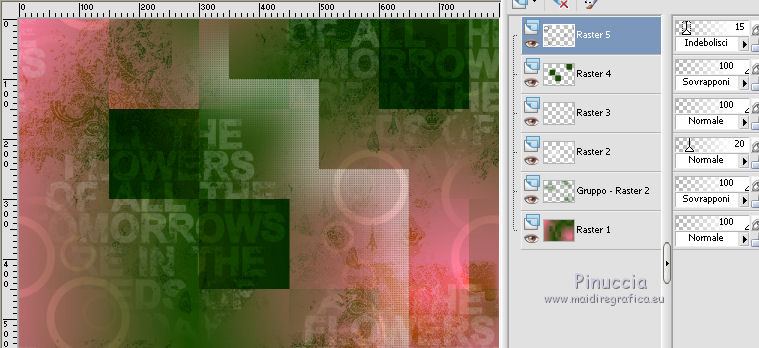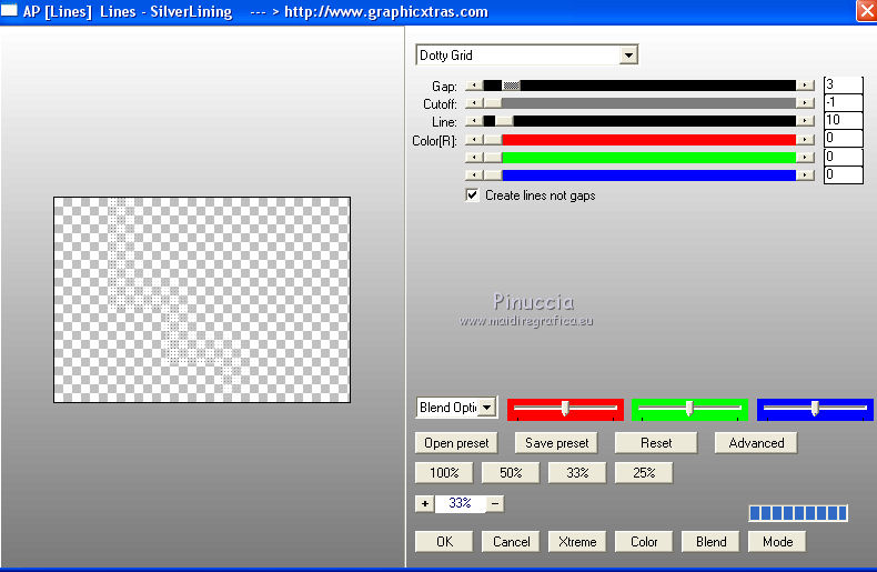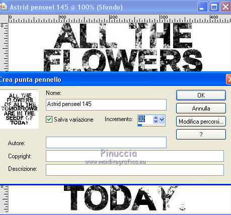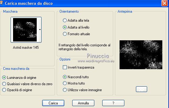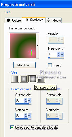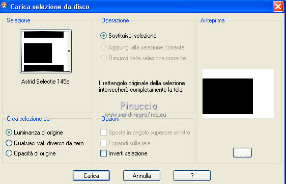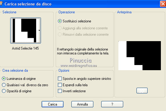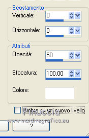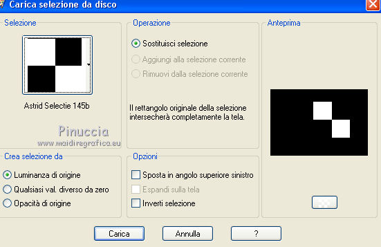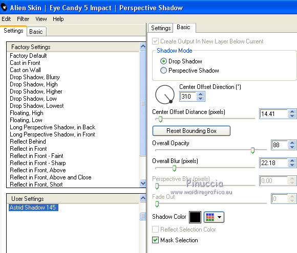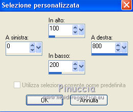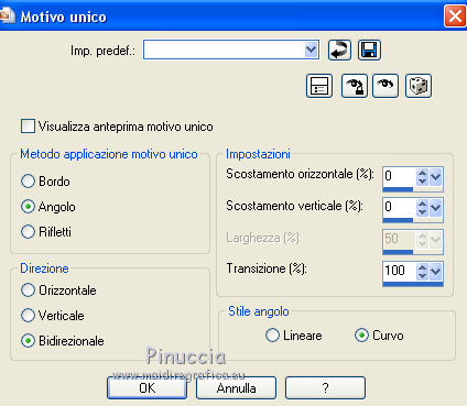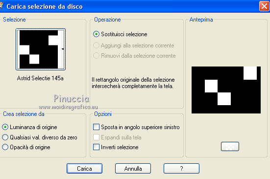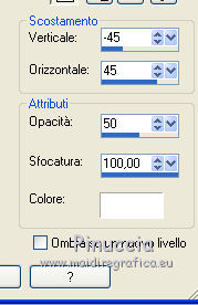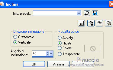 qui puoi trovare qualche risposta ai tuoi dubbi. Se l'argomento che ti interessa non è presente, ti prego di segnalarmelo. Per tradurre questo tutorial ho usato PSP X. Questo tutorial è stato creato con PspX5, ma può essere realizzato anche con le altre versioni di PSP. Dalla versione X4, il comando Immagine>Rifletti è stato sostituito con Immagine>Capovolgi in orizzontale, e il comando Immagine>Capovolgi con Immagine>Capovolgi in verticale. Nelle versioni X5 e X6, le funzioni sono state migliorate rendendo disponibile il menu Oggetti. Nella nuova versione X7 sono tornati Rifletti/Capovolgi, ma con nuove differenze. Vedi la scheda sull'argomento qui Per tradurre il tutorial ho usato PSPX. Occorrente: Materiale qui Per il tube della donna grazie Maryse Filtri: consulta, se necessario, la mia sezione filtri qui Mehdi - Sorting Tiles qui AP Lines - Lines SilverLining qui Alien Skin Eye Candy 5 Impact - Perspective Shadow qui ![]() se stai usando altri colori, sei libero di sperimentare le modalità di miscelatura più adatte Metti il preset Cliccando sul file una o due volte (a seconda delle tue impostazioni), automaticamente il preset si installerà nella cartella corretta. perchè uno o due clic vedi qui Metti le selezioni nella cartella Selezioni. Metti la maschera nella cartella Maschere. 1. Scegli due colori dai tuoi tubes. I miei colori: ![]() Passa il colore di primo piano a Gradiente di primo piano/sfondo, stile Sprazzo di luce. ![]() Apri una nuova immagine trasparente 800 x 550 pixels, e riempila con il gradiente.2. Effetti>Plugins>Mehdi - Sorting Tiles. ![]() 3. Livelli>Nuovo livello raster. Riempi con il colore di sfondo.4. Livelli>Carica/Salva maschera>Carica maschera da disco. Cerca e carica la maschera "Astrid masker 145". ![]() Livelli>Unisci>Unisci gruppo. Cambia la modalità di miscelatura di questo livello in Sovrapponi. ![]() 5. Apri "Astrid penseel 145". File>Esporta>Pennello personalizzato, assegna un nome al pennello e ok. ![]() 6. Livelli>Nuovo livello raster. Attiva lo strumento Pennello ![]() cerca e seleziona il pennello appena esportato ![]() 7. Imposta il colore di primo piano con il colore bianco, e applica il pennello cliccando una volta come nell'esempio, cliccando con il tasto sinistro del mouse per usare il colore di primo piano. ![]() 8. Effetti>Effetti di immagine>Motivo unico. ![]() Abbassa l'opacità di questo livello al 20%. ![]() 9. Livelli>Nuovo livello raster. Selezione>Carica/Salva selezione>Carica selezione da disco. Cerca e carica la selezione "Astrid selectie 145". ![]() 10. Effetti>Effetti 3D>Sfalsa ombra, colore bianco. ![]() Selezione>Deseleziona. 11. Effetti>Plugins>AP Lines - Lines SilverLining. ![]() 12. Immagine>Rifletti. Immagine>Capovolgi. 13. Livelli>Nuovo livello raster. Selezione>Carica/Salva selezione>Carica selezione da disco. Cerca e carica la selezione "Astrid selectie 145a". ![]() Riempi la selezione con il colore di sfondo.Selezione>Deseleziona. Cambia la modalità di miscelatura di questo livello in Sovrapponi. ![]() 14. Apri "Astrid deco 145"", e vai a Modifica>Copia. Torna al tuo lavoro e vai a Modifica>Incolla come nuovo livello. Lascialo come sta. É al suo posto. Cambia la modalità di miscelatura di questo livello in Indebolisci e abbassa l'opacità al 15%. ![]() 15. Livelli>Nuovo livello raster. Selezione>Carica/Salva selezione>Carica selezione da disco. Cerca e carica la selezione "Astrid selectie 145b". ![]() Riporta il colore di primo piano al colore iniziale. ![]() Riempi la selezione con il colore di primo piano.Selezione>Deseleziona. Abbassa l'opacità di questo livello al 50%. 16. Livelli>Nuovo livello raster. Selezione>Carica/Salva selezione>Carica selezione da disco. Cerca e carica la selezione "Astrid selectie 145c". ![]() Riempi la selezione con il colore di sfondo.Selezione>Deseleziona. Cambia la modalità di miscelatura di questo livello in Filtra. 17. Livelli>Nuovo livello raster. Selezione>Carica/Salva selezione>Carica selezione da disco. Cerca e carica la selezione "Astrid selectie 145d". ![]() Riempi la selezione con il colore di sfondo.Selezione>Deseleziona. 18. Attiva lo strumento Selezione ![]() (non importa il tipo di selezione impostato, perchè con la selezione personalizzata si ottiene sempre un rettangolo) clicca sull'icona Selezione personalizzata ![]() e imposta i seguenti settaggi. ![]() 19. Livelli>Nuovo livello raster. Riempi la selezione con il colore di sfondo.Selezione>Deseleziona. Livelli>Duplica. Immagine>Capovolgi. Livelli>Unisci>Unisci giù. 20. Effetti>Effetti geometrici>Inclina. ![]() 21. Effetti>Effetti di distorsione>Stringi (nelle versioni più recenti di PSP è diventato Compressione). ![]() Cambia la modalità di miscelatura di questo livello in Luce diffusa. ![]() 22. Apri "Astrid tekst 145", e vai a Modifica>Copia. Torna al tuo lavoro e vai a Modifica>Incolla come nuovo livello. Posiziona il testo come nell'esempio.![]() 23. Livelli>Nuovo livello raster. Selezione>Carica/Salva selezione>Carica selezione da disco. Cerca e carica la selezione "Astrid selectie 145e". ![]() 24. Effetti>Effetti 3D>Sfalsa ombra, colore bianco. ![]() Selezione>Deseleziona. Cambia la modalità di miscelatura di questo livello in Sovrapponi. 25. Apri il tube "MR_Columbine", e vai a Modifica>Copia. Torna al tuo lavoro e vai a Modifica>Incolla come nuovo livello. Cancella il watermark. 26. Immagine>Ridimensiona, al 75%, tutti i livelli non selezionato. Sposta il tube a sinistra, contro il bordo.![]() 27. Effetti>Plugins>Alien Skin Eye Candy 5 Impact - Perspective Shadow. Seleziona il preset e ok. In caso di problemi con il preset, copia i settaggi nella schermata. ![]() 28. Immagine>Aggiungi bordatura, 1 pixel, simmetriche, colore di sfondo. Immagine>Aggiungi bordatura, 6 pixels, simmetriche, colore di primo piano. 29. Firma il tuo lavoro su un nuovo livello. Livelli>Unisci>Unisci tutto e salva in formato jpg. Il tube di questo esempio è di Guismo ![]() Le vostre versioni. Grazie ![]() Olimpia ![]