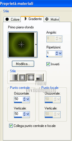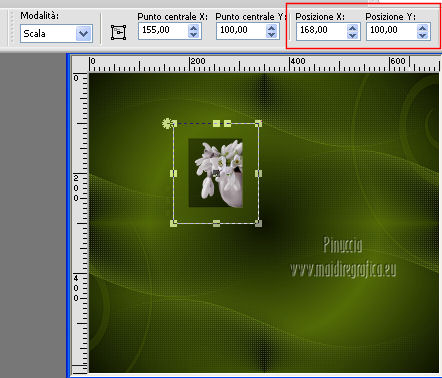 qui puoi trovare qualche risposta ai tuoi dubbi. Se l'argomento che ti interessa non è presente, ti prego di segnalarmelo. Per tradurre questo tutorial ho usato PSP X. Questo tutorial è una creazione di ©Araemae e non può essere copiato su altri siti nè essere offerto per il download. Lo stesso vale per la mia traduzione. Il materiale viene da vari gruppi di condivisione. Il copyright appartiene ai rispettivi autori. Grazie ai creatori dei tubes che mettono a disposizione il loro lavoro in vari gruppi di condivisione. Occorrente: Materiale qui Il tube del fiore è di Gerry Filtri: consulta, se necessario, la mia sezione filtri qui Filters Unlimited 2.0 qui Sybia - Tremorsc qui AP Lines - Lines SilverLining qui i filtri Sybia si possono usare da soli e importati in Filters Unlimited ![]() Apri i font e minimizzali. Li troverai nella lista dei font disponibili quando ti serviranno. Metti la maschera nella cartella Maschere. Metti la selezione nella cartella Selezioni. se stai usando altri colori, sei libero di sperimentare le modalità di miscelatura più adatte 1. Scegli un colore dal tuo tube e impostalo come colore di primo piano (il mio #536c06). Imposta il colore di sfondo con il colore nero. I miei colori: ![]() Passa il colore di primo piano a Gradiente, stile Sprazzo di luce, con i seguenti settaggi. ![]() Apri una nuova immagine trasparente 700 x 600 pixels, e riempila con il gradiente.Livelli>Duplica. 2. Effetti>Plugins>Filters Unlimited 2.0 - Sybia - Tremorsc. ![]() Effetti>Effetti di bordo>Aumenta. 3. Attiva lo strumento Selezione ,clicca sull'icona Selezione personalizzata ![]() e imposta i seguenti settaggi: ![]() Premi sulla tastiera il tasto CANC. Selezione>Deseleziona. Effetti>Effetti di bordo>Aumenta. 4. Effetti>Effetti di distorsione>Onda. ![]() 5. Attiva lo strumento Bacchetta magica ![]() ![]() Clicca al centro dell'immagine per selezionarla, e la selezione si allargherà per effetto della sfumatura. ![]() Selezione>Inverti e avrai questo. ![]() 6. Livelli>nuovo livello raster. Riempi la selezione con il colore nero di sfondo.Selezione>Deseleziona. Livelli>Unisci>Unisci giù. 7. Effetti>Effetti di immagine>Motivo unico. ![]() 8. Effetti>Plugins>AP Lines - SilverLining - Dotty Grid. ![]() 9. Livelli>Nuovo livello raster. Riempi con il colore chiaro di primo piano.Livelli>Carica/Salva maschera>Carica maschera da disco. Cerca e carica la maschera "Astrid Masker 33" ![]() Livelli>Unisci>Unisci gruppo. Effetti>Effetti di bordo>Aumenta. 10. Livelli>Nuovo livello raster. Selezione personalizzata ![]() ![]() Riempi la selezione con il colore chiaro di primo piano.Abbassa l'opacità al 40%. Selezione>Modifica>Contrai - 30 pixels. Premi sulla tastiera il tasto CANC. Mantieni selezionato. Livelli>Nuovo livello raster. Riempi con il colore chiaro di primo piano.Selezione>Modifica>Contrai - 1 pixels. Premi sulla tastiera il tasto CANC. Mantieni ancora selezione. Livelli>Nuovo livello raster. Riempi con il colore di sfondo.Abbassa l'opacità di questo livello al 40%. 12. Mantieni sempre selezionato. Apri il tube "Gerry-Bloemen12-25juli2007" e vai a Modifica>Copia. Torna al tuo lavoro e vai a Modifica>Incolla come nuovo livello. Immagine>RIdimensiona, 2 volte al 50%, tutti i livelli non selezionato. Posiziona il tube nell'area selezionata,contro i bordi della selezione. Selezione>Inverti. Se vedi parti del tube fuori della selezione premi sulla tastiera il tasto CANC. Effetti>Effetti 3D>Sfalsa ombra, con il colore nero. ![]() Selezione>Deseleziona. 13. Livelli>Unisci>Unisci giù - 3 volte per unire il fiore alle cornici. Se vedi che unendo i livelli l'immagine "sbiadisce", lascia visibili soltanto i livelli da unire ![]() e usa il comando Livelli>Unisci>Unisci visibile. Dovresti avere questo. ![]() 14. Premi il tasto K per attivare lo strumento Puntatore ![]() se stai usando PSP 9 il tasto D (valido per tutte le versioni), per attivare lo strumento deformazione ,e imposta manualmente la posizione X e Y del quadro, come mostrato nella schermata. ![]() Livelli>Duplica. Immagine>Rifletti. Imposta manualmente il duplicato come mostrato sotto. ![]() Premi il tasto M per deselezionare la griglia dello strumento. 15. Livelli>Nuovo livello raster. Selezione>Carica/Salva selezione>Carica selezione da disco. Cerca e carica la selezione "Astrid selectie 33". ![]() Riempi la selezione con il colore di primo piano.Selezione>Deseleziona. 16. Effetti>Effetti di distorsione>Vento - da destra, intensità 100. ![]() Effetti>Effetti di bordo>Aumenta. Livelli>Duplica. Immagine>Rifletti. Immagine>Capovolgi. Livelli>Unisci>Unisci giù. 17. Effetti>Effetti di distorsione>Onda, con i settaggi precedenti. ![]() Cambia la modalità di miscelatura di questo livello in Luminanza (Esistente). 18. Livelli>Nuovo livello raster. Selezione>Seleziona tutto. Riempi il livello con il colore chiaro di primo piano.Abbassa l'opacità di questo livello al 40%. Selezione>Modifica>Contrai - 50 pixels. Premi sulla tastiera il tasto CANC. Livelli>Nuovo livello raster. Riempi con il colore chiaro di primo piano.Selezione>Modifica>Contrai - 2 pixels. Premi sulla tastiera il tasto CANC. Selezione>Deseleziona. 19. Apri il tube "Astrid 33 Bloemetjes" e vai a Modifica>Copia. Torna al tuo lavoro e vai a Modifica>Incolla come nuovo livello. Posiziona i fiori come nel mio esempio.20. Inverti i colori nella paletta dei materiali. Attiva lo strumento Testo , font Satisfaction.![]() Scrivi la parola "Snowdrops" (o quello che preferisci), in basso. Dopo aver posizionato il testo, usando la griglia dello strumento: Oggetti>Allinea>Centra orizz. nella tela. Livelli>Converti in livello raster. Effetti>Effetti 3D>Sfalsa ombra, con il colore nero. ![]() 21. Inverti nuovamente i colori nella paletta dei materiali, e chiudi il colore di primo piano. Attiva nuovamente lo strumento Testo , font Kari Display B Regular.![]() Scrivi nuovamente Snowdrops (o quello che preferisci) in alto a destra. Livelli>Converti in livello raster. Abbassa l'opac
