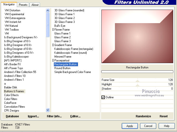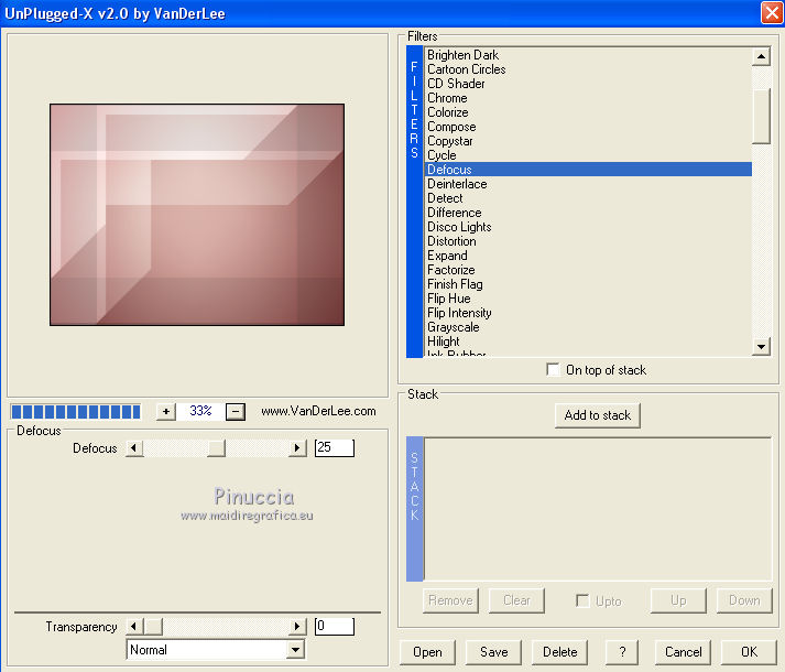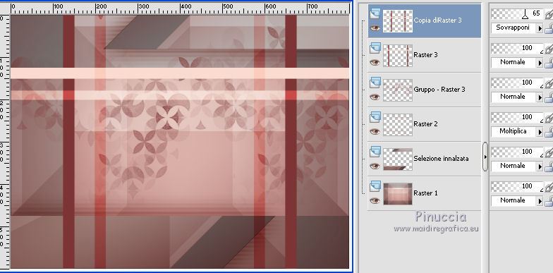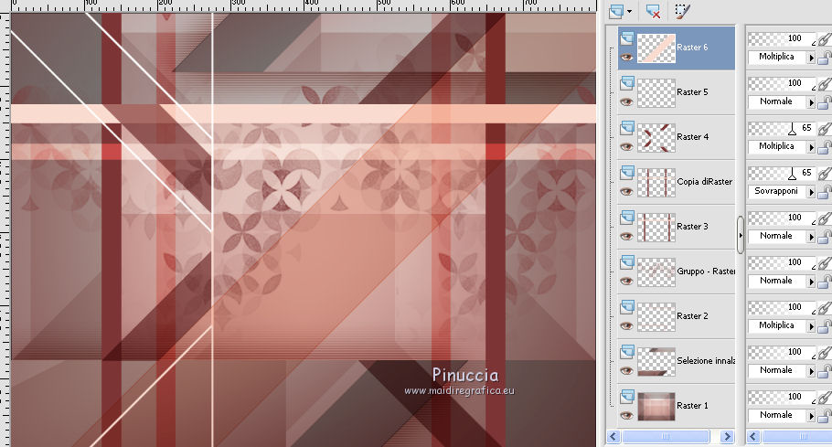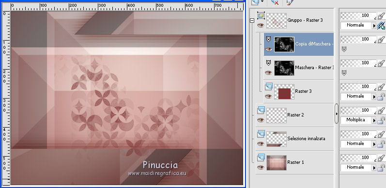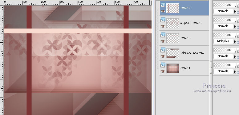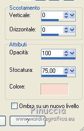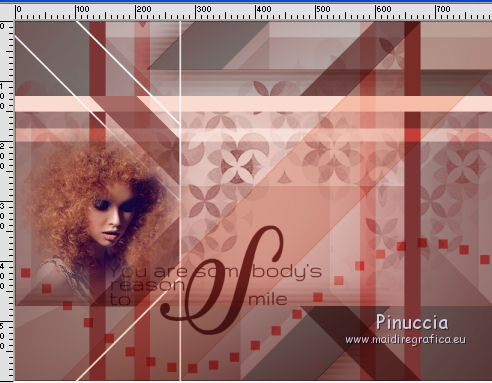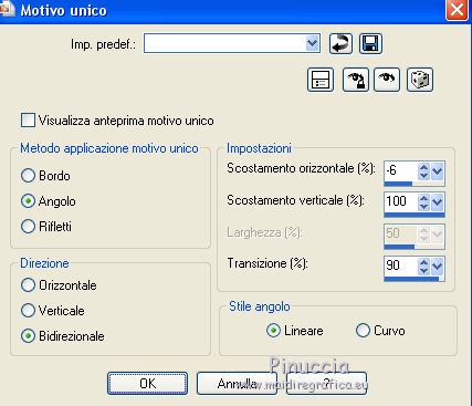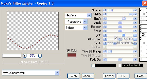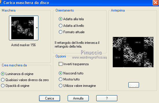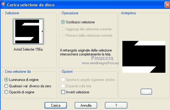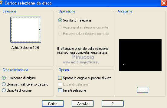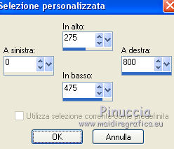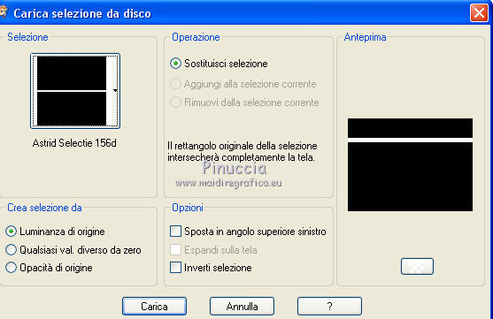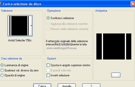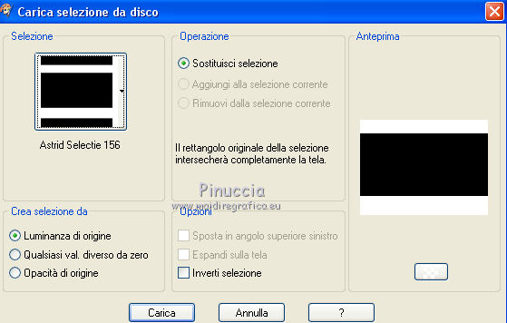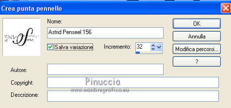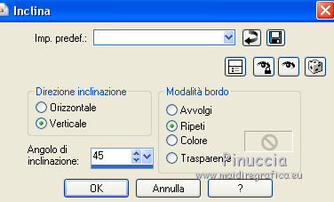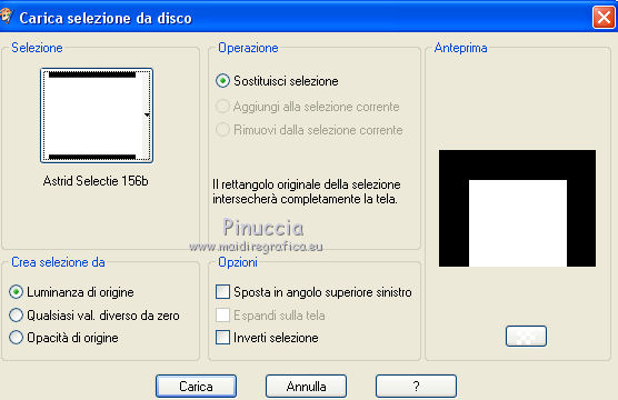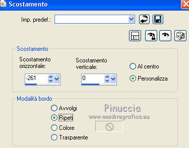 qui puoi trovare qualche risposta ai tuoi dubbi. Se l'argomento che ti interessa non è presente, ti prego di segnalarmelo. Questo tutorial è stato creato con PSPX8 e tradotto con PSPX, ma può essere eseguito anche con le altre versioni di PSP. Dalla versione X4, il comando Immagine>Rifletti è stato sostituito con Immagine>Capovolgi in orizzontale, e il comando Immagine>Capovolgi con Immagine>Capovolgi in verticale. Nelle versioni X5 e X6, le funzioni sono state migliorate rendendo disponibile il menu Oggetti. Con la versione X7 sono tornati i comandi Immagine>Rifletti e Immagine>Capovolgi, ma con nuove funzioni. Vedi la scheda sull'argomento qui Occorrente: Materiale qui Per il tube della donna grazie Maryse. (in questa pagina trovi i links ai loro siti). Filtri: consulta, se necessario, la mia sezione filtri qui Filters Unlimited 2.0 qui VanDerLee - Unplugged-X qui Mura's Meister - Copies qui Alien Skin Eye Candy 5 Impact - Perspective Shadow qui ![]() se stai usando altri colori, sei libero di sperimentare le modalità di miscelatura più adatte Nelle ultime versioni di PSP non ci sono tutti i gradienti delle versioni precedenti. Trovi i gradienti delle versioni precedenti qui Metti il preset Cliccando sul file una o due volte (a seconda delle tue impostazioni), automaticamente il preset si installerà nella cartella corretta. perchè uno o due clic vedi qui Se preferisci, puoi importare direttamente il preset nel corso del tutorial Come fare vedi la scheda del filtro Eye Candy qui Metti la maschera nella cartella Maschere. Metti le selezioni nella cartella Selezioni. 1. Scegli due colori dal tuo tube. Imposta il colore di primo piano con il colore chiaro, e il colore di sfondo con il colore scuro. Per il mio esempio ![]() Passa il colore di primo piano a Gradiente di primo piano/sfondo, stile Sprazzo di luce. ![]() Apri una nuova immagine trasparente 800 x 600 pixels, e riempila con il gradiente.2. Effetti>Plugins>Filters Unlimited 2.0 - Buttons & Frames - Rectangular Button. ![]() 3. Effetti>Plugins>VanDerLee - Unplugged-X - Defocus. ![]() 4. Livelli>Duplica. Immagine>Rifletti. Abbassa l'opacità di questo livello al 50%. 5. Livelli>Unisci>Unisci giù. 6. Sullo stesso livello. Selezione>Carica/Salva selezione>Carica selezione da disco. Cerca e carica la selezione "Astrid selectie 156". ![]() Selezione>Deseleziona. 8. Effetti>Effetti geometrici>Inclina. ![]() 9. Livelli>Nuovo livello raster. Selezione>Carica/Salva selezione>Carica selezione da disco. Cerca e carica la selezione "Astrid selectie 156a". ![]() 10. Effetti>Effetti 3D>Sfalsa ombra, colore di primo piano. ![]() Selezione>Deseleziona. 11. Effetti>Effetti di trama>Veneziana, colore di sfondo. ![]() Cambia la modalità di miscelatura di questo livello in Moltiplica. 12. Livelli>Nuovo livello raster. Selezione>Carica/Salva selezione>Carica selezione da disco. Cerca e carica la selezione "Astrid selectie 156b". ![]() Riempi la selezione con il colore di sfondo.Selezione>Deseleziona. 13. Sullo stesso livello. Livelli>Carica/Salva maschera>Carica maschera da disco. Cerca e carica la maschera "Astrid masker 156". ![]() Livelli>Duplica. ![]() Livelli>Unisci>Unisci gruppo. 14. Effetti>Effetti di immagine>Motivo unico. ![]() Immagine>Capovolgi. 15. Livelli>Nuovo livello raster. Selezione>Carica/Salva selezione>Carica selezione da disco. Cerca e carica la selezione "Astrid selectie 156c". ![]() Riempi la selezione con il colore di sfondo.Selezione>Deseleziona. 16. Livelli>Nuovo livello raster. Selezione>Carica/Salva selezione>Carica selezione da disco. Cerca e carica la selezione "Astrid selectie 156d". ![]() Riporta il colore di primo piano a Colore. Riempi la selezione con il colore di primo piano.Selezione>Deseleziona. 17. Livelli>Unisci>Unisci giù. ![]() 18. Livelli>Duplica. Effetti>Effetti di immagine>Stringi (nelle versioni più recenti è diventato Compressione) ![]() 19. Cambia la modalità di miscelatura di questo livello in Sovrapponi, e abbassa l'opacità al 65%. ![]() 20. Livelli>Nuovo livello raster. Selezione>Carica/Salva selezione>Carica selezione da disco. Cerca e carica la selezione "Astrid selectie 156e". ![]() Riempi la selezione con il colore di sfondo.Selezione>Deseleziona. Cambia la modalità di miscelatura di questo livello in Moltiplica, e abbassa l'opacità al 65%. 21. Apri "Astrid Deco 156" e vai a Modifica>Copia. Torna al tuo lavoro e vai a Modifica>Incolla come nuovo livello. 22. Effetti>Effetti di immagine>Scostamento. ![]() 23. Livelli>Nuovo livello raster. Attiva lo strumento Selezione ![]() (non importa il tipo di selezione impostato, perchè con la selezione personalizzata si ottiene sempre un rettangolo) clicca sull'icona Selezione personalizzata ![]() e imposta i seguenti settaggi. ![]() Riempi la selezione con il colore di primo piano.Selezione>Deseleziona. 24. Effetti>Effetti geometrici>Inclina. ![]() 25. Effetti>Effetti di bordo>Aumenta - 2 volte. Cambia la modalità di miscelatura di questo livello in Moltiplica. ![]() 26. Apri "Astrid penseel 156". File>Esporta>Pennello personalizzato, assegna un nome al pennello e ok. ![]() 27. Livelli>Nuovo livello raster. Attiva lo strumento Pennello ![]() cerca e seleziona il pennello che hai appena esportato ![]() Applica il pennello come nell'esempio, cliccando con il tasto destro del mouse, per usare il colore di sfondo. ![]() Cambia la modalità di miscelatura di questo livello in Moltiplica. ![]() 28. Livelli>Nuovo livello raster. Selezione>Carica/Salva selezione>Carica selezione da disco. Cerca e carica la selezione "Astrid selectie 156f". ![]() Riempi la selezione con il colore di sfondo.Selezione>Deseleziona. 29. Effetti>Plugins>Mura's Meister - Copies. ![]() Cambia la modalità di miscelatura di questo livello in Sovrapponi. 30. Apri il tube della donna e cancella il watermark. Attiva lo strumento Pennello Clonazione con i seguenti settaggi.![]() Clicca con il tasto destro del mouse sulla testa della donna ![]() 31. Minimizza il tube e torna al 