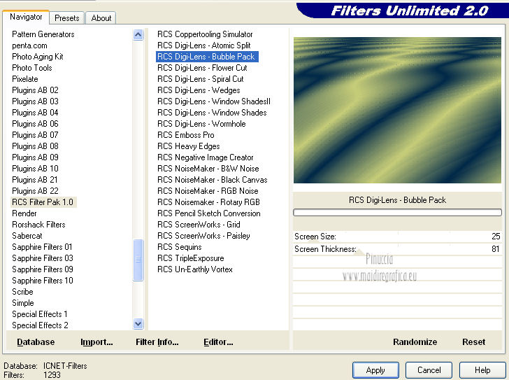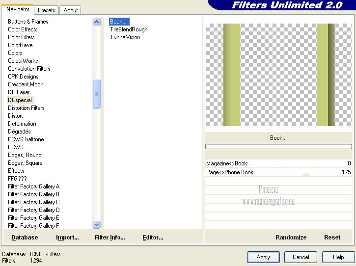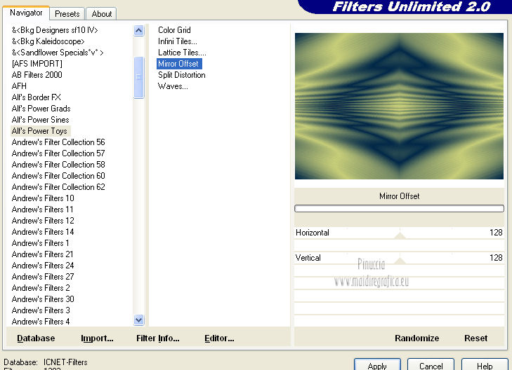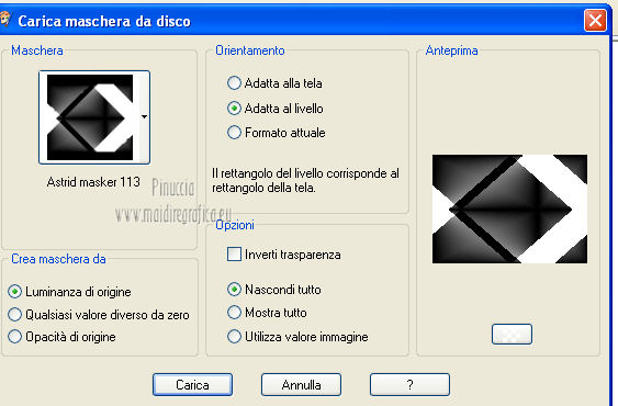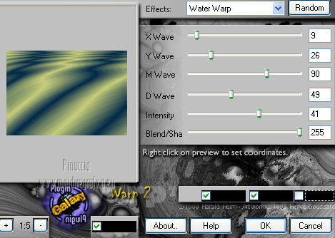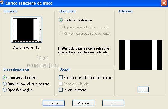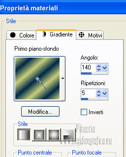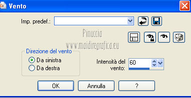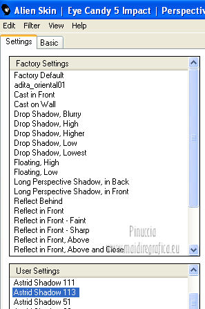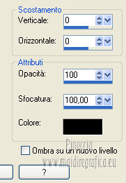 qui puoi trovare qualche risposta ai tuoi dubbi. Se l'argomento che ti interessa non è presente, ti prego di segnalarmelo. Per tradurre questo tutorial ho usato PSP X. Questo tutorial è una creazione di ©Araemae e non può essere copiato su altri siti nè essere offerto per il download. Lo stesso vale per la mia traduzione. Il materiale viene da vari gruppi di condivisione. Il copyright appartiene ai rispettivi autori. Grazie ai creatori dei tubes che mettono a disposizione il loro lavoro in vari gruppi di condivisione. Occorrente: Materiale qui Per il tube utilizzato grazie Mary Filtri: consulta, se necessario, la mia sezione filtri qui Plugin Galaxy - Warp 2 qui RCS Filter Pak 1.0 - RCS Digi-Lens - Bubble Pack qui Filters Unlimited 2.0 qui Alf's Power Toys - Mirror Offset qui Simple - Top Bottom Wrap (bonus) qui Alien Skin Eye Candy 5 Impact - Glass qui DCSpecial - Book qui I filtri RCS, Alf's e DC Special si possono usare da soli o importati in Filters Unlimited ![]() Metti il preset "Astrid_Shadow_113" nella cartella del filtro Alien Skin Eye Candy 5 Impact>Settings>Glass. Cliccando sul file una o due volte (a seconda delle tue impostazioni), automaticamente il preset si installerà nella cartella corretta. Metti la maschera nella cartella Maschere. Metti le selezioni nella cartella Selezioni. se stai usando altri colori, sei libero di sperimentare le modalità di miscelatura più adatte 1. Scegli due colori dal tuo tube, imposta il colore di primo piano con il colore chiaro, e il colore di sfondo con il colore scuro. I miei colori: ![]() Passa il colore di primo piano a Gradiente. ![]() Apri una nuova immagine trasparente 850 x 600 pixels, e riempila con il gradiente.2. Effetti>Plugins>Plugin Galaxy - Warp 2. ![]() 3. Effetti>Plugins>Filters Unlimited 2.0 - RCS Filter Pak 1.0 - RCS Digi-Lens - Bubble Pack. ![]() 4. Effetti>Effetti di bordo>Aumenta. 5. Effetti>Plugins>Filters Unlimited 2.0 - Alf's Power Toys - Mirror Offset. ![]() 6. Effetti>Plugins>Simple - Top Bottom Wrap. 7. Livelli>Nuovo livello raster. Selezione>Carica/Salva selezione>Carica selezione da disco. Cerca e carica la selezione "Astrid selectie 113". ![]() 8. Riempi la selezione con il colore di primo piano.Selezione>Deseleziona. 9. Effetti>Plugins>Filters Unlimited 2.0 - DCspecial - Book. ![]() 10. Livelli>Duplica. Immagine>Ruota per gradi - 90 gradi a destra. ![]() Livelli>Unisci>Unisci giù. 11. Effetti>Effetti di immagine>Motivo unico. ![]() Cambia la modalità di miscelatura di questo livello in Sovrapponi. 12. Livelli>Nuovo livello raster. Selezione>Carica/Salva selezione>Carica selezione da disco. Cerca e carica la selezione "Astrid selectie 113a". ![]() 13. Effetti>Effetti 3D>Sfalsa ombra. ![]() Selezione>Deseleziona. 14. Premi sulla tastiera il tasto D per attivare lo strumento Deformazione ![]() in modalità Scala, spingi il nodo centrale superiore in basso fino a 100 pixels, e il nodo centrale inferiore in alto fino a 500 pixels. ![]() Premi sulla tastiera il tasto M per deselezionare lo strumento. 15. Cambia la modalità di miscelatura di questo livello in Luminanza (esistente), e abbassa l'opacità al 60%. 16. Livelli>Nuovo livello raster. Riempi con il colore di primo piano.17. Livelli>Carica/Salva maschera>Carica maschera da disco. Cerca e carica la maschera Astrid masker 113. ![]() Livelli>Unisci>Unisci gruppo. 18. Cambia la modalità di miscelatura di questo livello in Sovrapponi, e abbassa l'opacità al 50%. Effetti>Effetti di bordo>Aumenta. 19. Livelli>Duplica. Cambia la modalità di miscelatura di questo livello in Moltiplica, e aumenta l'opacità all'80%. 20. Livelli>Nuovo livello raster. Selezione>Carica/Salva selezione>Carica selezione da disco. Cerca e carica la selezione "Astrid selectie 113b". ![]() 21. Riempi la selezione con il colore di sfondo.Selezione>Deseleziona. 22. Effetti>Effetti di distorsione>Vento - da sinistra, intensità 60. ![]() 23. Livelli>Duplica. Immagine>Capovolgi. Livelli>Unisci>Unisci giù. 24. Apri "Astrid penseel 113". File>Esporta>Pennello personalizzato, assegna un nome al pennello e ok. 25. Livelli>Nuovo livello raster. Attiva lo strumento Pennello ![]() cerca e seleziona il pennello che hai appena esportato ![]() 26. Applica il pennello in basso a destra, cliccando con il tasto destro del mouse per usare il colore di sfondo. ![]() 27. Livelli>Disponi>Sposta giù. Ripeti due volte. 28. Livelli>Unisci>Unisci visibile. Finestra>Duplica (o, sulla tastiera, maiuscola+D) per fare una copia. Minimizza il duplicato e torna al tuo lavoro originale. 29. Apri "Astrid tekst 113" e vai a Modifica>Copia. Torna al tuo lavoro e vai a Modifica>Incolla come nuovo livello. 30. Effetti>Effetti di immagine>Scostamento. ![]() Cambia la modalità di miscelatura di questo livello in Luce netta. 31. Apri il tube "Mary 0912-114" e vai a Modifica>Copia. Torna al tuo lavoro e vai a Modifica>Incolla come nuovo livello. 32. Immagine>Ridimensiona, al 65%, tutti i livelli non selezionato. Immagine>Rifletti. Sposta il tube un po' più a sinistra.33. Effetti>Plugins>Alien Skin EyeCandy5 Impact - Perspective Shadow. Selezione il preset "Astrid Shadow 113" e ok. ![]() 34. Livelli>Duplica. Sposta questo tube un po' più a destra.Livelli>Disponi>Sposta giù. Abbassa l'opacità di questo livello al 25%. 35. Immagine>Aggiungi bordatura, 2 pixels, simmetriche, con il colore di sfondo. Immagine>Aggiungi bordatura, 30 pixels, simmetriche, con il colore di primo piano. 36. Seleziona il bordo da 50 pixels con la bacchetta magica ![]() Attiva il duplicato che hai minimizzato al punto 28 e vai a Modifica>Copia. Torna al tuo lavoro e vai a Modifica>Incolla nella selezione. 37. Regola>Sfocatura>Sfocatura gaussiana - raggio 10. ![]() Selezione>Deseleziona. 39. Immagine>Aggiungi bordatura, 1 pixel, simmetriche, con il colore di sfondo. 40. Aggiungi il tuo nome e/o il tuo watermark su un nuovo livello. Livelli>Unisci>Unisci tutto e salva in formato jpg. Per questo esempio ho usato un tube di Guismo. ![]() ![]() S