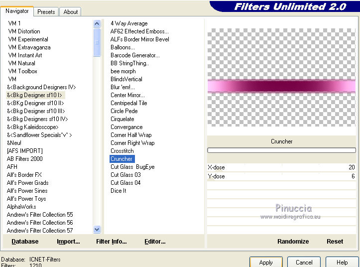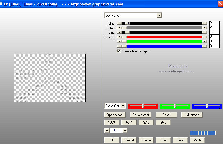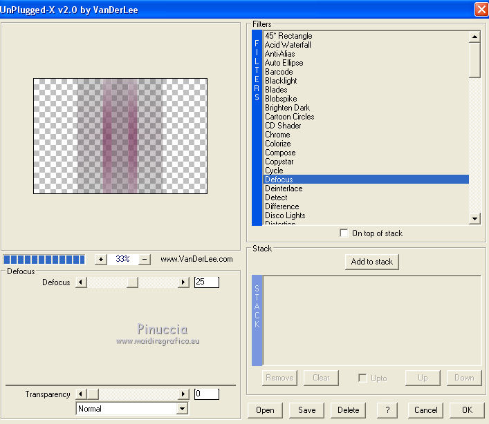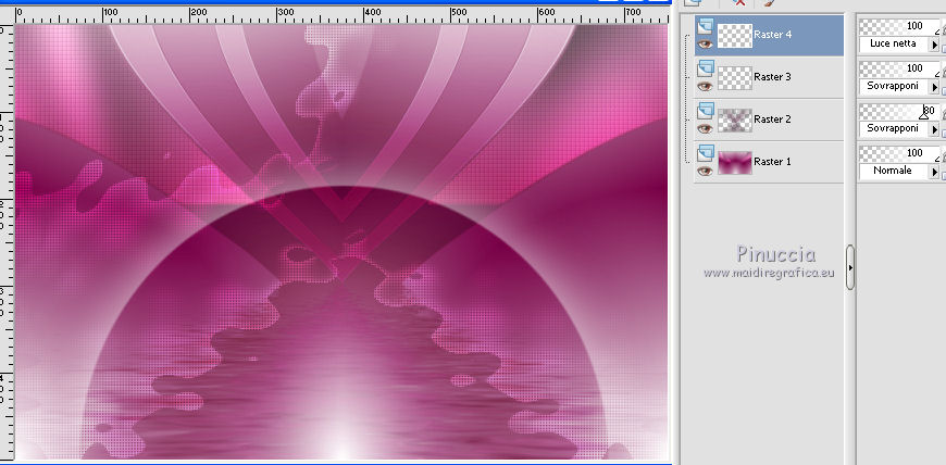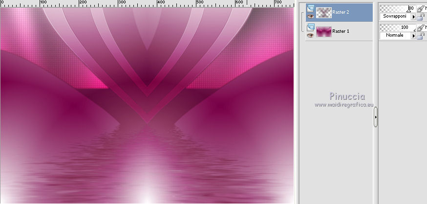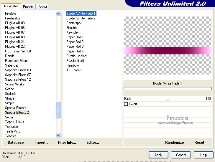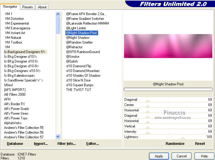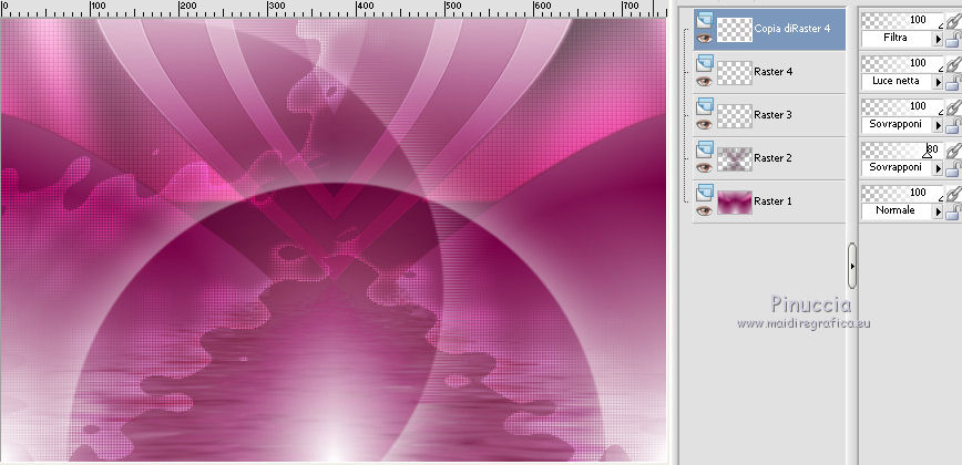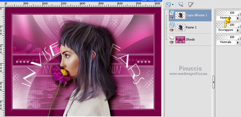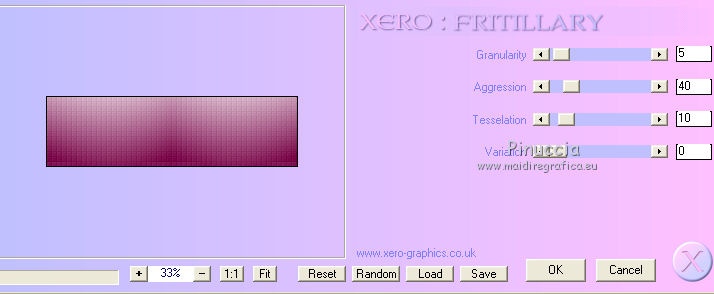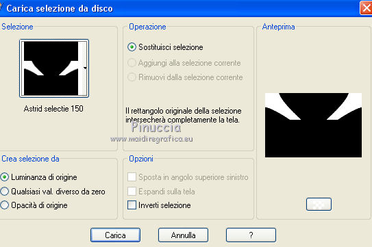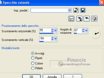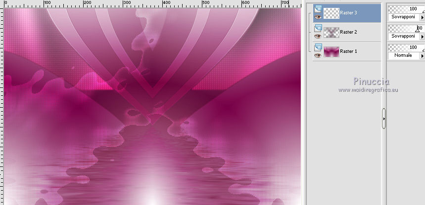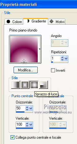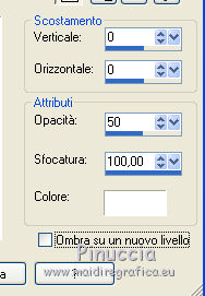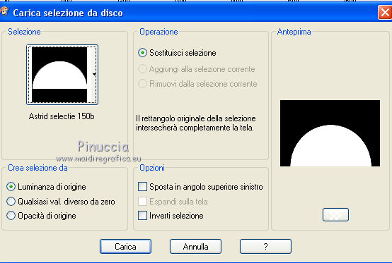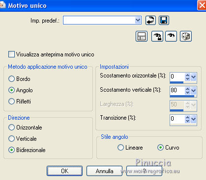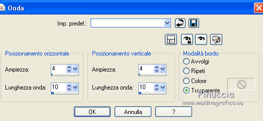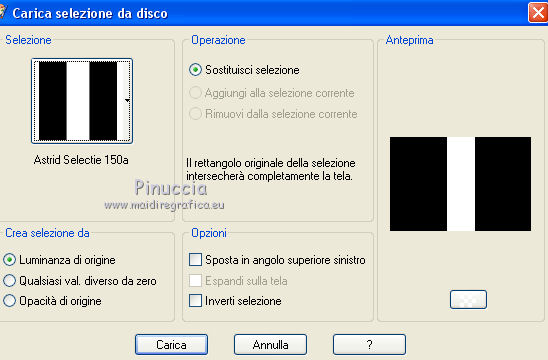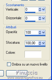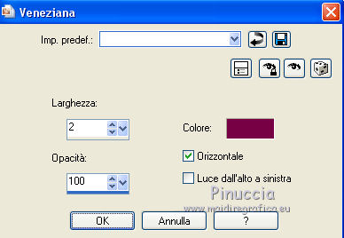 qui puoi trovare qualche risposta ai tuoi dubbi. Se l'argomento che ti interessa non è presente, ti prego di segnalarmelo. Questo tutorial è stato creato con PSPX5 e tradotto con PSPX, ma può essere eseguito anche con le altre versioni di PSP. Dalla versione X4, il comando Immagine>Rifletti è stato sostituito con Immagine>Capovolgi in orizzontale, e il comando Immagine>Capovolgi con Immagine>Capovolgi in verticale. Nelle versioni X5 e X6, le funzioni sono state migliorate rendendo disponibile il menu Oggetti. Con la versione X7 sono tornati i comandi Immagine>Rifletti e Immagine>Capovolgi, ma con nuove funzioni. Vedi la scheda sull'argomento qui Occorrente: Materiale qui Per il tube utilizzato grazie Annelies. Filtri: consulta, se necessario, la mia sezione filtri qui Filters Unlimited 2.0 qui &<Bkg Designer sf10I> - Cruncher (da importare in Unlimited) qui &<Background Designers IV> - @Nigh Shadow Pool (da importare in Unlimited) qui VanDerLee - Unplugged-X qui Xero - Fritillary qui Flaming Pear - Flood qui AP Lines - Lines SilverLining qui Alien Skin Eye Candy 5 Impact - Perspective Shadow qui ![]() se stai usando altri colori, sei libero di sperimentare le modalità di miscelatura più adatte Nelle ultime versioni di PSP non c'è il gradiente di primo piano/sfondo (Corel_06_029) Trovi i gradienti delle versioni precedenti qui Metti le selezioni nella cartella Selezioni. 1. Imposta il colore di primo piano con il colore bianco, e il colore di sfondo con un colore scelto dal tuo tube. I miei colori. ![]() Passa il colore di primo piano a Gradiente di primo piano/sfondo, stile Lineare. ![]() Apri una nuova immagine trasparente 750 x 500 pixels, e riempila con il gradiente.2. Effetti>Effetti di immagine>Motivo unico. ![]() 3. Sullo stesso livello: Selezione>Carica/Salva selezione>Carica selezione da disco. Cerca e carica la selezione "Astrid selectie 150". ![]() 4. Effetti>Plugins>Xero - Fritillary. ![]() Mantieni selezionato. 5. Effetti>Plugins>&<Background Designers IV> - @Night Shadow Pool. ![]() Selezione>Deseleziona. 6. Livelli>Nuovo livello raster. Selezione>Carica/Salva selezione>Carica selezione da disco. Cerca e carica la selezione "Astrid selectie 150a". ![]() Riempi la selezione con il gradiente.Selezione>Deseleziona. 7. Effetti>Plugins>VanDerLee - Unplugged X - Defocus. ![]() Effetti>Effetti di bordo>Aumenta. 8. Effetti>Effetti geometrici>Inclina. ![]() 9. Effetti>Effetti di distorsione>Stringi (nelle versioni più recenti è diventato Compressione). ![]() 10. Effetti>Effetti di riflesso>Specchio rotante, con i settaggi standard. ![]() 11. Effetti>Plugins>Flaming Pear - Flood. ![]() Cambia la modalità di miscelatura di questo livello in Sovrapponi, e abbassa l'opacità all'80%. ![]() 12. Livelli>Nuovo livello raster. Selezione>Carica/Salva selezione>Carica selezione da disco. Carica nuovamente la selezione "Astrid selectie 150a". ![]() 13. Effetti>Effetti 3D>Sfalsa ombra, colore di primo piano. ![]() Selezione>Deseleziona. 14. Effetti>Effetti di distorsione>Coordinate polari. ![]() 15. Effetti>Effetti di distorsione>Onda. ![]() 16. Effetti>Effetti di riflesso>Specchio rotante. ![]() 17. Effetti>Plugins>AP Lines - Lines SilverLining. ![]() Cambia la modalità di miscelatura di questo livello in Sovrapponi. ![]() 18. Livelli>Nuovo livello raster. Selezione>Carica/Salva selezione>Carica selezione da disco. Cerca e carica la selezione "Astrid selectie 150b". ![]() 19. Effetti>Effetti 3D>Sfalsa ombra, colore di primo piano. ![]() Selezione>Deseleziona. Cambia la modalità di miscelatura di questo livello in Luce netta. ![]() 20. Livelli>Duplica. Immagine>Ruota per gradi - 90 gradi a destra. ![]() 21. Effetti>Effetti di trama>Veneziana, colore di sfondo. ![]() Cambia la modalità di miscelatura di questo livello in Filtra. ![]() 22. Livelli>Nuovo livello raster. Selezione>Carica/Salva selezione>Carica selezione da disco. Cerca e carica la selezione "Astrid selectie 150c". ![]() 23. Riempi la selezione con il colore di sfondo.Selezione>Deseleziona. 24. Effetti>Plugins>Filters Unlimited 2.0 - Special Effects 2 - Border White Fade 1. ![]() 25. Effetti>Plugins>Filters Unlimited 2.0 - &<Bkg Designer sf10I> - Cruncher. ![]() 26. Regola>Messa a fuoco>Metti a fuoco - 2 volte. 27. Effetti>Effetti di immagine>Motivo unico. ![]() 28. Apri "Astrid penseel 150". File>Esporta>Pennello personalizzato, assegna un nome al pennello e ok. 29. Livelli>Nuovo livello raster. Attiva lo strumento Pennello ![]() cerca e seleziona il pennello che hai appena esportato ![]() 30. Riporta il colore di primo piano a Colore, e applica il pennllo come nell'esempio, cliccando con il tasto sinistro del mouse, per usare il colore di primo piano. ![]() 31. Livelli>Duplica. Immagine>Rifletti. 32. Apri "Astrid tekst 150". Attiva il livello "Tekst 150a", e vai a Modifica>Copia. Torna al tuo lavoro e vai a Modifica>Incolla come nuovo livello. Lascialo come sta. 33. Attiva nuovamente "Astrid tekst 150" e copia il livello "Tekst 150b". Torna al tuo lavoro e vai a Modifica>Incolla come nuovo livello. Spostalo un po' più in basso.![]() 34. Apri "Astrid deco 150" e vai a Modifica>Copia. Torna al tuo lavoro e vai a Modifica>Incolla come nuovo livello. Spostalo contro il bordo superiore.![]() Cambia la modalità di miscelatura di questo livello in Sovrapponi. 35. Immagine>Aggiungi bordatura, 1 pixel, simmetriche, colore di primo piano. Immagine>Aggiungi bordatura, 4 pixels, simmetriche, colore di sfondo. Immagine>Aggiungi bordatura, 1 pixel, simmetriche, colore di primo piano. Immagine>Aggiungi bordatura, 35 pixels, simmetriche, colore di sfondo. 36. Apri il tube "Alies 1-2VR274-woman-25052015" e vai a Modifica>Copia. Torna al tuo lavoro e vai a Modifica>Incolla come nuovo livello. Immagine>Ridimensiona, all'80%, tutti i livelli non selezionato. Spostalo in basso contro il bordo.37. Effetti>Plugins>Alien Skin Eye Candy 5 Impact - Perspective Shadow. Seleziona il preset Drop Shadow Blurry e ok. ![]() 38. Livelli>Duplica. Cam