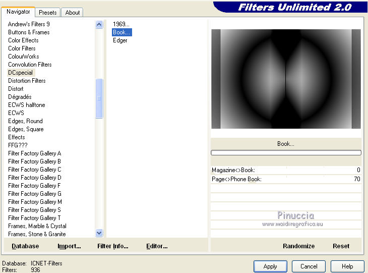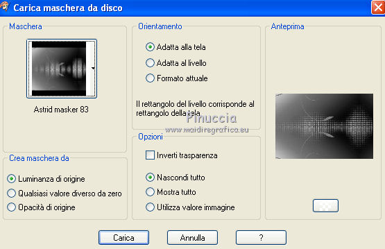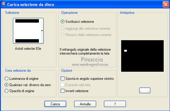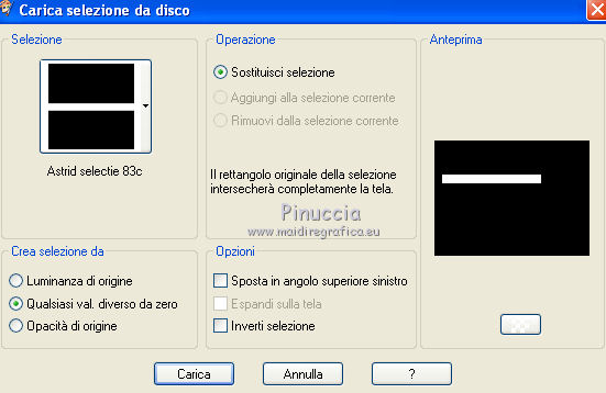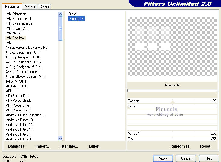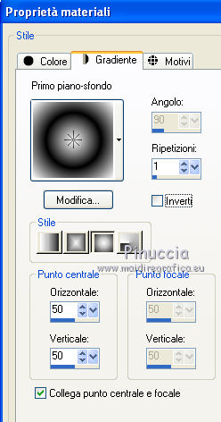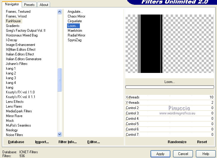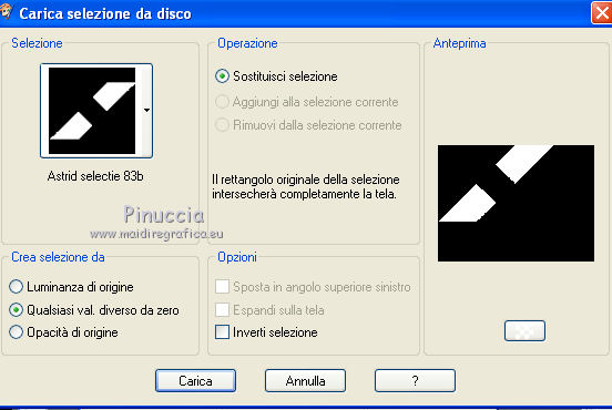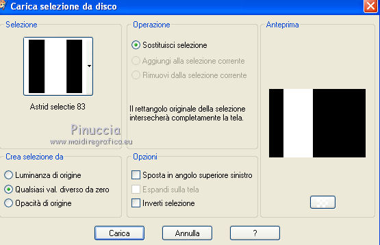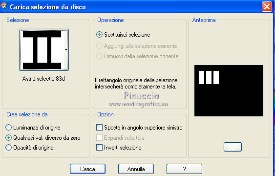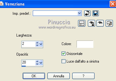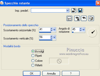 qui puoi trovare qualche risposta ai tuoi dubbi. Se l'argomento che ti interessa non è presente, ti prego di segnalarmelo. Per tradurre questo tutorial ho usato PSP X. Questo tutorial è una creazione di ©Araemae e non può essere copiato su altri siti nè essere offerto per il download. Lo stesso vale per la mia traduzione. Il materiale viene da vari gruppi di condivisione. Il copyright appartiene ai rispettivi autori. Grazie ai creatori dei tubes che mettono a disposizione il loro lavoro in vari gruppi di condivisione. Occorrente: Materiale qui Il tube della donna è di Joanie Filtri: consulta, se necessario, la mia sezione filtri qui Flaming Pear - Flexify 2 qui DC Special - Book qui Simple qui Alien Skin Eye Candy 5 Impact qui Filters Unlimited 2.0 qui VM Toolbox - MirrorrorriM qui Funhouse - Loom (nello zip). i filtri DC Special, Simple, VM Toolbox e Funhouse si possono usare da soli e anche importandoli in Filters Unlimited ![]() Metti le selezioni nella cartella Selezioni. Metti le maschere nella cartella Maschere. se stai usando altri colori, sei libero di sperimentare le modalità di miscelatura più adatte Imposta il colore di primo piano con il colore bianco, e il colore di sfondo con un colore scuro. ![]() Passa il colore di primo piano a Gradiente. ![]() 1. Apri una nuova immagine trasparente 750 x 500 pixels, e riempila con il gradiente.2. Effetti>Plugins>Filters Unlimited 2.0 - DC Special - Book. ![]() 3. Effetti>Effetti di riflesso>Specchio rotante. ![]() 4. Livelli>Duplica. Immagine>Rifletti. Immagine>Capovolgi. Abbassa l'opacità di questo livello al 50%. Livelli>Unisci>Unisci giù. 5. Effetti>Plugins>Simple - Pizza Slice Mirror. Effetti>Plugins>Simple - 4Way Average. 6. Livelli>Nuovo livello raster. Selezione>Carica/Salva selezione>Carica selezione da disco. Cerca e carica la selezione "Astrid selectie 83". ![]() Riempi la selezione con il colore di sfondo.Selezione>Deseleziona. 7. Effetti>Plugins>Filters Unlimited 2.0 - Funhouse - Loom. ![]() 8. Livelli>Nuovo livello raster. Selezione>Carica/Salva selezione>Carica selezione da disco. Cerca e carica la selezione "Astrid selectie 83a". ![]() Riempi la selezione con il colore di sfondo.Selezione>Deseleziona. 9. Livelli>Nuovo livello raster. Selezione>Carica/Salva selezione>Carica selezione da disco. Cerca e carica la selezione "Astrid selectie 83b". ![]() Riempi la selezione con il colore bianco.Abbassa l'opacità di questo livello al 20%. Selezione>Deseleziona. 10. Livelli>Nuovo livello raster. Riempi il livello con il colore bianco.11. Livelli>Carica/Salva maschera>Carica maschera da disco. Cerca e carica la maschera "astrid masker 83". ![]() Livelli>Unisci>Unisci gruppo. Effetti>Effetti di bordo>Aumenta. 12. Livelli>Nuovo livello raster. Riempi il livello con il colore di sfondo.13. Livelli>Carica/Salva maschera>Carica maschera da disco. Cerca e carica la maschera"Astrid masker 83a". ![]() Livelli>Unisci>Unisci gruppo. Abbassa l'opacità di questo livello al 50%. 14. Livelli>Nuovo livello raster. Selezione>Carica/Salva selezione>Carica selezione da disco. Cerca e carica la selezione "Astrid selectie 83c". ![]() Riempi la selezione con il colore di sfondo.Selezione>Deseleziona. 15. Effetti>Effetti di trama>Veneziana. ![]() 16. Livelli>Nuovo livello raster. Selezione>Carica/Salva selezione>Carica selezione da disco. Cerca e carica la selezione "Astrid selectie 83d". ![]() Riempi la selezione con il colore bianco.Selezione>Deseleziona. 17. Effetti>Plugins>Filters Unlimited 2.0 - VM Toolbox - MirrororriM. ![]() 18. Livelli>Duplica. Immagine>Rifletti. Immagine>Capovolgi. 19. Effetti>Effetti di immagine>Scostamento. ![]() 20. Effetti>Plugins>Simple - Zoom out and flip. 21. Apri "Astrid tekst 83" e vai a Modifica>Copia. Torna al tuo lavoro e vai a Modifica>Incolla come nuovo livello. Spostalo a sinistra come nel mio esempio.22. Apri "Astrid tekst 83a" e vai a Modifica>Copia. Torna al tuo lavoro e vai a Modifica>Incolla come nuovo livello. Spostalo in alto a destra come nel mio esempio.Abbassa l'opacità di questo livello al 40%. 23. Livelli>Nuovo livello raster. Selezione>Carica/Salva selezione>Carica selezione da disco. Cerca e carica la selezione "Astrid selectie 83e". ![]() Riempi la selezione con il colore di sfondo.Selezione>Modifica>Contrai - 1 pixel. 24. Apri il tube "Joanie_Woman_26_02_2012" e vai a Modifica>Copia. Torna al tuo lavoro e vai a Modifica>Incolla come nuovo livello. Immagine>Ridimensiona, all'80%, tutti i livelli non selezionato. Sposta il tube nell'area selezionata,in modo che siano visibili gli occhi. ![]() Selezione>Inverti. Premi sulla tastiera il tasto CANC. Selezione>Deseleziona. Livelli>Unisci>Unisci giù. 25. Livelli>Duplica, e spostalo nel quadrato al centro.26. Livelli>Duplica, e spostalo nel quadrato a destra.27. Modifica>Incolla come nuovo livello (il tube Joanie Woman 26_02_2012 è ancora in memoria). Immagine>Ridimensiona, all'80%, tutti i livelli non selezionato. Spostalo un po' più a destra, sul bordo inferiore.28. Effetti>Plugins>Alien Skin Eye Candy 5 Impact - Perspective Shadow. Seleziona Drop Shadow,Blurry e ok. ![]() 29. Immagine>Aggiungi bordatura, 2 pixels, simmetriche, con il colore di sfondo. Immagine>Aggiungi bordatura, 35, pixels, simmetriche, con il colore bianco. Immagine>Aggiungi bordatura, 2 pixels, simmetriche, con il colore di sfondo. 30. Aggiungi il tuo nome e/o il tuo watermark su un nuovo livello. 31. Livelli>Unisci>Unisci tutto e salva in formato jpg. Per questo esempio ho usato un tube di Guismo. ![]() ![]() Se hai problemi o dubbi, o trovi un link non funzionante, o anche soltanto per un saluto, scrivimi. 1 Aprile 2012 |