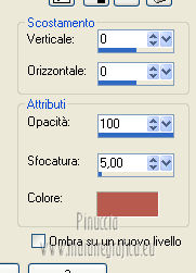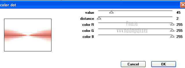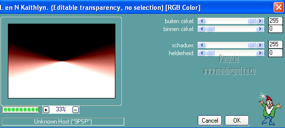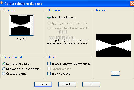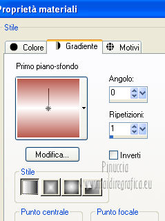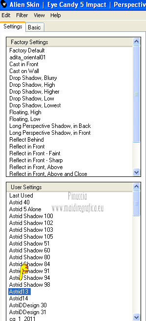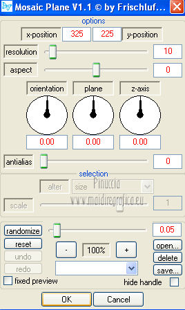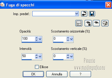qui puoi trovare qualche risposta ai tuoi dubbi. Se l'argomento che ti interessa non è presente, ti prego di segnalarmelo. Per tradurre questo tutorial ho usato PSP X. Questo tutorial è una creazione di ©Araemae e non può essere copiato su altri siti nè essere offerto per il download. Lo stesso vale per la mia traduzione. Il materiale viene da vari gruppi di condivisione. Il copyright appartiene ai rispettivi autori. Grazie ai creatori dei tubes che mettono a disposizione il loro lavoro in vari gruppi di condivisione. Occorrente: Materiale qui Per il tube grazie Fredi Filtri: consulta, se necessario, la mia sezione filtri qui L&K - L&K Kaithlyn qui Alien Skin Eye Candy 5 Impact qui Simple - Top left Mirror qui Frischluft - Mosaic Plane qui Balder Olrik - Select Sharp qui Penta.com - Color dot qui ![]() se stai usando altri colori, sei libero di sperimentare le modalità di miscelatura più adatte Metti il preset "Astrid13" nella cartella del filtro Alien Skin Eye Candy 5 Impact>Settings>Shadow. Cliccando sul file, il preset sarà automaticamente installato nella cartella corretta. Metti la selezione nella cartella Selezioni. 1. Scegli un colore scuro dal tuo tube e impostalo come colore di primo piano. Imposta il colore di sfondo con il colore bianco. ![]() Apri una nuova immagine trasparente 650 x 450 pixels, e riempila con il colore di primo piano.2. Effetti>Plugins>L&K LandKsiteofwonders - L&K Kaithlyn. ![]() Immagine>Capovolgi. 3. Effetti>Plugins>Simple - Top Left Mirror. 4. Effetti>Plugins>Frischluft - Mosaic Plane. ![]() Effetti>Effetti di bordo>Aumenta. 5. Livelli>Duplica. Effetti>Effetti di distorsione>Coordinate polari. ![]() Cambia la modalità di miscelatura di questo livello in Moltiplica, e abbassa l'opacità al 45%. 6. Livelli>Nuovo livello raster. Selezione>Carica/Salva selezione>Carica selezione da disco. Cerca e carica la selezione selectie "Astrid13". ![]() Riempi la selezione con il colore di primo piano.Selezione>Deseleziona. 7. Immagine>Ruota per gradi - 90 gradi a destra. ![]() Immagine>Ridimensiona, all'80%, tutti i livelli non selezionato. 8. Effetti>Plugins>Balder Olrik - Select Sharp. ![]() Livelli>Duplica - 2 volte. Attiva il livello originale Raster 2. ![]() Effetti>Effetti di distorsione>Vento - da sinistra, intensità 100. ![]() Attiva il livello della prima copia di Raster 2. Effetti>Effetti di distorsione>Vento - da destra, intensità 100. ![]() 9. Attiva il livello superiore. Livelli>Nuovo livello raster. Attiva lo strumento Selezione ,clicca sull'icona Selezione personalizzata ![]() e imposta i seguenti settaggi: ![]() Riempi con il colore di primo piano.Selezione>Modifica>Contrai - 1 pixel. Premi sulla tastiera il tasto CANC. 10. Passa il colore di primo piano a Gradiente. ![]() Riempi la selezione con il gradiente.Selezione>Deseleziona. 11. Effetti>Effetti di riflesso>Fuga di specchi. ![]() Attiva lo strumento Gomma ![]() e cancella gli ultimi due rettangoli. ![]() Dovresti avere questo. ![]() Livelli>Duplica. Immagine>Rifletti. Livelli>Unisci>Unisci giù. 12. Apri il tube "chinese" e vai a Modifica>Copia. Torna al tuo lavoro e vai a Modifica>Incolla come nuovo livello. Immagine>Ridimensiona, 2 volte all'80%, tutti i livelli non selezionato. Regola>Messa a fuoco>Metti a fuoco. Sposta il tube a destra.13. Effetti>Plugins>Alien Skin Eye Candy 5 Impact - Perspective Shadow. Seleziona il preset Astrid13 e ok. ![]() se stai usando altri colori, imposta il tuo colore sotto Basic 14. Livelli>Duplica. Immagine>Rifletti. 15. Attiva il livello Raster 1. Effetti>Plugins>Penta.com - Color dot. ![]() 16. Attiva il livello superiore. Apri il tube "Astrid Twins" e vai a Modifica>Copia. Torna al tuo lavoro e vai a Modifica>Incolla come nuovo livello. Sposta il testo in basso come nel mio esempio.Effetti>Plugins>Alien Skin Eye Candy 5 Impact - Perspective Shadow, come al punto 13. 17. Immagine>Aggiungi bordatura, 10 pixels, simmetriche, con il colore nero. Seleziona questo bordo con la bacchetta magica ![]() e riempilo con il colore bianco.Effetti>Effetti 3D>Sfalsa ombra, con il colore di primo piano. ![]() Selezione>Deseleziona. Immagine>Aggiungi bordatura, 35 pixels, simmetriche, con il colore nero. Seleziona questo bordo con la bacchetta magica ![]() e riempilo con il gradiente.![]() Selezione>Deseleziona. 18. Aggiungi il tuo nome e/o il tuo watermark su un nuovo livello. Livelli>Unisci>Unisci tutto e salva in formato jpg. ![]() Se hai problemi o dubbi, o trovi un link non funzionante, o anche soltanto per un saluto, scrivimi. 10 Agosto 2012 |