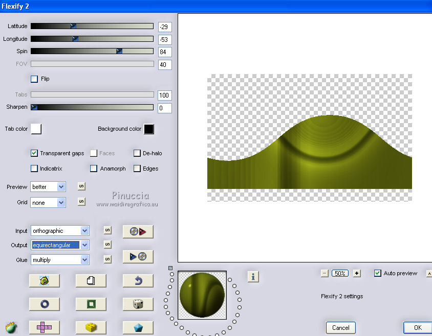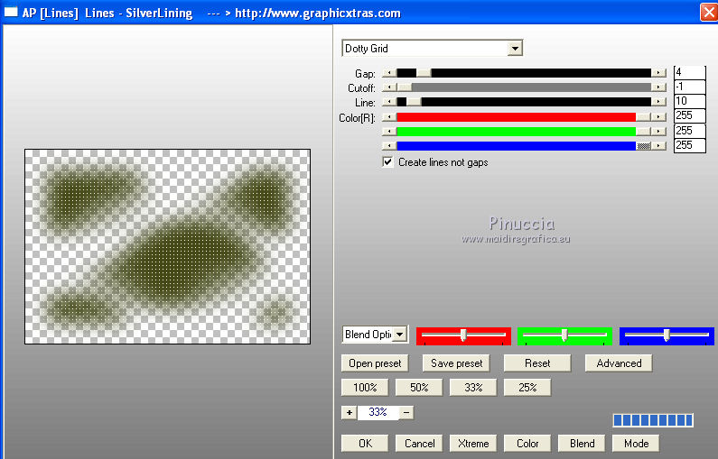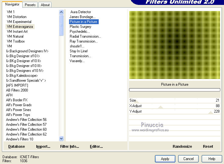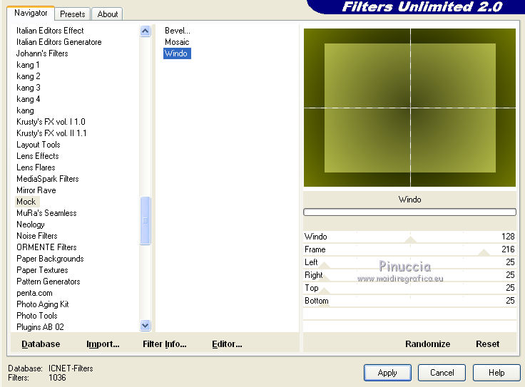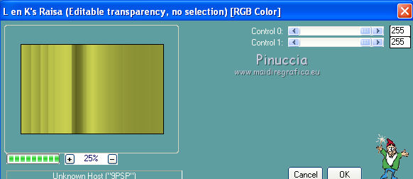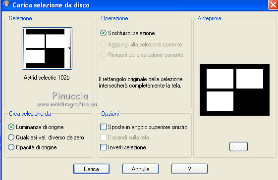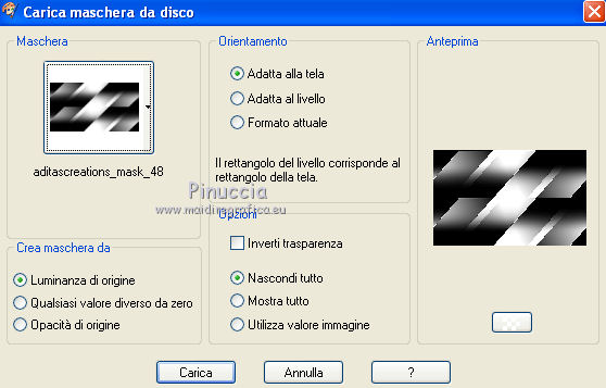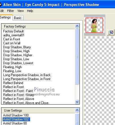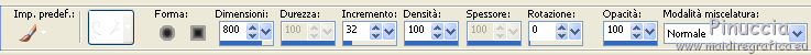 qui puoi trovare qualche risposta ai tuoi dubbi. Se l'argomento che ti interessa non è presente, ti prego di segnalarmelo. Per tradurre questo tutorial ho usato PSP X. Questo tutorial è una creazione di ©Araemae e non può essere copiato su altri siti nè essere offerto per il download. Lo stesso vale per la mia traduzione. Il materiale viene da vari gruppi di condivisione. Il copyright appartiene ai rispettivi autori. Grazie ai creatori dei tubes che mettono a disposizione il loro lavoro in vari gruppi di condivisione. Occorrente: Materiale qui Il tube della donna è di Colacao La maschera aditascreations_mask_48 è di Adita. Filtri: consulta, se necessario, la mia sezione filtri qui Filters Unlimited 2.0 qui L&K landksiteofwonders - L&K's Raisa qui Flaming Pear - Flexify 2 qui AP Lines - SilverLining qui VM Extravaganza - Picture in a picture qui Simple - Pizza Slice Mirror qui Mock - Window qui Alien Skin Eye Candy 5 Impact - Perspective Shadow qui ![]() Metti il preset nella cartella del filtro Alien Skin Eye Candy 5 Impact>Settings>Shadow. Con un doppio clic sul file, il preset sarà automaticamente installata nella cartella corretta. Metti le maschere nella cartella Maschere. Metti le selezioni nella cartella Selezioni. se stai usando altri colori, sei libero di sperimentare le modalità di miscelatura più adatte 1. Scegli due colori dal tuo tube. Imposta il colore di primo piano con il colore chiaro, e il colore di sfondo con il colore scuro. I miei colori: ![]() Passa il colore di primo piano a Gradiente, stile Sprazzo di luce, con i seguenti settaggi. ![]() Apri una nuova immagine trasparente 800 x 500 pixels, e riempila con il gradiente.2. Livelli>Duplica. Effetti>Plugins>L&K landksiteofwonders - L&K Raisa. ![]() 3. Effetti>Plugins>Flaming Pear - Flexify 2. ![]() 4. Effetti>Effetti di bordo>Aumenta. 5. Effetti>Effetti di immagine>Motivo unico. ![]() 6. Effetti>Effetti 3D>Sfalsa ombra, con il colore di sfondo, ombra su nuovo livello selezionato. ![]() Rimani posizionato sul livello dell'ombra. 7. Effetti>Plugins>AP Lines - SilverLining - Dotty Grid. ![]() Immagine>Capovolgi. Dovresti avere questo. ![]() 8. Attiva il livello superiore. Livelli>Nuovo livello raster. Riempi con il colore di sfondo.9. Livelli>Carica/Salva maschera>Carica maschera da disco. Cerca e carica la maschera "aditascreations_mask_48". ![]() Livelli>Unisci>Unisci gruppo. Cambia la modalità di miscelatura di questo livello in Dissolvi. 10. Livelli>Nuovo livello raster. Selezione>Carica/Salva selezione>Carica selezione da disco. Cerca e carica la selezione "Astrid selectie 102". ![]() 11. Riempi la selezione con il colore di sfondo.Selezione>Deseleziona. Effetti>Effetti di bordo>Aumenta. 12. Effetti>Plugins>Simple - Pizza Slice Mirror. Livelli>Disponi>Sposta giù. 13. Attiva il livello superiore. Livelli>Nuovo livello raster. Riempi con il colore di primo piano.14. Livelli>Carica/Salva maschera>Carica maschera da disco. Cerca e carica la maschera "Astrid masker 102". ![]() Livelli>Unisci>Unisci gruppo. 15. Apri "Astrid penseel 102". File>Esporta>Pennello personalizzato, assegna un nome al pennello e ok. 16. Livelli>Nuovo livello raster. Attiva lo strumento Pennello , cerca e seleziona il pennello che hai appena esportato ![]() e applica al centro cliccando con il tasto sinistro del mouse, per usare il colore di primo piano. Se il tuo PSP non supporta pennelli superiori a 500 pixels, prima di esportarlo dovrai ridimensionarlo a 500 pixels. Dopo averlo applicato, premi il tasto D (valido per tutte le versioni) per attivare lo strumento Deformazione ![]() e usa i nodi dello strumento per allargare il pennello come nell'esempio. ![]() 17. Livelli>Unisci>Unisci visibile, e metti da parte il lavoro per il momento. 18. Apri una nuova immagine trasparente 800 x 600 pixels, e riempila con il gradiente del punto 1.19. Effetti>Plugins>Filters Unlimited 2.0 - VM Extravaganza - Picture in a Picture. ![]() 20. Livelli>Nuovo livello raster. Riempi ancora con il gradiente del punto 1.21. Effetti>Plugins>Filters Unlimited 2.0 - Mock - Window. ![]() 22. Selezione>Carica/Salva selezione>Carica selezione da disco. Cerca e carica la selezione "Astrid selectie 102a". ![]() Premi sulla tastiera il tasto CANC. Selezione>Deseleziona. 23. Effetti>Effetti di immagine>Motivo unico. ![]() Effetti>Effetti di bordo>Aumenta. 24. Livelli>Nuovo livello raster. Selezione>Carica/Salva selezione>Carica selezione da disco. Carica nuovamente la selezione "Astrid selectie 102b". ![]() 25. Attiva il primo lavoro che hai minimizzato al punto 17 e vai a Modifica>Copia. Torna al secondo lavoro e vai a Modifica>Incolla nella selezione. Selezione>Deseleziona. 26. Effetti>Effetti 3D>Sfalsa ombra, con il colore nero ombra su nuovo livello non selezionato. ![]() 27. Apri "Astrid Deco 102" e vai a Modifica>Copia. Torna al tuo lavoro e vai a Modifica>Incolla come nuovo livello. Cambia la modalità di miscelatura di questo livello in Sovrapponi. 28. Apri "Astrid tekst 102" e vai a Modifica>Copia. Torna al tuo lavoro e vai a Modifica>Incolla come nuovo livello. Spostalo in basso a destra, come nel mio esempio.29. Apri il tube "colacao_jennifer-connelly" e vai a Modifica>Copia. Torna al tuo lavoro e vai a Modifica>Incolla come nuovo livello. Immagine>Ridimensiona, al 55%, tutti i livelli non selezionato. Immagine>Rifletti. Spostalo sul bordo inferiore.30. Effetti>Plugins>Alien Skin Eye Candy5 Impact - Perspective Shadow. Seleziona il preset Astrid Shadow 102 e ok. ![]() 31. Livelli>Unisci>Unisci tutto. Immagine>Aggiungi bordatura, 1 pixels, simmetriche, con il colore di sfondo. 32. Aggiungi il tuo nome e/o il tuo watermark su un nuovo livello. Livelli>Unisci>Unisci tutto e salva in formato jpg. Per questo esempio ho usato tubes di Thafs. ![]() Mary ![]() ![]() Se hai problemi o dubbi, o trovi un link non funzionante, o anche soltanto per un saluto, scrivimi. 13 Luglio 2012 |