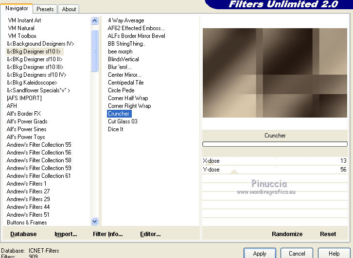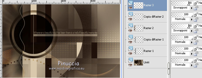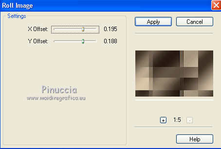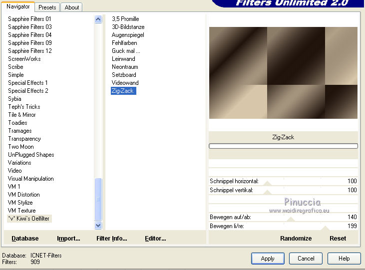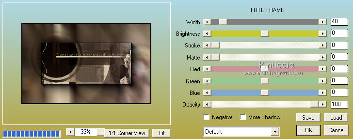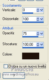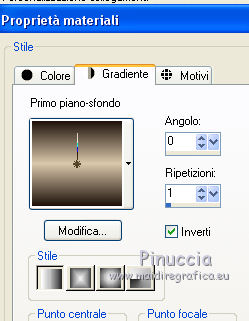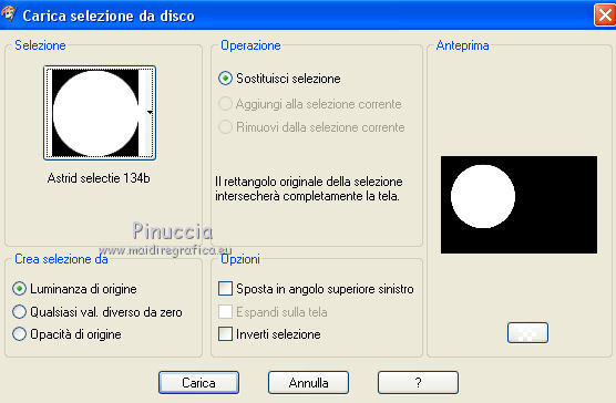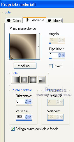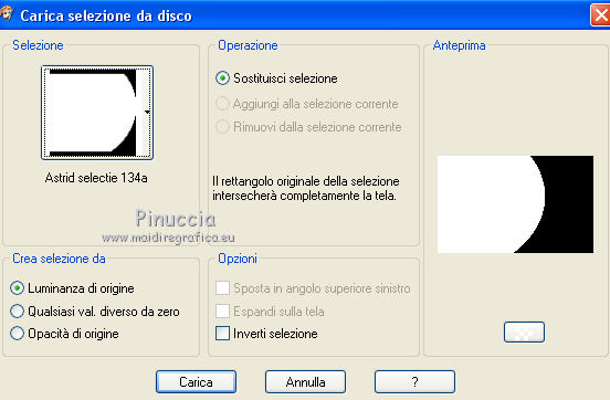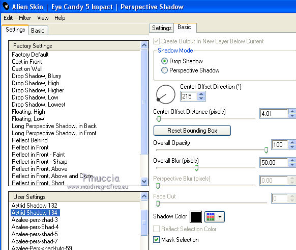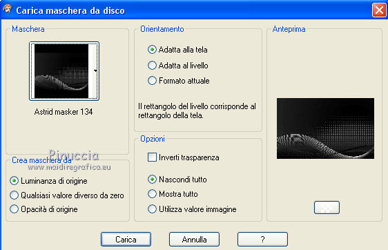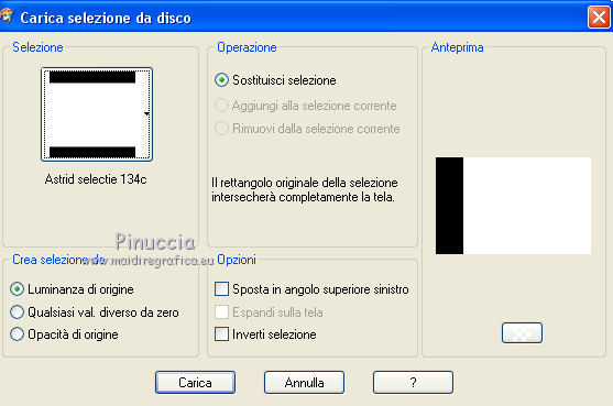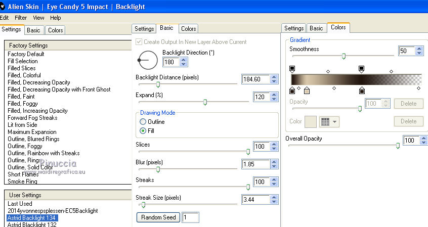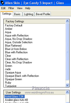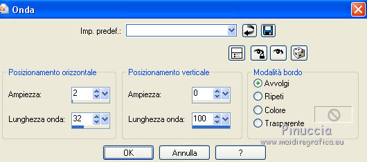 qui puoi trovare qualche risposta ai tuoi dubbi. Se l'argomento che ti interessa non è presente, ti prego di segnalarmelo. Per tradurre questo tutorial ho usato PSP X. Questo tutorial è una creazione di ©Araemae e non può essere copiato su altri siti nè essere offerto per il download. Lo stesso vale per la mia traduzione. Il materiale viene da vari gruppi di condivisione. Il copyright appartiene ai rispettivi autori. Grazie ai creatori dei tubes che mettono a disposizione il loro lavoro in vari gruppi di condivisione. Occorrente: Materiale qui Il tube utilizzato è di K@arine Filtri: consulta, se necessario, la mia sezione filtri qui Filters Unlimited 2.0 qui &<Bkg Designer sf10I> - Cruncher (da importare in Unlimited) qui °V° Kiwi Oelfilter - Zig Zach qui FM Tile Tools - Roll image qui Alien Skin Eye Candy 5 Impact - Perspective Shadow, Glass, Backlight qui AAA Frames - Foto Frame qui I filtri Kiwi si possono usare da soli o importati in Filters Unlimited. (come fare vedi qui). Se un filtro fornito appare con questa icona ![]() Metti i preset Cliccando sul file una o due volte (a seconda delle tue impostazioni), automaticamente il preset si installerà nella cartella corretta. perchè uno o due clic vedi qui Metti la maschera nella cartella Maschere. Metti le selezioni nella cartella Selezioni. se stai usando altri colori, sei libero di sperimentare le modalità di miscelatura più adatte 1. Scegli due colori dal tuo tube. Imposta il colore di primo piano con il colore chiaro, e il colore di sfondo con il colore scuro. I miei colori ![]() Passa il colore di sfondo a Gradiente, stile Sprazzo di luce. ![]() Apri una nuova immagine trasparente 800 x 500 pixels, e riempila con il gradiente.2. Effetti>Plugins>Filters Unlimited 2.0 - °v° Kiwi's Oelfilter - Zig-zack. ![]() 3. Effetti>Plugins>Filters Unlimited 2.0 - &<Bkg Designer sf10I> - Cruncher. ![]() Effetti>Effetti di bordo>Aumenta. 4. Livelli>Duplica. Effetti>Plugins>FM Tile Tools - Roll image. se hai problemi a usare i cursori per impostare i settaggi, puoi usare le frecce della tastiera ![]() Abbassa l'opacità di questo livello al 30%. ![]() 5. Livelli>Nuovo livello raster. Riporta il colore di primo piano a Colore, e riempi il livello con il colore di primo piano.6. Livelli>Carica/Salva maschera>Carica maschera da disco. Cerca e carica la maschera "Astrid masker 134". ![]() Livelli>Duplica. ![]() Livelli>Unisci>Unisci gruppo. Cambia la modalità di miscelatura di questo livello in Sovrapponi. ![]() 7. Livelli>Nuovo livello raster. Selezione>Carica/Salva selezione>Carica selezione da disco. Cerca e carica la selezione "Astrid selectie 134". ![]() Riempi la selezione con il colore di sfondo.Selezione>Deseleziona. 8. Effetti>Effetti 3D>Sfalsa ombra, con il colore di primo piano. ![]() 9. Livelli>Nuovo livello raster. Selezione>Carica/Salva selezione>Carica selezione da disco. Cerca e carica la selezione "Astrid selectie 134a". ![]() 10. Effetti>Effetti 3D>Sfalsa ombra, con il colore di sfondo. ![]() Selezione>Deseleziona. 11. Regola>Aggiungi/Rimuovi disturbo>Aggiungi disturbo. ![]() 12. Livelli>Nuovo livello raster. Selezione>Carica/Salva selezione>Carica selezione da disco. Cerca e carica la selezione "Astrid selectie 134b". ![]() Riporta il colore di primo piano al gradiente iniziale ![]() Riempi la selezione con il gradiente.13. Selezione>Modifica>Contrai - 15 pixels. Premi sulla tastiera il tasto CANC ![]() 14. Selezione>Modifica>Contrai - 15 pixels. Riempi la selezione con il colore di sfondo.Selezione>Deseleziona. Cambia la modalità di miscelatura di questo livello in Moltiplica. ![]() 15. Apri "Astrid Deco 134" e vai a Modifica>Copia. Torna al tuo lavoro e vai a Modifica>Incolla come nuovo livello. 16. Effetti>Effetti di immagine>Scostamento. ![]() 17. Apri "Astrid Tekst 134" e vai a Modifica>Copia. Torna al tuo lavoro e vai a Modifica>Incolla come nuovo livello. Sposta il testo sopra l'elemento precedente.![]() Abbassa l'opacità di questo livello al 50%. 18. Livelli>Unisci>Unisci visibile. 19. Livelli>Nuovo livello raster. Selezione>Carica/Salva selezione>Carica selezione da disco. Cerca e carica la selezione "Astrid selectie 134c". ![]() 20. Effetti>Effetti 3D>Sfalsa ombra. ![]() Selezione>Deseleziona. 21. Regola>Aggiungi/Rimuovi disturbo>Aggiungi disturbo. ![]() 23. Livelli>Duplica. Attiva lo strumento Penna , linea di stile Pieno, larghezza 2![]() Traccia una linea dall'alto al basso, come nell'esempio, tenendo premuto il tasto della maiuscola per una linea perfettamente diritta. ![]() Livelli>Converti in livello raster. 24. Effetti>Effetti di distorsione>Onda. ![]() 25. Livelli>Duplica, e attiva il livello sottostante dell'originale. ![]() 26. Effetti>Plugins>Alien Skin Eye Candy 5 Impact - Backlight. Seleziona il preset Astrid Backlight 134 e ok. Se hai problemi con il preset, puoi impostare manualmente i settaggi che vedi nella schermata. ![]() 27. Cambia la modalità di miscelatura di questo livello in Sovrapponi, e abbassa l'opacità all'80%. ![]() 28. Attiva il livello superiore. Apri "Astrid Deco 134a" e vai a Modifica>Copia. Torna al tuo lavoro e vai a Modifica>Incolla come nuovo livello. 29. Effetti>Effetti di immagine>Scostamento. ![]() 30. Cambia la modalità di miscelatura di questo livello in Sovrapponi, e abbassa l'opacità all'80%. ![]() 31. Effetti>Plugins>Alien Skin Eye Candy 5 Impact - Glass. Seleziona il preset Astrid Glass 134 e ok. ![]() Questi i settaggi, in caso di problemi. ![]() 32. Apri il tube "_k@rine_ dreams _Pretty_Woman_2500_Mai_2013", e vai a Modifica>Copia. Torna al tuo lavoro e vai a Modifica>Incolla come nuovo livello. Sposta il tube a destra.Abbassa l'opacità di questo livello al 25%. ![]() 33. Modifica>Incolla come nuovo livello (il tube è ancora in memoria). Immagine>Ridimensiona, al 50%, tutti i livelli non selezionato. Sposta il tube contro il bordo in basso a destra.34. Effetti>Plugins>Alien Skin Eye Candy 5 Impact - Perspective Shadow. Seleziona il preset Astrid Shadow 13