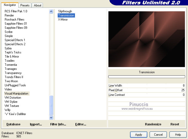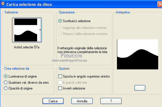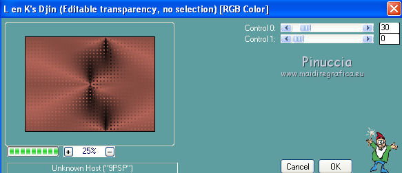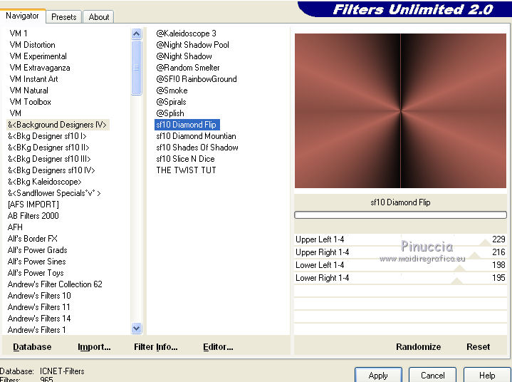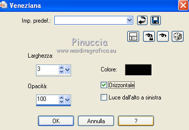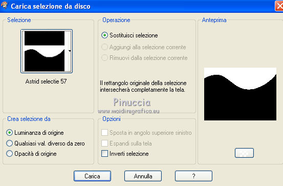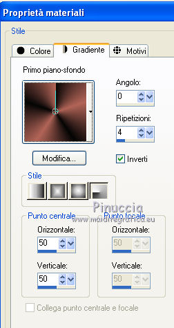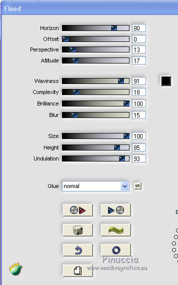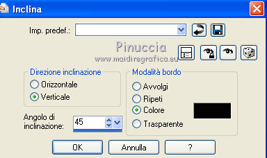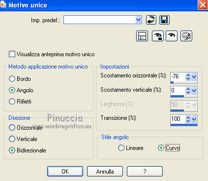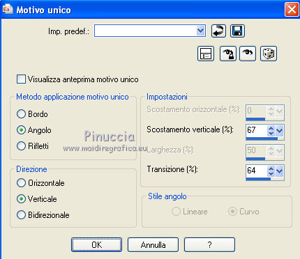 qui puoi trovare qualche risposta ai tuoi dubbi. Se l'argomento che ti interessa non è presente, ti prego di segnalarmelo. Per tradurre questo tutorial ho usato PSP X. Questo tutorial è una creazione di ©Araemae e non può essere copiato su altri siti nè essere offerto per il download. Lo stesso vale per la mia traduzione. Il materiale viene da vari gruppi di condivisione. Il copyright appartiene ai rispettivi autori. Grazie ai creatori dei tubes che mettono a disposizione il loro lavoro in vari gruppi di condivisione. Occorrente: Materiale qui Il tube della donna è di K@rine La maschera è di Cameron. Filtri: consulta, se necessario, la mia sezione filtri qui Filters Unlimited 2.0 qui Visual Manipulation - Transmission qui Background Designers IV - sf10 Diamond Flip (nel materiale). L&K - L&K Djin qui Flaming Pear - Flood qui Alien skin Eye Candy 5 Impact - Perspective Shadow qui ![]() Apri il font e minimizzalo. Lo troverai nella lista dei font disponibili quando ti servirà. Metti il preset "Astrid flood57.q8r" nella cartella del filtro. Se preferisci, puoi lasciarlo nella cartella in cui hai scompattato il materiale, e importarlo quando ti servirà. Metti le selezioni nella cartella Selezioni. Metti le maschere nella cartella Maschere. se stai usando altri colori, sei libero di sperimentare le modalità di miscelatura più adatte 1. Scegli due colori dal tuo tube, imposta il colore di primo piano con il colore chiaro, e il colore di sfondo con il colore scuro. ![]() Passa il colore di primo piano a Gradiente, stile Radiale, con i seguenti settaggi. ![]() Apri una nuova immagine trasparente 750 x 550 pixels, e riempila con il gradiente.2. Livelli>Duplica - 2 volte. Avrai così 3 livelli. Chiudi i livelli superiori e attiva il livello inferiore. 3. Regola>Sfocatura>Sfocatura gaussiana - raggio 25. ![]() 4. Apri e attiva il livello centrale. Effetti>Effetti geometrici>Inclina. ![]() 5. Effetti>Plugins>Filters Unlimited 2.0 - Visual Manipulation - Transmission. ![]() 6. Effetti>Plugins>Flaming Pear - Flood. Clicca sull'icona della freccia e cerca, nella cartella in cui lo hai conservato, il preset "Astrid flood 57.q8r". ![]() E clicca ok per confermare. questi sono i settaggi del preset. Se qualcosa non funziona nell'importazione del preset, puoi impostarli manualmente ![]() 7. Apri e attiva il livello superiore. Effetti>Plugins>Filters Unlimited 2.0 - Background Designers IV - sf10 Diamond Flip. ![]() 8. Effetti>Effetti di immagine>Motivo unico. ![]() 9. Effetti>Plugins>L&K - L&K Djin. ![]() Regola>Messa a fuoco>Metti a fuoco. 10. Livelli>Carica/Salva maschera>Carica maschera da disco. Cerca e carica la maschera 20-20. ![]() Livelli>Unisci>Unisci gruppo. 11. Effetti>Effetti di immagine>Scostamento. ![]() 12. Livelli>Duplica. Immagine>Rifletti. Livelli>Unisci>Unisci giù. 13. Livelli>Nuovo livello raster. Riempi il livello con il colore di sfondo.14. Livelli>Carica/Salva maschera>Carica maschera da disco. Cerca e carica la maschera "maskcameron249". ![]() Livelli>Unisci>Unisci gruppo. 15. Apri il tube "Astrid Blokken 57" e vai a Modifica>Copia. Torna al tuo lavoro e vai a Modifica>Incolla come nuovo livello. 16. Livelli>Nuovo livello raster. Selezione>Carica/Salva selezione>Carica selezione da disco. Cerca e carica la selezione "Astrid selectie 57". ![]() 17. Riempi la selezione con il colore di primo piano.Selezione>Deseleziona. Cambia la modalità di miscelatura di questo livello in Moltiplica, e abbassa l'opacità al 30%. Effetti>Effetti 3D>Sfalsa ombra, con il colore nero. ![]() 18. Livelli>Nuovo livello raster. Selezione>Carica/Salva selezione>Carica selezione da disco. Cerca e carica la selezione "Astrid selectie 57a". ![]() 19. Riempi la selezione con il colore di primo piano.Selezione>Deseleziona. Cambia la modalità di miscelatura di questo livello in Moltiplica, e abbassa l'opacità al 30%. Effetti>Effetti 3D>Sfalsa ombra, con i settaggi precedenti. ![]() 20. Livelli>Nuovo livello raster. Selezione>Carica/Salva selezione>Carica selezione da disco. Cerca e carica la selezione "Astrid selectie 57b". ![]() 21. Riempi la selezione con il colore di primo piano.Selezione>Deseleziona. 22. Effetti>Effetti di immagine>Motivo unico. ![]() 23. Effetti>Effetti di trama>Veneziana. ![]() Livelli>Disponi>Sposta giù e ripeti 3 volte. ![]() 24. Livelli>Unisci>Unisci visibile. Immagine>Aggiungi bordatura, 1 pixel, simmetriche, con il colore di primo piano. Livelli>Innalza livello di sfondo. 25. Immagine>Ridimensiona, al 75%, tutti i livelli non selezionato. Seleziona il bordo con la bacchetta magica ![]() e riempi con il colore di sfondo.Selezione>Deseleziona. 26. Apri il tube "k@rine_ dreams _China_Girl_2021_Octobre_2011" e vai a Modifica>Copia. Torna al tuo lavoro e vai a Modifica>Incolla come nuovo livello. Immagine>Ridimensiona, 2 volte al 75%, tutti i livelli non selezionato. Spostalo in basso contro il bordo.28. Effetti>Plugins>Alien Skin Eye Candy 5 Impact - Perspective Shadow. Seleziona Drop Shadow blurry e ok. ![]() 29. Attiva lo strumento Testo ![]() ![]() Scrivi il nome "Xiu". Livelli>Converti in livello raster. 30. Aggiungi il tuo nome e/o il tuo watermark su un nuovo livello. Livelli>Unisci>Unisci tutto. 31. Immagine>Aggiungi bordatura, 1 pixel, simmetriche, con il colore di primo piano. Salva in formato jpg. ![]() Se hai problemi o dubbi, o trovi un link non funzionante, o anche soltanto per un saluto, scrivimi. 1 Maggio 2012 |