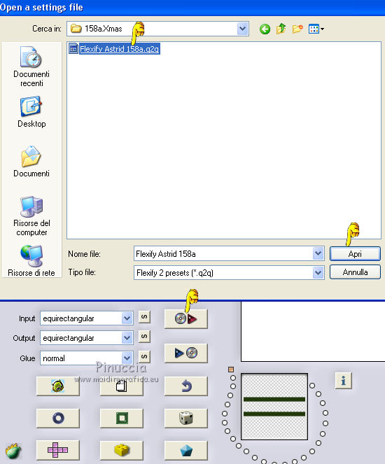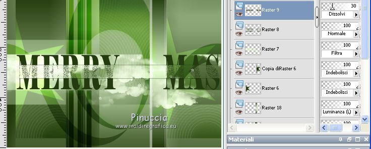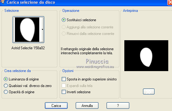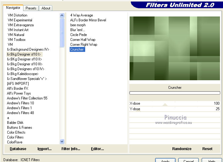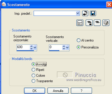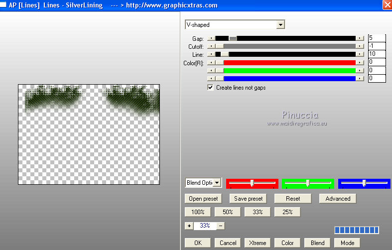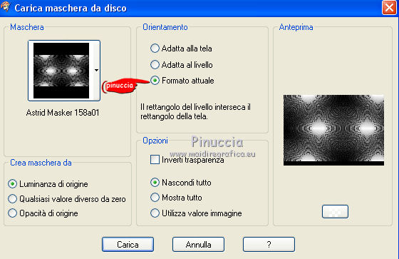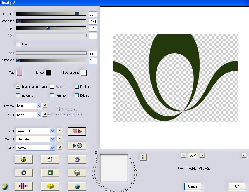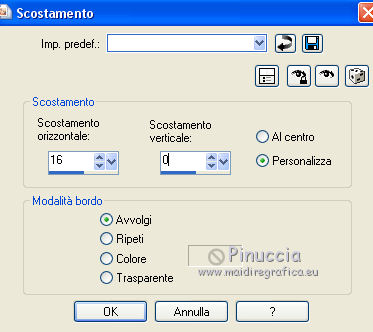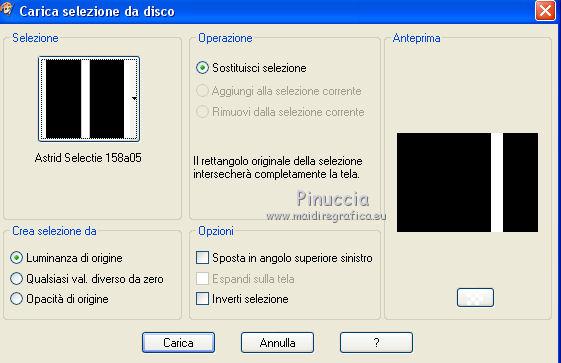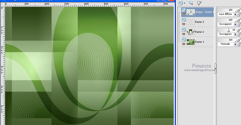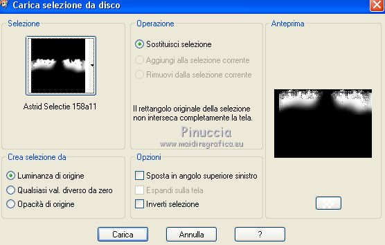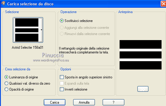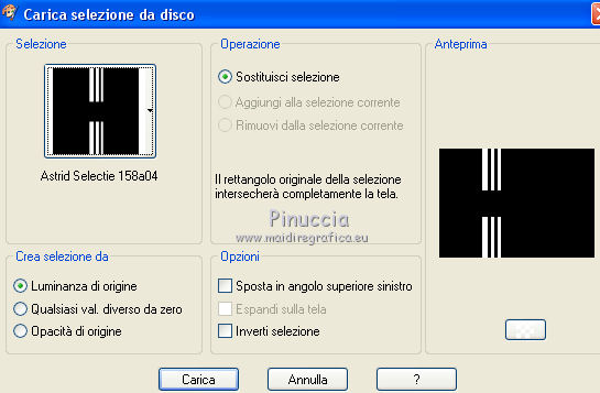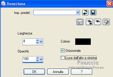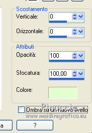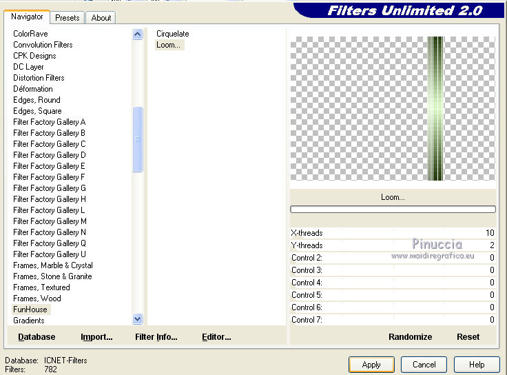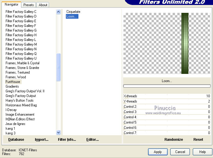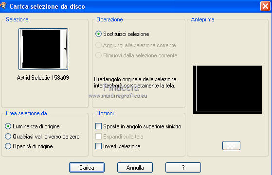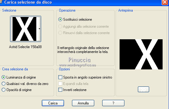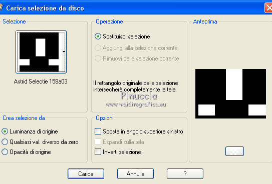 qui puoi trovare qualche risposta ai tuoi dubbi. Se l'argomento che ti interessa non è presente, ti prego di segnalarmelo. Questo tutorial è stato creato con PSPX8 e tradotto con PSPX, ma può essere eseguito anche con le altre versioni di PSP. Dalla versione X4, il comando Immagine>Rifletti è stato sostituito con Immagine>Capovolgi in orizzontale, e il comando Immagine>Capovolgi con Immagine>Capovolgi in verticale. Nelle versioni X5 e X6, le funzioni sono state migliorate rendendo disponibile il menu Oggetti. Con la versione X7 sono tornati i comandi Immagine>Rifletti e Immagine>Capovolgi, ma con nuove funzioni. Vedi la scheda sull'argomento qui ![]() Le vostre versioni qui Occorrente: Materiale qui Filtri: consulta, se necessario, la mia sezione filtri qui Filters Unlimited 2.0 qui Mehdi - Sorting Tiles, Weaver qui &<Bkg Designer sf10I> - Cruncher (da importare in Unlimited) qui Flaming Pear - Flexify 2 qui Funhouse - Loom qui Ap [Lines] - Lines SilverLining qui I filtri Funhouse si possono usare da soli o importati in Filters Unlimited (come fare vedi qui) Se un filtro fornito appare con questa icona ![]() se stai usando altri colori, sei libero di sperimentare le modalità di miscelatura più adatte Nelle ultime versioni di PSP non c'è il gradiente di primo piano/sfondo (Corel_06_029) Puoi usare i gradienti delle versioni precedenti. Trovi qui i gradienti Corel X. Metti il preset per Flexify in una cartella a scelta, o puoi anche lasciarlo nella cartella del materiale. Da questa cartella lo importerai quando ti servirà. Metti la maschera nella cartella Maschere. Metti le selezioni nella cartella Selezioni. 1. Scegli due colori dal tuo tube. Imposta il colore di primo piano con il colore chiaro (per me #e3ffce) e il colore di sfondo con il colore scuro (per me #243a0c). ![]() Passa il colore di primo piano a Gradiente di primo piano/sfondo, stile Lineare. ![]() Apri una nuova immagine trasparente 850 x 600 pixels, e riempila con il gradiente.2. Effetti>Plugins>Mehdi - Sorting Tiles. ![]() 3. Effetti>Plugins>Filters Unlimited 2.0 - &<Bkg Designer sf10I> - Cruncher. ![]() 4. Livelli>Nuovo livello raster. Selezione>Carica/Salva selezione>Carica selezione da disco. Cerca e carica la selezione "Astrid selectie 158a01". ![]() Riempi la selezione con il colore di sfondo.Selezione>Deseleziona. 5. Effetti>Plugins>Flaming Pear - Flexify 2. clicca sul bottone rosso e cerca, nella cartella in cui lo hai salvato il preset "Flexify Astrid 158a". ![]() Questi i settaggi, in caso di problemi con il preset. ![]() Cambia la modalità di miscelatura di questo livello in Sovrapponi, e abbassa l'opacità al 60%. ![]() 6. Livelli>Nuovo livello raster. Selezione>Carica/Salva selezione>Carica selezione da disco. Cerca e carica la selezione "Astrid selectie 158a02". ![]() 7. Effetti>Effetti 3D>Sfalsa ombra, colore di primo piano. ![]() Selezione>Deseleziona. 8. Effetti>Effetti di trama>Veneziana. ![]() Cambia la modalità di miscelatura di questo livello in Sovrapponi. 9. Livelli>Nuovo livello raster. Selezione>Carica/Salva selezione>Carica selezione da disco. Cerca e carica la selezione "Astrid selectie 158a03". ![]() Riempi la selezione con il colore di sfondo.Selezione>Deseleziona. 10. Sullo stesso livello. Livelli>Carica/Salva maschera>Carica maschera da disco. Cerca e carica la maschera "Astrid masker 158a01". ![]() Livelli>Unisci>Unisci gruppo. Cambia la modalità di miscelatura di questo livello in Luce diffusa. ![]() 11. Livelli>Nuovo livello raster. Selezione>Carica/Salva selezione>Carica selezione da disco. Cerca e carica la selezione "Astrid selectie 158a04". ![]() Riempi la selezione con il colore di sfondo.Selezione>Deseleziona. Cambia la modalità di miscelatura di questo livello in Sovrapponi. 12. Livelli>Nuovo livello raster. Selezione>Carica/Salva selezione>Carica selezione da disco. Cerca e carica la selezione "Astrid selectie 158a05". ![]() 13. Riempi la selezione con il gradiente del punto 1.![]() Selezione>Deseleziona. 14. Effetti>Plugins>Filters Unlimited 2.0 - Funhouse - Loom. ![]() ***** Attenzione, questo effetto dà risultati differenti a seconda della versione di Unlimited utilizzata. Per ottenere il risultato del tutorial, è stata usata la versione di Unlimited, che non si installa, ma è composta da files in formato 8bf. e questo è il risultato ![]() Se stai usando la versione software di Unlimited avrai questo ![]() Con la versione software di Unlimited, il risultato è influenzato dal colore di sfondo. Per questo, eventualmente, prima di applicare il filtro, imposta il colore di sfondo con il colore bianco ***** Cambia la modalità di miscelatura di questo livello in Luminanza (esistente). 15. Livelli>Nuovo livello raster. Selezione>Carica/Salva selezione>Carica selezione da disco. Cerca e carica la selezione "Astrid selectie 158a06". ![]() Riempi la selezione con il colore di sfondo.Selezione>Deseleziona. Cambia la modalità di miscelatura di questo livello in Indebolisci. 16. Livelli>Duplica. Effetti>Effetti di immagine>Scostamento. ![]() 17. Livelli>Nuovo livello raster. Selezione>Carica/Salva selezione>Carica selezione da disco. Cerca e carica la selezione "Astrid selectie 158a07". ![]() Riporta il colore di primo piano a Colore ![]() Riempi la selezione con il colore di primo primo piano (clicca 2 volte).Selezione>Deseleziona. Cambia la modalità di miscelatura di questo livello in Filtra. 18. Regola>Messa a fuoco>Metti a fuoco - 2 volte. 19. Apri "Astrid tekst 158a Laag 1 en 2". Attiva il livello Tekst 158a Laag 1, e vai a Modifica>Copia. Torna al tuo lavoro e vai a Modifica>Incolla come nuovo livello. Effetti>Effetti di immagine>Scostamento. ![]() 20. Apri "Astrid tekst 158a Laag 1 en 2". Attiva il livello Tekst 158a Laag 2, e vai a Modifica>Copia. Torna al tuo lavoro e vai a Modifica>Incolla come nuovo livello. Spostalo in mezzo ai testi, vedi l'esempio sotto.![]() La modalità di miscelatura di questo livello è già impostata in Dissolvi, opacità 30%. ![]() 21.
