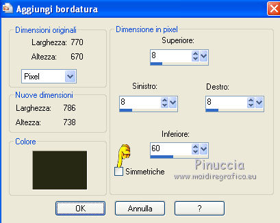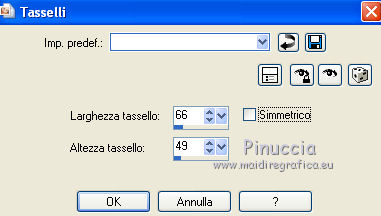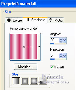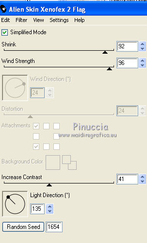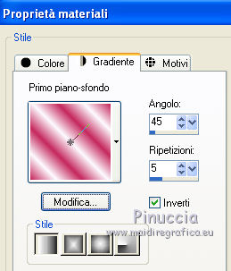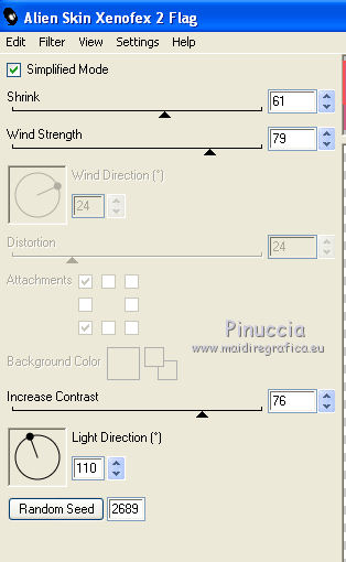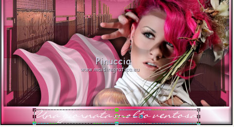 qui puoi trovare qualche risposta ai tuoi dubbi. Se l'argomento che ti interessa non è presente, ti prego di segnalarmelo. Per tradurre questo tutorial ho usato PSP X. Questo tutorial è stato scritto con PSPX4, ma può essere eseguito anche con le altre versioni di PSP. Per tradurlo ho usato PSP X. Il materiale viene da vari gruppi di condivisione. Il copyright appartiene ai rispettivi autori. Grazie ai creatori dei tubes che mettono a disposizione il loro lavoro in vari gruppi di condivisione. Occorrente: Materiale qui Per i tubes utilizzati grazie DWorisch, Guismo, Irene, e Mou. Filtri: consulta, se necessario, la mia sezione filtri qui Alien Skin Xenofex 2.0 - Flag qui ![]() Apri il font e minimizzalo. Lo troverai nella lista dei font disponibili quanto ti servirà. 1. Imposta il colore di primo piano con #fcfbff, e il colore di sfondo con #c5285d. 2. Passa il colore di primo piano a Gradiente, stile Lineare, con i seguenti settaggi: ![]() 3. Apri BackgroundArasimages. quando aprirai il file ti apparirà questa finestra, clicca ok e continua ![]() Questa sarà la base del tuo lavoro e sarà il livello Raster 1. 4. Livelli>Nuovo livello raster. Riempi con il colore di sfondo #c5285d.Abbassa l'opacità di questo livello al 58%. 5. Apri DI_tube1837.pspimage e vai a Modifica>Copia. Torna al tuo lavoro e vai a Modifica>Incolla come nuovo livello. Spostalo a sinistra,sul bordo della seconda striscia scura. ![]() Cambia la modalità di miscelatura di questo livello in Luminanza (Esistente). 6. Livelli>Nuovo livello raster. Riempi con il gradiente.7. Effetti>Effetti di distorsione>Tasselli. ![]() 8. Effetti>Plugins>Alien Skin Xenofex 2.0 - Flag. sotto la linguetta Setting seleziona Windy setting, con i seguenti settaggi. ![]() 9. Sposta l'immagine in alto a destra.![]() 10. Effetti>Effetti 3D>Sfalsa ombra, con il colore nero #000000. ![]() Ripeti l'Effetto Sfalsa ombra, cambiando verticale e orizzontale con 10/-10. ![]() 11. Open calguispasseerelle25012012.pspimage e vai a Modifica>Copia. Torna al tuo lavoro e vai a Modifica>Incolla come nuovo livello. Spostalo in basso al centro.Abbassa l'opacità di questo livello al 75%. 12. Livelli>Nuovo livello raster. Riempi con il gradiente.13. Effetti>Effetti di distorsione>Tasselli, con i settaggi precedenti. ![]() 14. Effetti>Plugins>Alien Skin Xenofex 2 - Flag. Setting: Simple Windy. ![]() 15. Immagine>Ruota per gradi - 15 gradi a sinistra. ![]() 16. Immagine>Ridimensiona, al 70%, tutti i livelli non selezionato. Sposta l'immagine in basso a sinistra.![]() 17. Effetti>Effetti 3D>Sfalsa ombra, con il colore nero #000000. ![]() Ripeti l'Effetto Sfalsa ombra, cambiando verticale e orizzontale con 10/-10. ![]() 18. Open calguisredelegant3510.pspimage. e vai a Modifica>Copia. Torna al tuo lavoro e vai a Modifica>Incolla come nuovo livello. Sposta il tube nell'angolo in basso a destra.19. Effetti>Effetti 3D>Sfalsa ombra, con il colore nero #000000. ![]() 20. Apri 1150dwtubes.pspimage. e vai a Modifica>Copia. Torna al tuo lavoro e vai a Modifica>Incolla come nuovo livello. Immagine>Ridimensiona, al 50%, tutti i livelli non selezionato. Spostalo sul recinto a sinistra.Attiva lo strumento Gomma , dimensione 15,e cancella la nuvola e la piccola parte di coda sopra il recinto. ![]() 21. Effetti>Effetti 3D>Sfalsa ombra, con il colore nero #000000. ![]() 22. Apri mou_seagull.pspimage e vai a Modifica>Copia. Torna al tuo lavoro e vai a Modifica>Incolla come nuovo livello. Immagine>Ridimensiona, al 35%, tutti i livelli non selezionato. Sposta i gabbiani sopra il secondo recinto.![]() Abbassa l'opacità di questo livello al 90%. 24. Effetti>Effetti 3D>Sfalsa ombra, con il colore nero #000000. ![]() 25. Immagine>Aggiungi bordatura, simmetriche non selezionato, colore nero #000000. ![]() Seleziona questo bordo con la bacchetta magica ![]() 26. Cambia i settaggi del gradiente, portando l'angolo a 45. ![]() Riempi la selezione con il gradiente.27. 10. Effetti>Effetti 3D>Sfalsa ombra, con il colore nero #000000. ![]() Ripeti l'Effetto Sfalsa ombra, cambiando verticale e orizzontale con -6/-3. ![]() 28. Effetti>Effetti 3D>Smusso a incasso. ![]() Selezione>Deseleziona. 29. Immagine>Aggiungi bordatura, 3 pixels, simmetriche, con il colore nero #000000. 30. Imposta il colore di sfondo con #fcfbff. 31. Attiva lo strumento Testo , font Liorah, dimensione 36,(dovrai regolare la dimensione in base al tuo testo e alla versione di PSP che stai usando) ![]() Scrivi A Very windy day o quello che preferisci, e approfitta della griglia dello strumento per posizionare il testo sul bordo da 60 pixels. ![]() Converti in livello raster. 32. Effetti>Effetti 3D>Sfalsa ombra, con il colore nero #000000. ![]() Regola>Messa a fuoco>Metti a fuoco. Livelli>Unisci>Unisci visibile e salva in formato jpg. ![]() Se hai problemi o dubbi, o trovi un link non funzionante, o anche soltanto per dirmi che questo tutorial ti è piaciuto, scrivimi. 16 Aprile 2012 |
