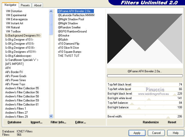 Effetti>Plugins>Filters Unlimited 2.0 - &<Background Designer IV - @Frame AFH Beveler 2.0a