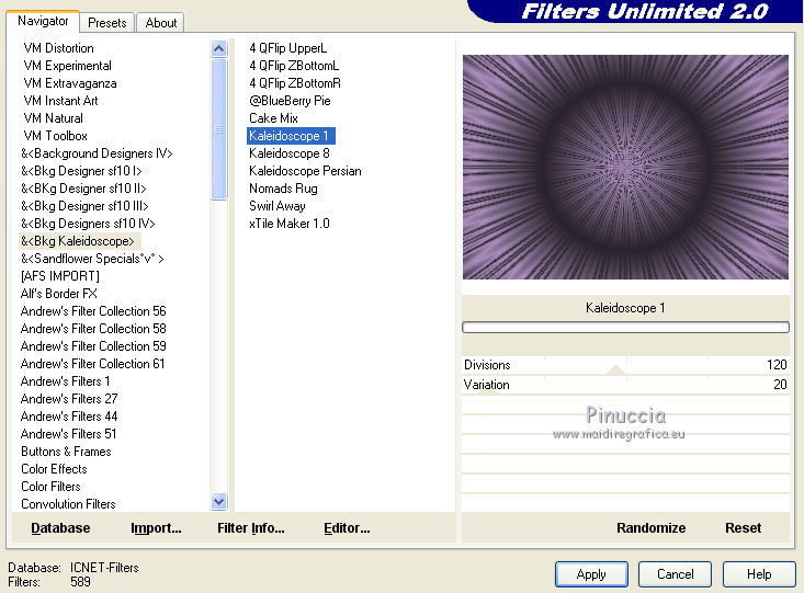 3. Effetti>Plugins>Filters Unlimited 2.0 - Bkg Kaleidoscope - Kaleidoscope 1.