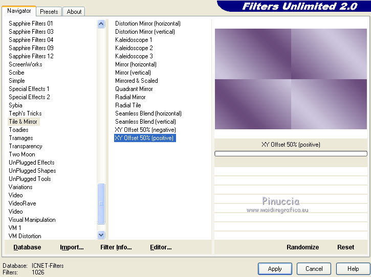 Effetti>Plugins>Filters Unlimited 2.0 - Tile & Mirror - XY Offset 50%(positive).