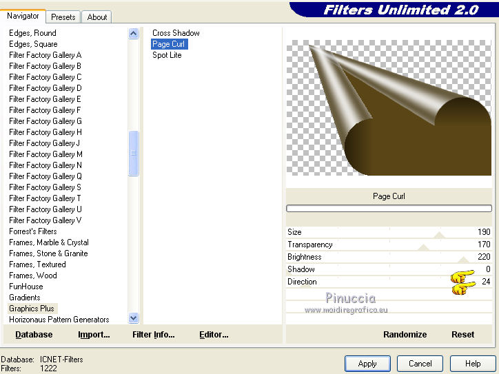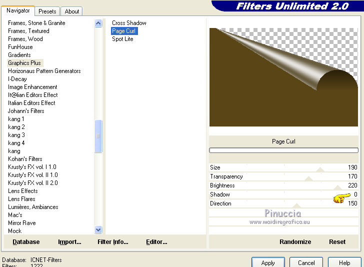 5. Di nuovo Effetti>Plugins>Filters unlimited 2.0 - Graphics Plus - Page Curl.