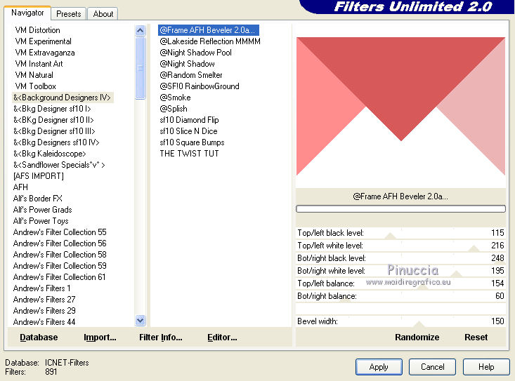 2. Effetti>Plugins>Filters Unlimited 2.0 - &<Background Designer IV> - @ Frame AFH Beveler 2.0a.