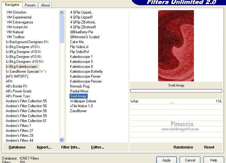 19. Efetti>Plugins>Filters Unlimited 2.0 - &<Bkg Kaleidoscope> - Swirl away.