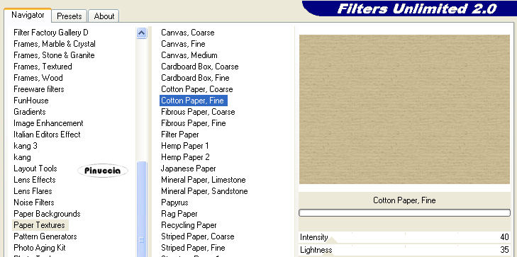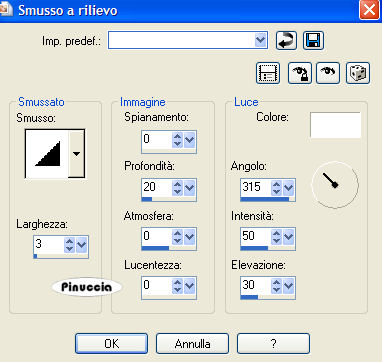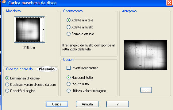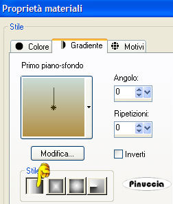 qui puoi trovare qualche risposta ai tuoi dubbi. Se l'argomento che ti interessa non è presente, ti prego di segnalarmelo. Occorrente: Materiale qui Filtri: Xero qui FM Tile Tools - Blend Emboss qui Per favore, lascia i tubes al loro stato originale. Metti la maschera nella cartella Maschere. Apri tutti i tubes in PSP. Apri una nuova immagine trasparente 700 x 500 pixels. Imposta il colore di primo piano con #b18f44 e il colore di sfondo con #cadbd6. Passa il colore di primo piano a Gradiente di primo piano/sfondo, stile lineare, con i seguenti settaggi: ![]() Se tutto è corretto il colore blu dovrebbe stare sopra. Riempi l'immagine trasparente con questo gradiente.Attiva il tube Mtm_Face e vai a Modifica>Copia. Torna al tuo lavoro e vai a Modifica>Incolla>Incolla come nuovo livello. Spostalo a destra contro il bordo.Attiva lo strumento Deformazione ![]() se stai usando PSP X è lo strumento Puntatore ![]() "Tira" il tube in alto e in basso in modo che riempia tutta l'altezza dell'immagine: ![]() Effetti>Plugins>FM Tile Tools - Blend Emboss, con i settaggi standard: ![]() Attiva il tube st-peter e vai a Modifica>Copia. Torna al tuo lavoro e vai a Modifica>Incolla>Incolla come nuovo livello. Spostalo , a sinistra:vedi l'esempio finale. Effetti>Plugins>FM Tile Tools - Blend Emboss, con i settaggi standard. Attiva lo strumento Selezione a mano libera ,punto a punto, sfumatura 16, e seleziona la parte dell'edificio che copre gli occhi della donna: ![]() Premi sulla tastiera il tasto CANC. Selezione>Nessuna selezione. Livelli>Unisci>Unisci tutto. Regola>Correzione fotografica>Rimozione disturbo fotocamera digitale, con i settaggi standard. Se stai usando PSP X: Regola>Rimozione disturbo fotocamera digitale. Regola>Luminosità e contrasto>Nitidezza, intensità dell'effetto 2. ![]() Effetti>Plugins>Xero - Porcelain: ![]() Immagine>Ridimensiona, a 400 pixels di altezza, tutti i livelli e mantieni proporzioni selezionati. Livelli>Nuovo livello raster. Riempi il nuovo livello con il colore #d2c29b.Effetti>Plugins>Filters unlimited 2 - Paper Textures - Cotton paper, Fine: 40.35. ![]() Livelli>Disponi>Sposta giù. Attiva il livello superiore, che è quello della donna. Livelli>Carica/salva maschera>Carica maschera da disco. Cerca e carica la maschera 215-kris, con i seguenti settaggi: ![]() Livelli>Unisci>Unisci gruppo. Abbassa l'opacità del livello inferiore al 90%. Livelli>Unisci>Unisci tutto. Attiva lo strumento Selezione , rettangolo, sfumatura 0,e seleziona la parte centrale della donna e dell'edificio. Modifica>Copia. Selezione>Nessuna selezione. Selezione>Seleziona tutto. Selezione>Modifica>Contrai, di 8 pixels. Selezione>Inverti. Incolla>Incolla nella selezione. Regola>Sfocatura>Sfocatura gaussiana, raggio 2. Mantieni selezionato. Effetti>Effetti 3D>Smusso a rilievo, con i seguenti settaggi: ![]() Selezione>Nessuna selezione. Aggiungi il testo e il tuo watermark. Se vuoi, puoi usare il file di testo che trovi nello zip: Attiva il file di testo e vai a Modifica>Copia. Torna al tuo lavoro e vai a Modifica>Incolla>Incolla come nuovo livello. Posiziona il testo.Cambia la modalità di miscelatura di questo livello in luce diffusa. Salva in formato jpg. ![]() ![]() Se hai problemi o dubbi, o trovi un link non funzionante, o anche soltanto per un saluto, scrivimi. 2 Marzo 2007 |