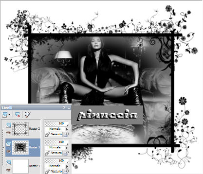 qui puoi trovare qualche risposta ai tuoi dubbi. Se l'argomento che ti interessa non è presente, ti prego di segnalarmelo. Occorrente: Materiale qui Per favore, mantieni i tubes nel loro stato originale. Per tradurre questo tutorial ho usato PSP X. Apri i tubes e l'immagine in PSP. Se vuoi usare altre immagini, devono avere queste dimensioni: 497 pixels di larghezza x 386 pixels di altezza. Apri una nuova immagine trasparente 700 x 600 pixels, e riempila con il bianco.Attiva il tube con la cornice "chickypow-crazygarden" e vai a Modifica>Copia. Torna al tuo lavoro e vai a Modifica>Incolla come nuovo livello. E' già posizionata. Non occorre spostarla. Attiva l'immagine fornita con il tutorial "plaatje black and white les", o la tua immagine 497x386 pixels, (puoi anche usare un tube, al quale dovrai applicare uno sfondo), e vai a Modifica>Copia. Torna al tuo lavoro e vai a Modifica>Incolla come nuovo livello. Livelli>Disponi>Sposta giù, in modo da spostare il livello sotto la cornice, e quindi sistema l'immagine entro i bordi.![]() Attiva il livello superiore. Attiva il tube "Accent black and white" e vai a Modifica>Copia. Torna al tuo lavoro e vai a Modifica>Incolla come nuovo livello. Spostalo in basso, sopra il bordo inferiore.![]() Attiva il tube "Bow black and white" e vai a Modifica>Copia. Torna al tuo lavoro e vai a Modifica>Incolla come nuovo livello. Sposta il nastro nell'angolo in alto a destra.Attiva il tube "HS Element_Charms03" e vai a Modifica>Copia. Torna al tuo lavoro e vai a Modifica>Incolla come nuovo livello. Spostalo nell'angolo in alto a sinistra.![]() Attiva lo strumento Testo e scrivi il tuo nome.Attenzione alla dimensione del testo, perchè dovrà essere inserito all'interno della targhetta. Immagine>Ruota per gradi, 90 gradi a sinistra. ![]() Posiziona il testo all'interno della targhetta. Livelli>Unisci>Unisci giù. Attiva il tube "Button black and white" e vai a Modifica>Copia. Torna al tuo lavoro e vai a Modifica>Incolla come nuovo livello. Posizionalo sull'anello della targhetta.![]() Aggiungi, se vuoi, il tuo watermark e salva in jpg. ![]() Se hai problemi o dubbi, o trovi un link non funzionante, o anche soltanto per un saluto, scrivimi. 12 Marzo 2007 |