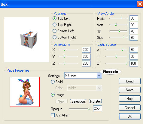 qui puoi trovare qualche risposta ai tuoi dubbi. Se l'argomento che ti interessa non è presente, ti prego di segnalarmelo. Per tradurre questo tutorial ho usato PSP X. Occorrente: a scelta il tube di una donna seduta. Il tube che ho usato per il mio esempio è di Lori Rhae. Filtro: Vizros 4 - box qui Apri il tuo tube e duplicalo usando sulla tastiera la combinazione di tasti shift(maiuscola)+D. Metti da parte la copia e attiva l'originale. Immagine>Dimensione tela - 700 x 700 pixels. Livelli>Nuovo livello raster. Livelli>Disponi>Porta sotto. Scegli un colore dal tube, che non sia il bianco e impostalo come colore di primo piano. Riempi il livello con questo colore.Livelli>Unisci>Unisci tutto. Effetto>Plugins>Vizros4 - Box, con i settaggi standard, ma portando le dimensioni intorno a 200. Controlla l'anteprima e se ritieni che sia ancora troppo poco, aumenta il settaggio. Quando sei soddisfatto, clicca ok per applicare il filtro. ![]() Adesso il tuo tube è diventato una scatola con il colore di sfondo bianco. Livelli>Innalza livello di sfondo. Attiva lo strumento Bacchetta magica ![]() ![]() e clicca sullo sfondo bianco per selezionarlo. Premi sulla tastiera il tasto CANC ![]() Attiva nuovamente il tube originale e vai a Modifica>Copia. Torna al tuo lavoro e vai a Modifica>Incolla come nuovo livello. Posiziona tube e cubo come ti sembra meglio.Se necessario, ridimensiona il tube originale. Adesso hai tre livelli, il livello trasparente di sfondo, il livello del cubo e il terzo livello del tube. Chiudi il livello di sfondo. Livelli>Unisci>Unisci visibile. Riapri il livello di sfondo. Posiziona il cubo con il tube come ti sembra meglio.Attiva il livello di sfondo e riempilo con il colore che preferisci. Naturalmente può anche essere un gradiente o il colore bianco: quello che ti suggerisce la tua fantasia.Attiva il livello del tube. Effetti>Effetti 3D>Sfalsa ombra, con i seguenti settaggi, colore nero: ![]() Attiva lo strumento Testo e scrivi il tuo nome o un testo.Effetti>Effetti 3D>sfalsa ombra, con i seguenti settaggi, colore nero. Ripeti l'Effetto Sfalsa ombra, con i seguenti settaggi: Posiziona il testo come ti sembra meglio. Livelli>Unisci>Unisci tutto. Ritaglia lo spazio in eccesso, e salva in formato jpg.![]() Se hai problemi o dubbi, o trovi un link non funzionante, o anche soltanto per un saluto, scrivimi. 7 Gennaio 2009 |