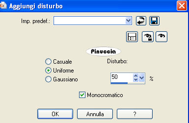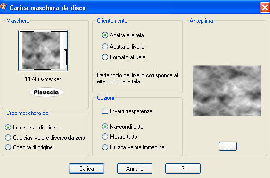 qui puoi trovare qualche risposta ai tuoi dubbi. Se l'argomento che ti interessa non è presente, ti prego di segnalarmelo. Occorrente: Materiale qui Mantieni i tubes al loro stato originale. Filtri: Xero - Porcelain qui Apri tutti i tubes in PSP. Apri una nuova immagine trasparente 600 x 450 pixels. Apri il tube "misted background by Laufey" e vai a Modifica>Copia. Torna al tuo lavoro e vai a Modifica>Incolla>Incolla come nuovo livello. Sposta l'immagine in alto a destra.Abbassa l'opacità di questo livello al 75%. Apri il tube "misted image-Laufey" e vai a Modifica>Copia. Torna al tuo lavoro e vai a Modifica>Incolla>Incolla come nuovo livello. Sposta l'immagine in alto a sinistra.Abbassa l'opacità di questo livello all'80%. Apri il tube "Lemonice MistedbyGini". Immagine>Ridimensiona, a 431 pixels di larghezza. Posizionati sul livello del tube e vai a Modifica>Copia. Torna al tuo lavoro e vai a Modifica>Incolla>Incolla come nuovo livello. Sposta il tube in basso, in modo che non si veda il limone.![]() Cambia la modalità di miscelatura di questo livello in Luminanza (esistente), e abbassa l'opacità all'85%. Livelli>Nuovo Livello raster. Livelli>Disponi>Porta sotto. Riempi il livello con il colore #edb463.Rimani posizionato sul livello inferiore. Livelli>Nuovo livello raster. Riempi con il colore #d2ca9e.Livelli>Carica/Salva maschera>Carica maschera da disco. Cerca e carica la maschera 117-kris, con i seguenti settaggi: ![]() Chiudi il livello del tube della donna. Livelli>Unisci>Unisci visibile. Regola>Luminosità e contrasto>Nitidezza: 1. Apri il livello della donna. Livelli>Unisci>Unisci tutto. Effetti>Plugins>Xero - Porcelain, con i seguenti settaggi: ![]() Selezione>Seleziona tutto. Selezione>Modifica>Contrai, di 8 pixels. Selezione>inverti. Regola>aggiungi/rimuovi disturbo/Aggiungi disturbo: ![]() Effetti>Effetti 3D>Smusso a rilievo: ![]() Apri il tube di testo "dreamingtext" e vai a Modifica>Copia. Torna al tuo lavoro e vai a Modifica>Incolla>Incolla come nuovo livello. Cambia la modalità di miscelatura di questo livello in Luce diffusa. Naturalmente, se lo desideri, puoi usare un tuo testo. Aggiungi il tuo nome e/o il tuo watermark e salva in formato jpg. ![]() Se hai problemi o dubbi, o trovi un link non funzionante, o anche soltanto per un saluto, scrivimi. 26 Febbraio 2008 |