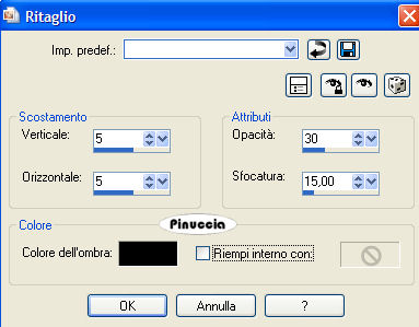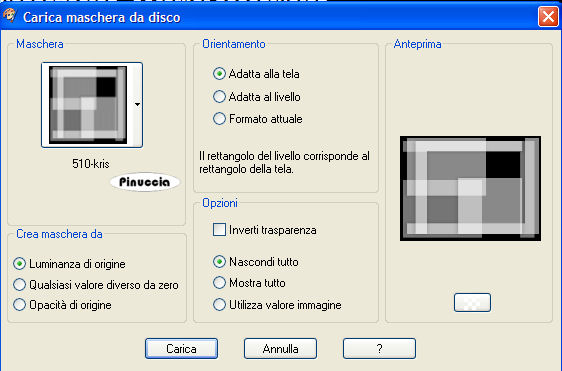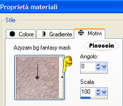 qui puoi trovare qualche risposta ai tuoi dubbi. Se l'argomento che ti interessa non è presente, ti prego di segnalarmelo. Questo tutorial è stato scritto con PSP XI. Per tradurlo, l'ho eseguito con PSP X. Occorrente: Materiale qui Se vuoi condividere i tubes, lasciali al loro stato originale. La maschera è di Ms Kris. Metti la maschera nella cartella Maschere. Apri il motivo "Azyzam bg fantasy mask" e minimizzalo nella tua area di lavoro. Lo troverai nella lista dei motivi disponibili quando ti servirà. Nello zip troverai un diagramma dei colori usati nel tutorial. Apri il file in psp, e clicca semplicemente su ogni colore, quando ti servirà. ![]() Imposta il colore di primo piano con il colore rosa #ceb4b2, e il colore di sfondo con il bianco #ffffff Apri una nuova immagine trasparente 700 x 525 pixels, e riempila con il colore di primo piano #ceb4b2.Livelli>Nuovo livello raster. Riempi il nuovo livello con il colore di sfondo #ffffff.Livelli>Carica/Salva maschera>Carica maschera da disco: cerca e carica la maschera 510-kris con i seguenti settaggi: ![]() Livelli>Unisci>Unisci gruppo. Abbassa l'opacità di questo livello al 50%. Effetti>Effetti di bordo>Aumenta di più. Attiva il tube MarieL_2007_05Mai_smoke01t. Rendi visibile il livello del tube che è chiuso, e vai a Modifica>Copia. Torna al tuo lavoro e vai a Modifica>Incolla come nuovo livello. Sposta il tube a sinistra e in alto, più o meno come nel mio esempio.Il bordo inferiore del tube deve trovarsi proprio sul bordo scuro della maschera. ![]() Abbassa l'opacità di questo livello al 50%. Attiva il tube Marif_2007_07Juillet_misted_masque01. Immagine>Ridimensiona, al 115%, tutti i livelli selezionato. Livelli>Carica/salva maschera>Carica maschera da disco. Cerca e carica la maschera 20-20, con i settaggi standard. ![]() Livelli>Unisci>Unisci gruppo. Questo ammorbidirà i contorni scuri del bordo. Modifica>Copia. Torna al tuo lavoro e vai a Modifica>Incolla come nuovo livello. Sposta il tube un po' più a sinistra e un po' più in alto.Vedi l'esempio (fai attenzione alle linee del livello della maschera). ![]() Imposta il colore di primo piano con il colore rosa scuro: #7e5b5a. Immagine>Aggiungi bordatura, 3 pixels, simmetriche, con il colore rosa scuro di primo piano =#7e5b5a. Immagine>Aggiungi bordatura, 35 pixels, simmetriche, con il colore bianco di sfondo =#ffffff. Seleziona questo bordo con la bacchetta magica ![]() ![]() Passa il colore di primo piano a Motivi. Cerca nella lista il motivo "Azyzam background fantasy mask": ![]() e riempi il bordo bianco con questo motivo.Mantieni selezionato. Effetti>Effetti 3D>Smusso a incasso: ![]() Livelli>Nuovo livello raster. Attiva il tube "Azyzam fantasymask border overlay", e vai a Modifica>Copia. Torna al tuo lavoro e vai a Modifica>Incolla nella selezione. Selezione>Deseleziona. Immagine>Aggiungi bordatura, 3 pixels, simmetriche, con il colore rosa scuro di primo piano #7e5b5a. Selezione>Seleziona tutto. Selezione>Modifica>Contrai di 41 pixels. Livelli>Nuovo livello raster. Effetti>Effetti 3D>Ritaglio, con i seguenti settaggi, colore nero. ![]() Selezione>Deseleziona. Livelli>Duplica. Immagine>Capovolgi. Immagine>Rifletti. Attiva lo strumento Testo .Io ho usato il font Andalus (standard di Windows). Imposta il colore di sfondo con il colore rosa scuro #7e5b5a. Scrivi il testo Fantasy Mask. Livelli>Converti in livello raster. Immagine>Ruota per gradi, 90 gradi a sinistra. ![]() Posiziona il testo a destra. Abbassa l'opacità di questo livello intorno al 60% (prova il settaggio che ti dà il migliore risultato). Attiva nuovamente lo strumento Testo , con gli stessi settaggi,e scrivi il tuo nome. Livelli>Converti in livello raster, Sposta il testo in basso a sinistra, nella striscia.Abbassa l'opacità di questo livello come hai fatto con il precedente testo. Aggiungi, se vuoi, il tuo watermark e salva in formato jpg. ![]() Se hai problemi o dubbi, o trovi un link non funzionante, o anche soltanto per un saluto, scrivimi. 21 Luglio 2007 |