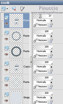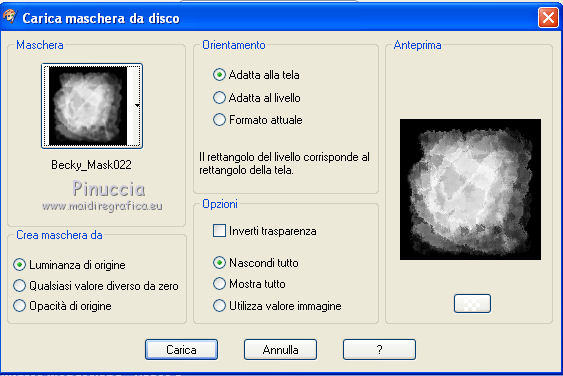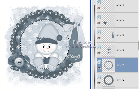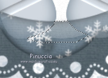qui puoi trovare qualche risposta ai tuoi dubbi. Se l'argomento che ti interessa non è presente, ti prego di segnalarmelo. Questo tutorial è stato scritto e tradotto con PSP X, ma può essere eseguito anche con le altre versioni di PSP. Materiale qui Lo scrapset usato per questo tutorial è Winter Wonderland di Wicked Scrapz by Kristin La maschera è di Becky e la trovi nello zip. Il tube dello sfondo viene da un gruppo di share. Dallo scrapkit Kristin-Winter Wonderland, apri "Kristin - Winter Wonderland - Paper 5". Questa sarà la base del tuo lavoro. Immagine>Ridimensiona, a 700 x 700 pixels, mantieni proporzioni e tutti i livelli selezionato. Livelli>Innalza livello di sfondo. Livelli>Carica/Salva maschera>Carica maschera da disco. Cerca e carica la maschera Becky Mask 22. ![]() Livelli>Unisci>Unisci gruppo. Livelli>Duplica, 2 volte, e avrai così tre livelli della maschera. Livelli>Unisci>Unisci giù e ripeti e avrai così unito i tre livelli della maschera. ![]() Livelli>Nuovo livello raster. Riempi il livello con il colore bianco.Livelli>Disponi>Sposta giù. Attiva il livello superiore. Apri "Azyzam Let it snow bg1" e vai a Modifica>Copia. Torna al tuo lavoro e vai a Modifica>Incolla come nuovo livello. Non occorre spostarlo. E' già correttamente posizionato. Dallo scrapkit apri "Kristin - Winter Wonderland - Frame 3", e vai a Modifica>Copia. Torna al tuo lavoro e vai a Modifica>Incolla come nuovo livello. Immagine>Ridimensiona, al 115%, tutti i livelli non selezionato. Effetti>Effetti 3D>Sfalsa ombra, con i seguenti settaggi, colore #202020. ![]() Dallo scrapkit apri "Kristin - Winter Wonderland - Frame 1" e vai a Modifica>copia. Torna al tuo lavoro e vai a Modifica>Incolla come nuovo livello. Immagine>Ridimensiona, al 95%, tutti i livelli non selezionato. Dallo scrapkit apri "Kristin - Winter Wonderland - Snowman" e vai a Modifica>Copia. Torna al tuo lavoro e vai a Modifica>Incolla come nuovo livello. Spostalo al centro della cornice,e in modo che una parte delle scarpine appoggi sul bordo rotondo della cornice. ![]() Livelli>Duplica. Nella paletta dei livelli trascina questo livello sotto il livello delle cornici. ![]() Attiva il livello superiore e abbassa l'opacità al 37% abbassare l'opacità ti servirà per vedere meglio quello che devi fare. ![]() Attiva lo strumento Selezione a mano libera , da punto a punto,sfumatura 0, antialias selezionato. ![]() seleziona il pezzetto della pancia sulla cornice del tube superiore tra le scarpette. ![]() Non preoccuparti se la selezione non è troppo precisa. Se selezioni qualcosa di troppo non sarà cancellata dal livello inferiore. Premi sulla tastiera il tasto CANC e riporta l'opacità al 100%.Selezione>Deseleziona. ![]() Attiva il livello inferiore dell'orsacchiotto. Effetti>Effetti 3D>Sfalsa ombra, con i settaggi precedenti. Attiva nuovamente il livello superiore. Dallo scrapkit apri "Kristin - Winter Wonderland - Tag 1" e vai a Modifica>Copia. Torna al tuo lavoro e vai a Modifica>Incolla come nuovo livello. Immagine>Ridimensiona, 2 volte all'85%, tutti i livelli non selezionato. Sposta la targhetta in alto a destra della cornice.Effetti>Effetti 3D>Sfalsa ombra, con i settaggi precedenti. Dallo scrapkit apri "Kristin - Winter Wonderland - Flower 1" e vai a Modifica>Copia. Torna al tuo lavoro e vai a Modifica>Incolla come nuovo livello. Sposta il fiore in basso a sinistra della cornice.Effetti>Effetti 3D>Sfalsa ombra, con i settaggi precedenti. Dallo scrapkit apri "Kristin - Winter Wonderland - Button 1" e vai a Modifica>Copia. Torna al tuo lavoro e vai a Modifica>Incolla come nuovo livello. Sposta il bottone sopra il fiore.![]() Effetti>Effetti 3D>Sfalsa ombra, con i settaggi precedenti. Attiva lo strumento Bacchetta magica ![]() ![]() Attiva il livello della cornice inferiore e clicca sull'area rotonda per selezionarla. ![]() Selezione>Modifica>Espandi - 15 pixels. Attiva il livello sopra il livello di sfondo bianco. ![]() Dallo scrapkit apri "Kristin - Winter Wonderland - Paper 2" e vai a Modifica>Copia. Torna al tuo lavoro e vai a Modifica>Incolla come nuovo livello. Selezione>Inverti. Premi sulla tastiera il tasto CANC. Abbassa l'opacità di questo livello al 70%. Selezione>Deseleziona. Attiva nuovamente il livello superiore. Dallo scrapkit, scegli due delle tre palline, copiale e incollale come nuovo livello. Sposta le palline in basso a sinistra, sopra il fiore - vedi il mio esempio.Effetti>Effetti 3D>Sfalsa ombra, con i settaggi precedenti. Nella paletta dei livelli sposta i livelli delle palline sotto il livello del bottone. Apri il tube Misted_Coming_Home_RM e vai a Modifica>copia. Torna al tuo lavoro e vai a Modifica>Incolla come nuovo livello. Nella paletta dei livelli sposta questo livello sotto il livello del tube dell'orsacchiotto. Cambia la modalità di miscelatura di questo livello in Luminanza (esistente). Dallo scrapkit, scegli uno dei due testi e vai a Modifica>copia. torna al tuo lavoro e vai a Modifica>Incolla come nuovo livello. Sposta il testo dove preferisci, o vedi il mio esempio.Aggiungi il tuo nome sulla targhetta. Effetti>Effetti 3D>sfalsa ombra, con i settaggi precedenti. Livelli>Unisci>Unisci tutto e salva in formato jpg. ![]() ![]() ![]() Se hai problemi o dubbi, o trovi un link non funzionante, o anche soltanto per un saluto, scrivimi. 14 Novembre 2008 |