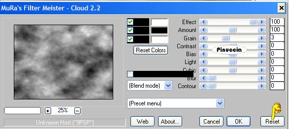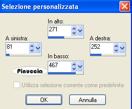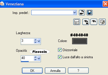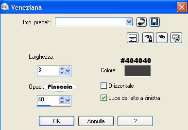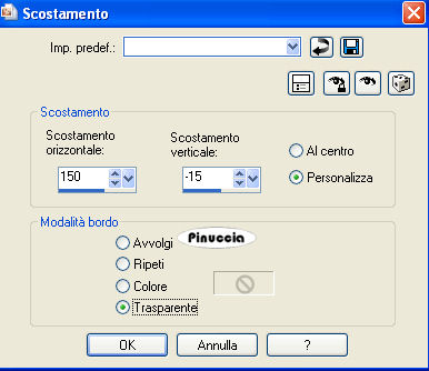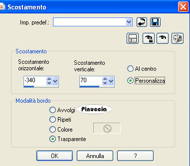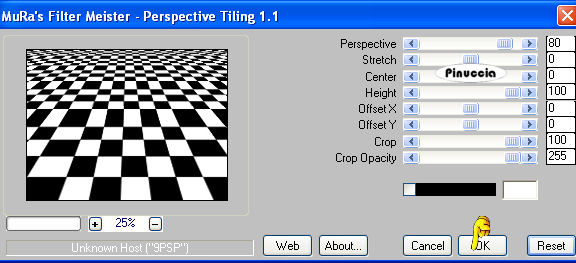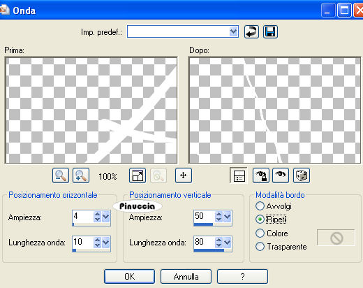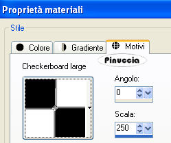 qui puoi trovare qualche risposta ai tuoi dubbi. Se l'argomento che ti interessa non è presente, ti prego di segnalarmelo. Questo tutorial è stato scritto con PSP X. Occorrente: Materiale qui Filtro: Mura's Meister - Cloud qui Se vuoi condividere i tubes, per favore lascia intatto il livello del watermark. Metti il motivo Checkerboad nella cartella Motivi di PSP. Apri i tubes in PSP. Prima Parte. Lo sfondo. Apri una nuova immagine trasparente 800 x 600 pixels. Imposta il colore di primo piano con il nero #000000, e il colore di sfondo con il bianco #ffffff. Effetti>Plugins>Mura's Meister - Cloud, clicca su Reset e poi Ok. ![]() Livelli>Nuovo livello raster. Imposta il colore di primo piano su Motivi. Apri il menu cliccando sulla freccia a fianco del box. Cerca e seleziona il motivo Checkerboard large, angolo 0, scala 250. ![]() Riempi con questo motivo.Effetti>Plugins>Mura's Meister - Perspective tiling, clicca una volta su Reset e poi ok. ![]() Attiva lo strumento Spostamento , e clicca una volta sulla tastiera il tasto M.Tenendo premuto il tasto shift clicca 5 volte sulla freccia giù della tastiera ![]() Appariranno le nuvole sul pavimento. ![]() Assicurati che sia selezionato il livello del pavimento e rimani su questo livello. Attiva lo strumento Selezione , rettangolo, sfumatura 55, antialias selezionato.Traccia un rettangolo esattamente sul confine tra il pavimento e le nuvole. ![]() Quando rilascerai il mouse, la selezione si allargherà per effetto della sfumatura. ![]() Clicca ora 12 volte, o più spesso se vuoi un effetto più sfumato, sul tasto CANC della tastiera, in modo che il pavimento si "mescoli" con le nuvole. Selezione>Deseleziona. Livelli>Unisci>Unisci giù. Sistemerai più tardi l'opacità del livello!! Seconda parte. Il tube Attiva il tube di Ann e vai a Modifica>Copia. Torna al tuo lavoro e vai a Modifica>Incolla come nuovo livello. Effetti>Effetti di immagine>Scostamento: ![]() Livelli>Duplica. Regola>Sfocatura>Sfocatura gaussiana, raggio 10. Livelli>Disponi>Sposta giù. Attiva il livello superiore. Livelli>Duplica. Immagine>Ridimensiona, 2 volte all'85%, ricampionamento bicubica, tutti i livelli NON selezionato. ![]() Effetti>Effetti di immagine>Scostamento: ![]() Attiva lo strumento Selezione ,selezione personalizzata ![]() (ricordati di riportare la sfumatura a 0), con i seguenti settaggi: ![]() Clicca una volta sulla tastiera il tasto CANC. Abbassa l'opacità di questo livello al 10%. Selezione>Deseleziona. Parte 3. Le decorazioni. Il colore di sfondo è ancora impostato su bianco #ffffff. Apri il font che hai trovato con il materiale e minimizzalo nella tua area di lavoro. Attiva lo strumento Testo , con i seguenti settaggi:![]() Digita una A maiuscola e poi Applica. Oggetti>Allinea>Centra nella tela (adesso la A si trova al centro del tuo lavoro). Livelli>Converti in livello raster. Effetti>Effetti di distorsione>Onda: ![]() Sposta l'ornamento un po' più a destra:![]() Imposta il colore di sfondo con il nero #000000. Con le precedenti impostazioni del Testo ,![]() digita nuovamente una A maiuscola, e Applica. Oggetti>Allinea>Centra nella tela (adesso la A si trova al centro). Livelli>Converti in livello raster. Effetti>Effetti di distorsione>Onda: cambia i numeri dei settaggi, se vuoi ottenere una decorazione diversa. Sposta la seconda decorazione a sinistra.Controlla che tutto sia al posto giusto. Puoi ancora spostare gli elementi della tua tag per sistemarli meglio. Quando sei soddisfatto, abbassa l'opacità del livello inferiore al 70%. Quarta parte. Il bordo. Immagine>Aggiungi bordatura, 1 pixel, simmetriche, con il colore nero. Immagine>Aggiungi bordatura, 35 pixels, simmetriche, con il colore bianco. Immagine>Aggiungi bordatura, 20 pixels, simmetriche, con il colore nero. Seleziona il bordo bianco con la bacchetta magica , così impostata:![]() Effetti>Effetti di trama>Veneziana, con i seguenti settaggi, colore #404040. ![]() Ripeti l'Effetto Veneziana, ma togliendo la spunta a Orizzontale. ![]() Selezione>Deseleziona. Attiva il file con il testo e vai a Modifica>Copia. Torna al tuo lavoro e vai a Modifica>Incolla come nuovo livello. Posiziona il testo dove preferisci.Aggiungi il tuo nome e/o il tuo watermark e salva in formato jpg. ![]() Se hai problemi o dubbi, o trovi un link non funzionante, o anche soltanto per un saluto, scrivimi. 27 Giugno 2007 |