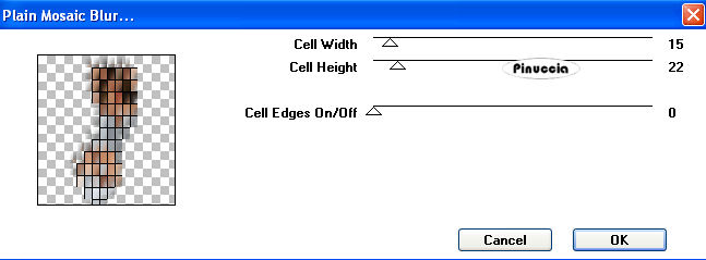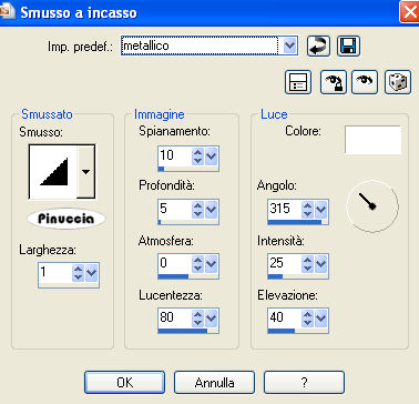 qui puoi trovare qualche risposta ai tuoi dubbi. Se l'argomento che ti interessa non è presente, ti prego di segnalarmelo. Per tradurre questo tutorial ho usato PSP X. Occorrente: un tube a scelta che non contenga il colore nero. I tubes che ho usato per i miei esempi sono di Terry ©NitroComix e Lori Rhae. Filtro: Toadies - Plain Mosaic Blur qui Apri il tuo tube e vai a Modifica>Copia. Apri una nuova immagine trasparente 500 x 500 pixels. Modifica>Incolla come nuovo livello. Effetti>Plugins>Toadies - Plain Mosaic Blur - 15 - 22 - 0. ![]() Attiva lo strumento Bacchetta magica ![]() ![]() e clicca sulle linee nere per selezionarle. per visualizzare meglio lo spazio ristretto che devi selezionare, ingrandisci l'immagine usando la rotellina del mouse. ![]() Selezione>Modifica>Espandi - 1 pixel. Passa il colore di primo piano a Motivi e seleziona un motivo oro. ![]() se non hai un motivo oro clicca qui Riempi la selezione con il motivo oro.Effetti>Effetti 3D>Smusso a incasso: preset metallico: ![]() Selezione>Deseleziona. Attiva nuovamente il tube e vai a Modifica>Copia. Torna al tuo lavoro e vai a Modifica>Incolla come nuovo livello. Posiziona il tube come ti sembra meglio.Effetti>Effetti 3D>Sfalsa ombra, con un settaggio a tua scelta. Per il mio esempio ho usato i settaggi standard. ![]() ***Livelli>Unisci>Unisci tutto. Aggiungi il tuo nome e/o il tuo watermark e salva in formato jpg. Se vuoi, puoi aggiungere un bordo alla tua immagine. *** Se non vuoi lo sfondo bianco, prima di unire i livelli, riempi il livello di sfondo trasparente con il colore che preferisci.![]() ![]() Se hai problemi o dubbi, o trovi un link non funzionante, o anche soltanto per un saluto, scrivimi. 7 Gennaio 2009 |