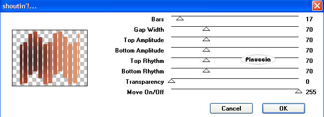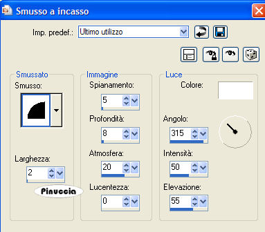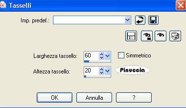 qui puoi trovare qualche risposta ai tuoi dubbi. Se l'argomento che ti interessa non è presente, ti prego di segnalarmelo. Occorrente: Un'immagine a scelta del tuo idolo. Filtri: Graphics Plus qui VM Extravaganza qui Bordermania qui Apri una nuova immagine trasparente 600 x 450 pixels. Scegli due colori dal tube, uno chiaro e uno scuro. Con questi colori crea un gradiente lineare, con i seguenti settaggi: ![]() Riempi l'immagine con questo gradiente.Apri il tube che hai scelto. Immagine>Ridimensiona, 350 pixels di altezza. Modifica>Copia. Torna al tuo lavoro e vai a Modifica>Incolla>Incolla come nuovo livello. Spostalo a sinistra.Livelli>Unisci>Unisci visibile. Regola>Sfocatura>Sfocatura gaussiana, raggio 50. ![]() Effetti>Plugins>Graphics Plus / Vertical mirror. ![]() Effetti>Effetti di distorsione>Tasselli ![]() Effetti>Effetti di bordo>Aumenta. Attiva lo strumento Selezione , rettangolo, sfumatura 0, antialias selezionato.Seleziona ora una casella dall'inizio della seconda striscia fino all'ultima striscia, mantenendo una distanza dai bordi superiore e inferiore di 10 pixels, più o meno come nella schermata sotto: ![]() Modifica>Copia. Selezione>Nessuna selezione. Modifica>Incolla>Incolla come nuovo livello. Effetti>Plugins>VM Extravaganza - Shoutin', con i seguenti settaggi: ![]() ti sembrerà di non vedere cambiamenti visibili all'immagine dopo l'applicazione del filtro. Aspetta e vedrai. Effetti>Effetti 3D>Smusso a incasso, con i seguenti settaggi, colore bianco. ![]() La prima e l'ultima striscia potrebbero essere più strette delle altre. In questo caso puoi eliminarle. Attiva lo strumento Selezione , rettangolo,e seleziona la striscia che vuoi eliminare. Quindi premi sulla tastiera il tasto canc ![]() Ripeti l'operazione se vuoi eliminare altre strisce. Effetti>Effetti 3D>Sfalsa ombra, con i seguenti settaggi, colore nero: ![]() Se vuoi puoi spostare , le strisce a destra e/o a sinistra.Se vuoi puoi anche usare lo strumento Deformazione (puntatore se usi PSP X),per tirare ai lati le strisce. Vedi il mio esempio e fai come preferisci. Attiva nuovamente il tube e vai a Modifica>Copia. Torna al tuo lavoro e vai a Modifica>Incolla>Incolla come nuovo livello. Secondo il tube usato, eventualmente applica l'Effetto Sfalsa ombra, con i settaggi usati in precedenza. Livelli>Unisci>Unisci tutto. Attiva lo strumento Testo , crea come vettore,seleziona un bel font e scrivi il nome del tuo idolo. Immagine>Ruota>Ruota per gradi, 40 gradi a sinistra, tutti i livelli non selezionato. Effetti>Effetti 3D>Sfalsa ombra, con i seguenti settaggi, con il colore nero: ![]() Effetti>Effetti 3D>Sfalsa ombra, con i seguenti settaggi, colore nero: ![]() Posiziona il testo come preferisci.Aggiungi il tuo nome o il tuo watermark. Immagine>Aggiungi bordatura, 2 pixels, simmetriche, con il colore chiaro. Immagine>Aggiungi bordatura, 2 pixels, simmetriche, con il colore scuro. Selezione>Seleziona tutto. Selezione>Modifica>Contrai, di 4 pixels. Selezione>Inverti. Effetti>Plugins>Bordermania - Frame #2: ![]() Salva in formato jpg. ![]() ![]() ![]() Se hai problemi o dubbi, o trovi un link non funzionante, o anche soltanto per un saluto, scrivimi. 24 Aprile 2007 |