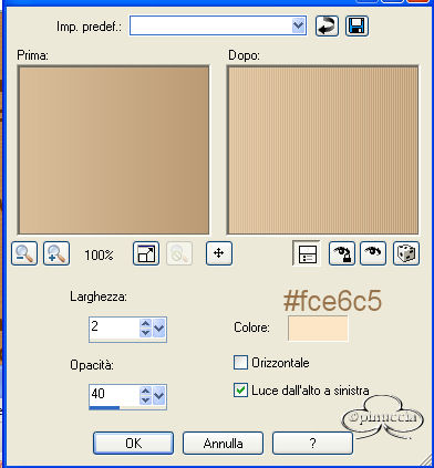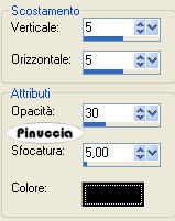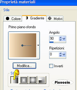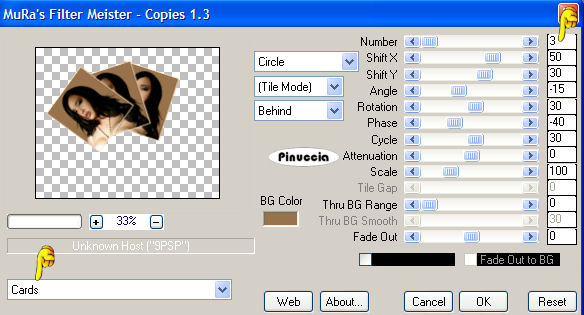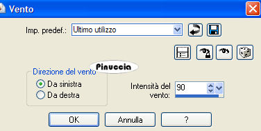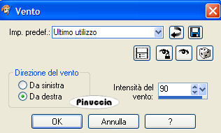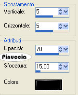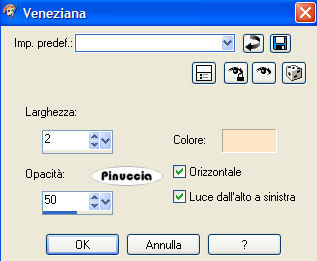 qui puoi trovare qualche risposta ai tuoi dubbi. Se l'argomento che ti interessa non è presente, ti prego di segnalarmelo. Occorrente: Materiale qui Filtri: Filters Unlimited 2 qui Mura's Meister - Copies qui Importa il pennello in PSP. Apri il tube in PSP. Apri una nuova immagine trasparente 550 x 450 pixels. Imposta il colore di primo piano con #fce6c5, e il colore di sfondo con #98724a. Se stai usando un altro tube, scegli da questo un colore chiaro e un colore scuro. Passa il colore di primo piano a Gradiente di primo piano/sfondo con i seguenti settaggi: ![]() Riempi l'immagine trasparente con questo gradiente.Effetti>effetti di trama>Veneziana, con i seguenti settaggi e con il colore chiaro, orizzontale non selezionato, luce dall'alto a sinistra selezionato: ![]() Se stai usando altri colori, assicurati che il colore scuro si trovi a destra e quello chiaro a sinistra. Regola>Messa a fuoco>Metti a fuoco. Livelli>Nuovo livello raster. Attiva lo strumento Selezione , rettangolo,e traccia una striscia in basso, come mostrato nella schermata sotto: ![]() Riempi la striscia con il colore scuro.Effetti>Effetti di trama>Veneziana, con i seguenti settaggi, e con il colore chiaro, orizzontale e luce dall'alto a sinistra selezionati: ![]() Selezione>Nessuna selezione. Livelli>Duplica. Applica alla copia del livello (che è quello superiore) l'effetto sfalsa ombra: Effetti>Effetti 3D>Sfalsa ombra: ![]() Ripeti l'Effetto Sfalsa ombra, ma cambiando verticale e orizzontale a -1. Attiva il livello sottostante (il livello originale). Immagine>Ruota a sinistra. Se stai usando PSP 9, Immagine>Ruota>Ruota di 90 gradi in senso antiorario. Adesso l'immagine è tutta ruotata a sinistra. Effetti>Effetti di distorsione>Vento, da destra, intensità del vento 90. ![]() Chiudi il livello inferiore. Livelli>Unisci>Unisci visibile. Rendi nuovamente visibile il livello inferiore. Immagine>Ruota a destra. Se stai usando PSP 9: Immagine>Ruota>Ruota 90 gradi in senso orario. Adesso l'immagine è ritornata normale. Attiva il tube che hai scelto per eseguire il tutorial. Attiva lo strumento Selezione e seleziona il viso con una piccola parte sottostante:![]() Modifica>Copia. Modifica>Incolla>Incolla come nuova immagine. Fai in modo che le dimensioni siano pressappoco come nel mio esempio. Livelli>Nuovo livello raster. Livelli>Disponi>Sposta giù. Riempi con il colore scuro.Immagine>Aggiungi bordatura, 2 pixels, simmetriche, con il colore chiaro. Modifica>Copia. Torna al tuo lavoro e vai a Modifica>Incolla come nuovo livello. Lascia l'immagine dove sta. Effetti>Plugins>Mura's Meister - Copies: Seleziona "Cards" e imposta il numero a 3, quindi clicca ok. ![]() Immagine>Ridimensiona, e ridimensiona le piccole immagini quanto necessario. Sposta le immagini a sinistra.Effetti>Effetti 3D>Sfalsa ombra, con i seguenti settaggi, colore nero: ![]() Attiva nuovamente il tube (ricordati di togliere la selezione: Selezione>Nessuna selezione) e vai a Modifica>Copia. Torna al tuo lavoro e vai a Modifica>Incolla>Incolla come nuovo livello. Spostalo lasciando un piccolo spazio dal bordo.Livelli>Duplica. Effetti>Effetti 3D>Sfalsa ombra, con i seguenti settaggi, colore nero: ![]() Attiva il livello sottostante (il livello originale del tube). Effetti>Effetti di distorsione>Vento, da destra, intensità del vento 90. ![]() Livelli>Unisci>Unisci tutto. Livelli>Nuovo livello raster. Attiva lo strumento Pennello ![]() cerca e seleziona il pennello "Blokjes" e clicca in alto a sinistra con il tasto destro del mouse, per applicare il pennello con il colore scuro di sfondo. Livelli>Duplica. Immagine>Capovolgi. Livelli>Unisci>Unisci giù. Effetti>Effetti 3D>Sfalsa ombra, con i seguenti settaggi, colore nero: ![]() Attiva lo strumento Testo e, con un font a scelta, scrivi il tuo testo sulla tag.Effetti>Effetti 3D>Sfalsa ombra, con i seguenti settaggi, colore nero: ![]() Livelli>Duplica. Attiva il livello sottostante (il livello originale del testo). Effetti>Effetti di distorsione>Vento, da sinistra, intensità del vento 90. ![]() Aggiungi il tuo nome o il tuo watermark. Immagine>Aggiungi bordatura, 2 pixels, simmetriche, con il colore scuro. Immagine>Aggiungi bordatura, 2 pixels, simmetriche, con il colore chiaro. Immagine>Aggiungi bordatura, 2 pixels, simmetriche, con il colore scuro. Effetti>Plugins>Filters Unlimited 2 - Color Filters - Color booster. ![]() Salva in formato jpg. ![]() ![]() Se hai problemi o dubbi, o trovi un link non funzionante, o anche soltanto per un saluto, scrivimi. |