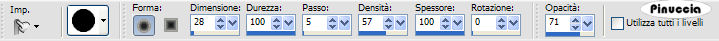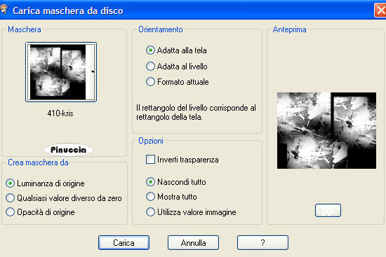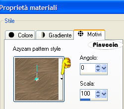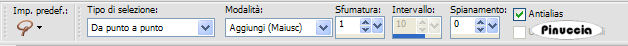 qui puoi trovare qualche risposta ai tuoi dubbi. Se l'argomento che ti interessa non è presente, ti prego di segnalarmelo. Questo tutorial è stato scritto con PSP XI. Per tradurlo, l'ho eseguito con PSP X. Occorrente: Materiale qui Se vuoi condividere i tubes, lasciali al loro stato originale. La maschera è di Ms Kris. Filtri: Graphics Plus qui Metti la maschera nella cartella Maschere di PSP. Apri il motivo "Azyzam pattern style" e minimizzalo nella tua area di lavoro. Lo troverai nella lista dei motivi disponibili, quando ti servirà. Apri i tubes e il file di sfondo in PSP. Attiva il file di sfondo "Azyzam background style". Questa sarà la tua area di lavoro. Livelli>Duplica. Immagine>Rifletti. Livelli>Carica/Salva maschera>Carica maschera da disco. Cerca e carica la maschera 410-kris: ![]() Livelli>Unisci>Unisci gruppo. Attiva il tube Marif_2007_07Juillet_lady0324, e vai a Modifica>copia. Torna al tuo lavoro e vai a Modifica>Incolla come nuovo livello. Per il momento, lascia il tube dove sta. Attiva lo strumento Sfumino: ![]() con i seguenti settaggi: ![]() Posiziona la punta del pennello sul lato destro del tube, dove la giacca ha il bordo netto: ![]() Sfuma il nero della giacca sulla destra tenendo premuto il tasto sinistro del mouse, come fosse una matita. ![]() Attiva lo strumento Selezione a mano libera , punto a punto, sfumatura 1, tolleranza 0, antialias selezionato,![]() e seleziona la parte della giacca in eccesso. ![]() Clicca sulla tastiera il tasto canc. ![]() Selezione>Deseleziona. Sistema adeguatamente il tube.![]() Attiva il tube Marif_2007_06Juin_misted_Dior06, e vai a Modifica>Copia. Torna al tuo lavoro e vai a Modifica>Incolla come nuovo livello. Spostalo in basso a sinistra, come nel mio esempio.Il bordo. Immagine>Aggiungi bordatura, 1 pixel, simmetriche, con il colore nero. Immagine>Aggiungi bordatura, 55 pixels, simmetriche, con il colore #5a4c3d. Seleziona questo bordo con la bacchetta magica ![]() ![]() Effetti>Plugins>Graphics Plus - Cross Shadow, con i settaggi standard, due volte. ![]() Livelli>Innalza selezione a livello. Passa il colore di primo piano a Motivi; cerca e seleziona nella lista il motivo "Azyzam pattern style", ![]() Riempi il bordo con questo motivo.Abbassa l'opacità del livello al 45%. Effetti>Plugins>Graphics Plus - Cross Shadow, con i settaggi standard. Selezione>Deseleziona. Immagine>Aggiungi bordatura, 1 pixel, simmetriche, con il colore nero. Selezione>Seleziona tutto. Selezione>modifica>Contrai di 20 pixels. Livelli>nuovo livello raster. Riempi con #5a4c3d.Selezione>modifica>Contrai, di 10 pixels. Premi sulla tastiera il tasot CANC ![]() Selezione>Deseleziona. Seleziona con la bacchetta magica il piccolo bordo.![]() Effetti>Plugins>Graphics Plus - Cross Shadow, con i settaggi standard. Effetti>Effetti 3D>Smusso a rilievo ![]() Attiva il file di testo e vai a Modifica>Copia. Torna al tuo lavoro e vai a Modifica>Incolla>Incolla come nuovo livello. Spostalo in alto a sinistra.Aggiungi il tuo nome e/o il tuo watermark e salva in formato jpg. ![]() Se hai problemi o dubbi, o trovi un link non funzionante, o anche soltanto per un saluto, scrivimi. 21 Luglio 2007 |