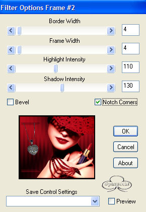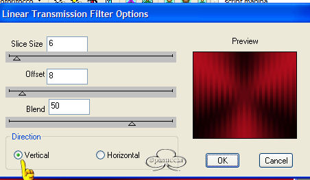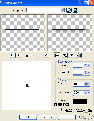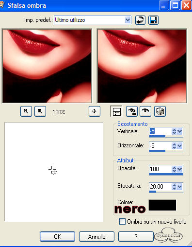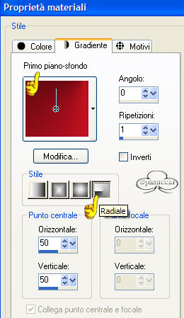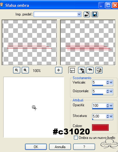 Occorrente: Materiale qui Filtri: Dsb Flux qui Bordermania qui Apri una nuova immagine trasparente 600 x 500. Imposta il colore di primo piano con il nero e il colore di sfondo con #c31020. Passa il primo piano a gradiente di primo piano/sfondo, con i seguenti settaggi: ![]() Riempi l'immagine con il gradiente.Regola>Sfocatura>Sfocatura gaussiana, raggio 40. Effetti>Plugins>Dsb Flux / Linear Transmission, con i seguenti settaggi: ![]() Effetti>Effetti di bordo/Aumenta. Apri il tube della donna e vai a Modifica>Incolla>incolla come nuovo livello. Immagine>Rifletti. Sposta il tube sulla destra, contro il bordo.Effetti>Effetti 3D>Sfalsa ombra, con i seguenti settaggi: ![]() Ripeti ancora una volta questo Effetto Sfalsa ombra. Livelli>Nuovo livello raster. Selezione>Carica/Salva selezione>Carica selezione da disco Cerca e carica la selezione Sel1-Quinta ![]() Riempi la selezione con il nero.Selezione>Nessuna selezione. Livelli>Duplica e duplica questo livello. Livelli>Unisci>Unisci gių. Effetti>Effetti 3D>Sfalsa ombra, con i seguenti settaggi: ![]() Livelli>Nuovo livello raster. Selezione>Carica/Salva selezione/Carica selezione da disco carica la selezione Sel1-Quinta. Riempi la selezione con il colore di sfondo (#c31020).Livelli>Duplica. Livelli>Unisci>Unisci gių. Immagine>Capovolgi. Effetti>Effetti 3D>Sfalsa ombra, con i seguenti settaggi: ![]() Livelli>Unisci>Unisci gių. Spostali a sinistra fino a toccare la prima lineetta dello sfondovedi come esempio la tag finale. Apri il tube dei cuori e vai a Modifica>Copia. Torna al tuo lavoro e vai a Modifica>Incolla>Incolla come nuovo livello. "Appendi" i cuori sulle lineette superiori. Livelli>Unisci>Unisci tutto. Effetti>Plugins>Bordermania / Frame = 2: ![]() Ripeti questo Effetto ancora due volte, con gli stessi settaggi: Aggiungi un watermark e un testo, o usa il pennello contenuto nello zip. Livelli>Unisci>Unisci tutto. Per fare l'animazione: Copia l'immagine: Modifica>Copia. Apri Animation Shop e vai a Modifica>Incolla>Incolla come nuova animazione. Duplica l'immagine (Modifica>Duplica) fino ad ottenere 8 fotogrammi. Seleziona tutti i fotogrammi premendo Ctrl+A oppure Modifica>Seleziona tutto. Apri l'animazione inclusa nello zip Silver.gif. Seleziona tutti i fotogrammi premendo Ctrl+A oppure Modifica>Seleziona tutto. poi Modifica>Propaga incolla. 11. Con la freccia bianca attiva