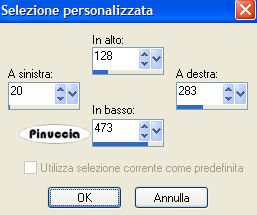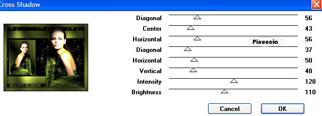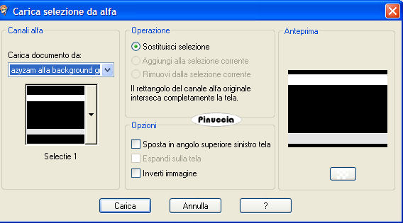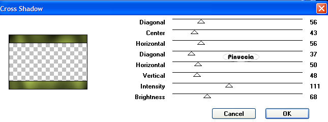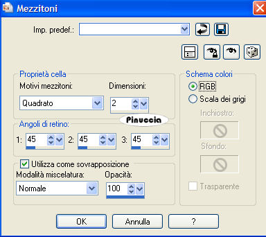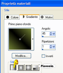 qui puoi trovare qualche risposta ai tuoi dubbi. Se l'argomento che ti interessa non è presente, ti prego di segnalarmelo. Questo tutorial è stato scritto con PSP X. Occorrente: Materiale qui Il bel tube usato in questo tutorial è di Jet. Mantieni il tube al suo stato originale. Filtro Graphics Plus qui Apri tutto il materiale in PSP. Imposta il colore di primo piano con #738134, e il colore di sfondo con #000000. Apri l'immagine di sfondo "azyzam alfa background green". Questa sarà la base del tuo lavoro, e contiene un canale alfa. Livelli>Nuovo livello raster. Selezione>Carica/Salva selezione>Carica selezione da canale alfa. La selezione è già pronta, devi soltanto cliccare su Carica. ![]() Riempi la selezione con il nero.il nero è impostato come colore di sfondo, quindi per riempire devi cliccare con il tasto destro del mouse. Selezione>Modifica>Contrai, di 2 pixels. Premi sulla tastiera il tasto CANC ![]() Mantieni selezionato. Riempi con #738134 (colore di primo piano).Se necessario, clicca un paio di volte, in modo che la selezione sia ben riempita. Mantieni selezionato. Effetti>Plugins>Graphics Plus - Cross Shadow. ![]() Mantieni selezionato. Effetti>Effetti artistici>Mezzitoni: ![]() Selezione>Deseleziona. Attiva lo strumento Selezione , rettangolo,selezione personalizzata , con i seguenti settaggi:![]() Livelli>Nuovo livello raster. Riempi con il colore verde di primo piano.Selezione>Modifica>Contrai, di 2 pixels. Passa il colore di primo piano a Gradiente di primo piano/sfondo, con i seguenti settaggi. ![]() Riempi con questo gradiente.Apri il tube di Jet "Jet-woman09-juni-2007". Posizionati sul livello del tube e vai a Modifica>Copia. Torna al tuo lavoro e vai a Modifica>Incolla come nuovo livello. Immagine>Rifletti. Immagine>Ridimensiona, 4 volte all'85%, bicubica, tutti i livelli non selezionato. ![]() Sistema il tube nella selezione.Selezione>Inverti. Premi sulla tastiera il tasto canc ![]() Selezione>Deseleziona. Modifica>Incolla come nuovo livello (il tube di Jet è ancora in memoria). Spostalo nell'angolo in basso a destra.Effetti>Effetti 3D>Sfalsa ombra, con i seguenti settaggi, colore nero. ![]() Ripeti l'Effetto Sfalsa ombra, ma cambiando verticale e orizzontale a -5. Controlla che tutto sia al posto giusto. Livelli>Unisci>Unisci tutto. Immagine>Aggiungi bordatura, 2 pixels, simmetriche, con il colore #738134 (colore di primo piano). come aggiungere velocemente i bordi con i colori impostati nella paletta dei materiali, vedi qui Immagine>Aggiungi bordatura, 2 pixels, simmetriche, con il colore di sfondo #000000. Immagine>Aggiungi bordatura, 2 pixels, simmetriche, con il colore di primo piano #738134. Immagine>Aggiungi bordatura, 2 pixels, simmetriche, con il colore di sfondo #000000. Immagine>Aggiungi bordatura, 22 pixels, simmetriche, con il colore #5a6627. Seleziona questo bordo con la bacchetta magica , così impostata:![]() Effetti>Plugins>Graphics Plus - Cross Shadow, con i seguenti settaggi: ![]() Ripeti l'Effetto Cross Shadow. Selezione>Deseleziona. Immagine>Aggiungi bordatura, 10 pixels, simmetriche, con il colore nero. Attiva il file con il testo e vai a Modifica>Copia. Torna al tuo lavoro e vai a Modifica>Incolla come nuovo livello. Aggiungi la tua firma e salva in formato jpg. ![]() Se hai problemi o dubbi, o trovi un link non funzionante, o anche soltanto per un saluto, scrivimi. 25 Giugno 2007 |