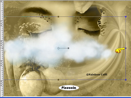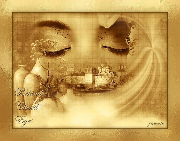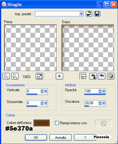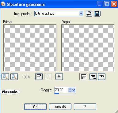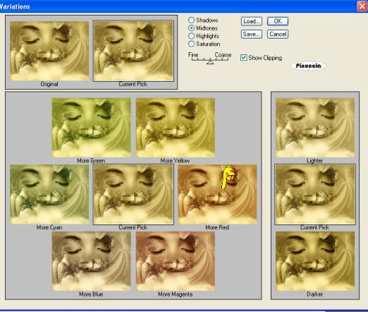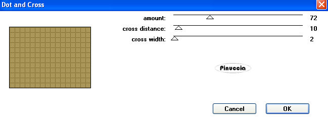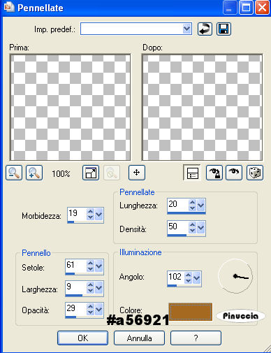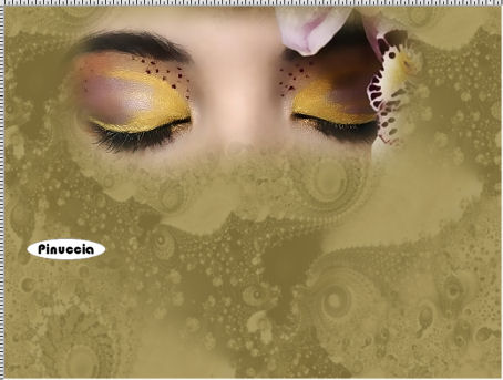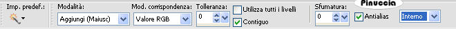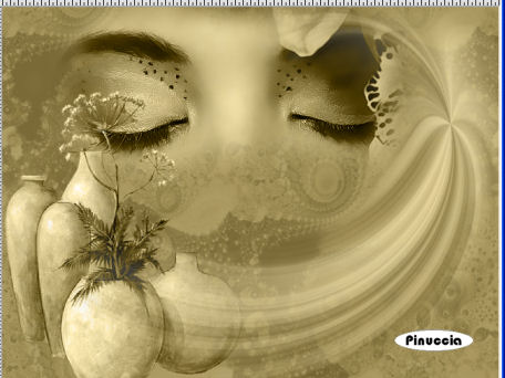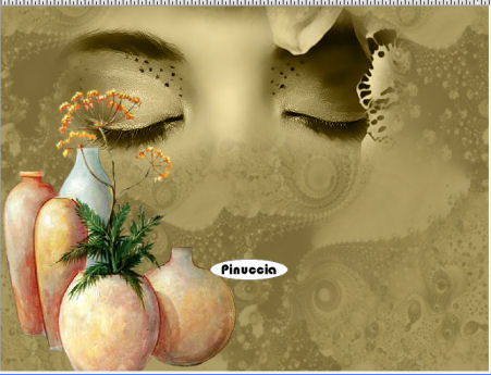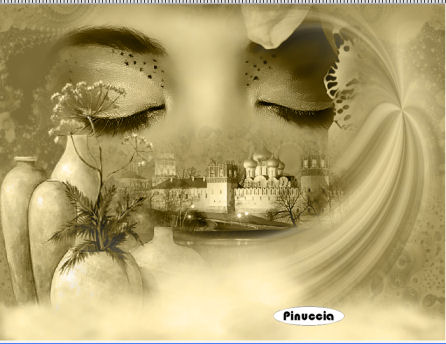 qui puoi trovare qualche risposta ai tuoi dubbi. Se l'argomento che ti interessa non è presente, ti prego di segnalarmelo. Occorrente: Materiale qui Filtri: Penta.com Dot and Cross qui Ajust Variations qui Se condividi i tubes, per favore lascia intatto il copyright. Apri i tubes in PSP. Apri una nuova immagine trasparente 640 x 480 pixels. Riempila con il colore #988446.Livelli>Nuovo livello raster. Selezione>seleziona tutto. Apri il frattale di sfondo (Les004_fractale_image001) e vai a Modifica>Copia. Torna al tuo lavoro e vai a Modifica>Incolla>Incolla nella selezione. Nella paletta dei livelli abbassa l'opacità al 20%. Selezione>Nessuna selezione. Apri il tube con gli occhi (Marif_2006_juillet_misted_yeux002) e vai a Modifica>Copia. Torna al tuo lavoro e vai a Modifica>Incolla>Incolla come nuovo livello. Spostalo in alto un po' a sinistra.![]() Nella paletta dei livelli cambia la modalità di miscelatura in Luminanza (Esistente). Apri il tube con i vasi (Pot) e vai a Modifica>Copia. Torna al tuo lavoro e vai a Modifica>Incolla>Incolla come nuovo livello. Spostalo in basso a sinistra. ![]() Nella paletta dei livelli cambia la modalità di miscelatura in Luminanza (esistente). Apri il file dei raggi di colore (V-RaysOfColor1) e vai a Modifica>Copia. Torna al tuo lavoro e vai a Modifica>Incolla>Incolla come nuovo livello. Immagine>Rifletti. Nella paletta dei livelli cambia la modalità di miscelatura in Luminanza (esistente). Sposta l'immagine ![]() come mostrato nell'esempio. ![]() Apri il tube delle nuvole (V-cloudFormation) e vai a Modifica>Copia. Torna al tuo lavoro e vai a Modifica>Incolla>Incolla come nuovo livello. Mettilo a sinistra contro il bordo.![]() Attiva lo strumento Deformazione ![]() Per chi usa PSP X lo strumento ha preso il nome di puntatore ![]() e allarga l'immagine fino al lato destro. ![]() Adesso spostalo in basso come nel mio esempio, e il testo sparirà. Nella paletta dei livelli cambia la modalità di miscelatura in Luminanza (esistente). Seleziona il livello Raster 2, quello con il frattale. Apri il tube del palazzo (ooster-palais) e vai a Modifica>Copia. Ritorna al tuo lavoro, e vai a Modifica>Incolla>Incolla come nuovo livello. Spostalo un po' in basso e un po' sulla destra.![]() Controlla che tutti i file sia correttamente posizionati. Questo è il momento per eventuali piccoli spostamenti. Se tutto è a posto vai a Livelli>Unisci>Unisci tutto. Livelli>Nuovo livello raster. Riempilo con il colore #988446.Effetti>Plugins>Penta.com / Dot and cross: ![]() Nella paletta dei livelli cambia la modalità di miscelatura in Sovrapponi e abbassa l'opacità al 50%. Livelli>Unisci>Unisci tutto. Effetti>Plugins>Ajust Variation. Clicca 1 volta su "more red". ![]() Livelli>Innalza livello di sfondo. Modifica>Copia (l'immagine resterà in memoria). Immagine>Aggiungi bordatura, 1 pixel, simmetriche, con il colore #824604. Immagine>Aggiungi bordatura, 50 pixels, simmetriche, con il colore #988446. Attiva lo strumento bacchetta magica ![]() ![]() Seleziona il bordo. Livelli>Nuovo livello raster. Modifica>Incolla>Incolla nella selezione (stai incollando l'immagine che hai copiato prima). Regola>Sfocatura>Sfocatura gaussiana, raggio 20. ![]() Livelli>Duplica. Selezione>Carica/Salva selezione>Salva selezione su canale alpha. Selezione>Nessuna selezione. Immagine>Capovolgi. Livelli>Unisci>Unisci giù. Selezione>Carica/Salva selezione>Carica selezione da canale alpha. Carica la selezione che hai appena salvato. Effetti>Effetti tecniche di disegno>Pennellate: colore #a56921 o un altro colore di tua scelta. ![]() Selezione>Inverti. Effetti>Effetti 3D>Ritaglio: ![]() Immagine>Aggiungi bordatura, 1 pixel, simmetriche, con il colore #824604. Aggiungi il tuo testo e il nome o il watermark. Livelli>Unisci>Unisci tutto e salva il formato jpg. ![]() Se hai problemi o dubbi, o trovi un link non funzionante, o anche soltanto per un saluto, scrivimi. Luglio 2006 |