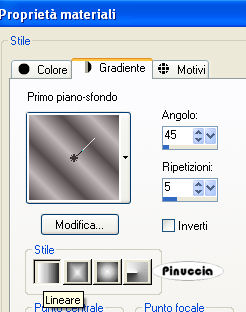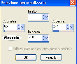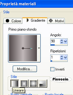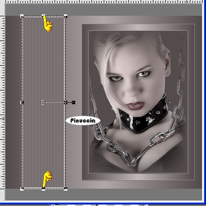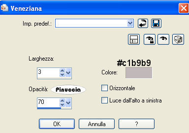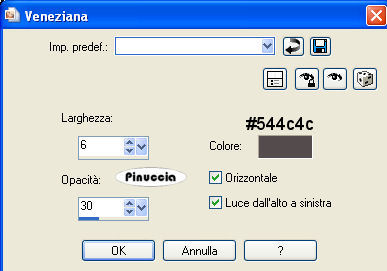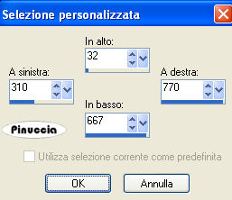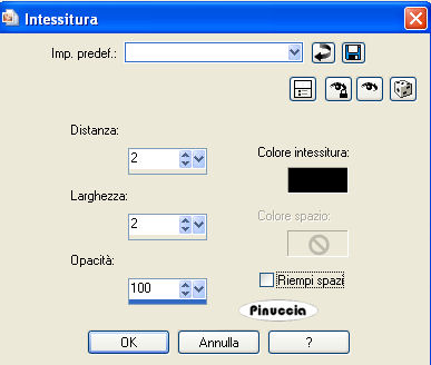 qui puoi trovare qualche risposta ai tuoi dubbi. Se l'argomento che ti interessa non è presente, ti prego di segnalarmelo. Questo tutorial è stato scritto con PSP XI. Per tradurlo, l'ho eseguito con PSP X. Occorrente: Materiale qui Se intendi condividere i tubes, mantienili al loro stato originale. Apri i tubes in PSP. 1. Imposta il colore di primo piano con il colore scuro #544c4c, e il colore di sfondo con il colore chiaro #c1b9b9. Apri una nuova immagine trasparente 400 x 575 pixels, e riempila con il colore scuro di primo piano.Selezione>Seleziona tutto. Attiva il tube mc3154 e vai a Modifica>Copia. Torna al tuo lavoro e vai a Modifica>Incolla nella selezione. Selezione>Deseleziona. Immagine>Aggiungi bordatura, 1 pixel, simmetriche, con il colore chiaro di sfondo. per aggiungere velocemente i bordi con i colori impostati nella paletta dei materiali, vedi qui Immagine>Aggiungi bordatura, 1 pixel, simmetriche, con il colore scuro di primo piano. Immagine>Aggiungi bordatura, 1 pixel, simmetriche, con il colore chiaro di sfondo. Immagine>Aggiungi bordatura, 25 pixels, simmetriche, con il colore scuro di primo piano. Seleziona questo bordo con la bacchetta magica così impostata: ![]() Passa il colore di primo piano a Gradiente di primo piano/sfondo, stile lineare, con i seguenti settaggi: ![]() Riempi la selezione con questo gradiente.Selezione>Deseleziona. Immagine>Aggiungi bordatura, 1 pixel, simmetriche, con il colore chiaro di sfondo. Immagine>Aggiungi bordatura, 1 pixel, simmetriche, con il colore scuro di primo piano. Metti da parte questa immagine per il momento. ![]() 2. Apri una nuova immagine trasparente 800 x 700, e riempila con il gradiente.Regola>Sfocatura>Sfocatura gaussiana, raggio 10. ![]() Effetti>effetti di trama>Veneziana, con i seguenti settaggi: ![]() Livelli>Nuovo livello raster. Attiva lo strumento Selezione , rettangolo,selezione personalizzata , con i seguenti settaggi:![]() Attiva l'immagine che hai messo da parte prima e vai a Modifica>Copia. Torna all'immagine più grande (800x700) e vai a Modifica>Incolla nella selezione. Selezione>Deseleziona. Livelli>Nuovo livello raster. Attiva lo strumento selezione personalizzata ![]() con i seguenti settaggi: ![]() Riempi la selezione con il colore chiaro di sfondo.Riporta il colore di primo piano al colore scuro impostato all'inizio del tutorial. Selezione>Modifica>Contrai, di 1 pixel, e riempi con il colore scuro.Selezione>Modifica>Contrai, di 1 pixel, e riempi con il colore chiaro.Selezione>Modifica>Contrai, di 4 pixels, e riempi con il colore scuro.Effetti>Effetti di trama>Veneziana, con i seguenti settaggi, con il colore chiaro: ![]() Selezione>Deseleziona. Attiva lo strumento Puntatore ![]() Deformazione se stai usando PSP 9.e "tira" la striscia in alto e in basso in modo che non si vedano i bordi. ![]() 3. Attiva il tube "Stitch white" e vai a Modifica>Copia. Torna al tuo lavoro e vai a Modifica>Incolla come nuovo livello. Spostalo sul lato sinistro vicino alla striscia verticale.Livelli>Duplica, e sposta il duplicato a destra della striscia. Attiva il tube "Buttons" e vai a Modifica>Copia. Torna al tuo lavoro e vai a Modifica>Incolla come nuovo livello. Sposta questo tube a sinistra, sulla striscia verticale.Attiva il tube "Flower curls" e vai a Modifica>Copia. Torna al tuo lavoro e vai a Modifica>Incolla come nuovo livello. Sposta questo tube al centro della striscia verticale.Attiva il tube "Azyzam name plates" e vai a Modifica>Copia. Torna al tuo lavoro e vai a Modifica>Incolla come nuovo livello. Sposta anche questo tube sulla striscia verticale.Controlla che tutto sia al posto giusto e, quando sei soddisfatto del risultato continua il tutorial aggiungendo i bordi. Anche se non unisci i livelli, l'azione di aggiunta del primo bordo appiattirà automaticamente i livelli esistenti in un unico livello di sfondo. 3. Immagine>Aggiungi bordatura, 4 pixels, simmetriche, con il colore scuro. Immagine>Aggiungi bordatura, 15 pixels, simmetriche, con il colore chiaro. Immagine>Aggiungi bordatura, 4 pixels, simmetriche, con il colore scuro. Seleziona il bordo chiaro da 15 pixels con la bacchetta magica così impostata: ![]() Passa il colore di primo piano a Gradiente lineare, con i seguenti settaggi: ![]() Riempi la selezione con questo gradiente.Effetti>Effetti di trama>Intessitura, con i seguenti settaggi, colore dell'intessitura #000000. ![]() Mantieni selezionato. Immagine>Ruota a destra. se stai usando PSP 9: Immagine>Ruota>90 gradi in senso orario. Ripeti l'Effetto Intessitura, con gli stessi settaggi. Immagine>Ruota a sinistra. se stai usando PSP 9: Immagine>Ruota>90 gradi in senso antiorario. Adesso l'immagine è nuovamente diritta. Selezione>Deseleziona. Attiva il tube dei fiocchi "bows" e vai a Modifica>Copia. Torna al tuo lavoro e vai a Modifica>Incolla come nuovo livello. Sposta il tube a destra sugli angoli superiori della foto della ragazza.Aggiungi il tuo testo alle targhette. Puoi usare il font fornito con il tutorial o quello che preferisci. Salva in formato jpg. ![]() Se hai problemi o dubbi, o trovi un link non funzionante, o anche soltanto per un saluto, scrivimi. 21 Luglio 2007 |