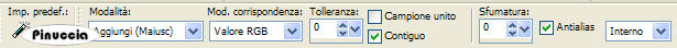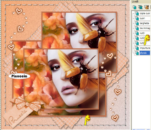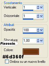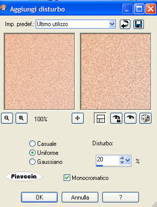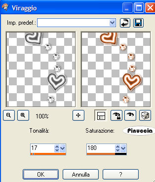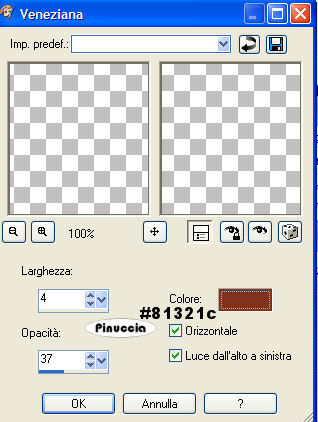 qui puoi trovare qualche risposta ai tuoi dubbi. Se l'argomento che ti interessa non è presente, ti prego di segnalarmelo. Materiale qui Se vuoi condividere i tubes, per favore lascia intatto il livello del copyright. Apri una nuova immagine trasparente 650 x 650 pixels. Imposta il colore di primo piano con #faa975 e il colore di sfondo con #dfd4d5. Crea un gradiente di primo piano/sfondo, lineare, con i seguenti settaggi: ![]() Riempi l'immagine con questo gradiente.Regola>Aggiunti/rimuovi disturbo>Aggiungi disturbo: ![]() Metti da parte per il momento questo sfondo e apri l'immagine del viso "Colorful face". Immagine>Aggiungi bordatura, 1 pixel, simmetriche, con il colore #81321c. Immagine>Aggiungi bordatura, 5 pixels, simmetriche, con il colore di primo piano (#faa975). Immagine>Aggiungi bordatura, 1 pixels, simmetriche, con il colore #81321c. Seleziona il bordo centrale di 5 pixels, con la bacchetta magica , antialias interno:![]() Effetti>Effetti di trama>Veneziana, con i seguenti settaggi, colore #81321c. ![]() Ripeti l'Effetto Veneziana, ma con Orizzontale NON selezionato. Selezione>Nessuna selezione. Copia l'immagine: Modifica>Copia. Riprendi la tua immagine di sfondo e vai a Modifica>Incolla>Incolla come nuovo livello. Spostala un po' in basso, vedi il mio esempio.Livelli>Duplica. Immagine>Ridimensiona, dell'80%, tutti i livelli non selezionato. Spostala in alto a destra, vedi il mio esempio.Livelli>Duplica. Spostala a sinistra, un po' più in basso, vedi il mio esempio.![]() A tutte e tre le immagini: Effetti>Effetti 3D>Sfalsa ombra, con i seguenti settaggi, colore nero: ![]() Dopo aver applicato l'effetto Sfalsa ombra ai tre livelli delle immagini, ritorna sul livello superiore. Livelli>Unisci>unisci giù. Ripeti Livelli>Unisci>Unisci giù. Adesso hai le tre immagini in un unico livello. Control X e poi Control L, e avrai l'immagine perfettamente al centro. (con Control X hai tagliato l'immagine e con Control L hai incollato l'immagine come nuovo livello, centrata sulla tela). Elimina il livello rimasto vuoto. Attiva il livello superiore. Apri il tube "Naaisteken" e vai a Modifica>Copia. Torna al tuo lavoro e vai a Modifica>Incolla>Incolla come nuovo livello. Spostalo in alto, vedi l'esempio della tag finale.Livelli>Duplica. Immagine>Capovolgi. Livelli>Unisci>Unisci giù. Livelli>Duplica. Immagine>Ruota>Ruota per gradi, 90 gradi a destra. Con lo strumento Spostamento sistema le impunture, in modo che formino una cornice perfetta.Livelli>Unisci>Unisci giù. Contro x - Control L. Cancella il livello rimasto vuoto. Attiva il livello superiore. Apri il tube "Heartaccents2" e seleziona i cuori di sinistra.Modifica>Copia. Torna al tuo lavoro e vai a Modifica>Incolla>Incolla come nuovo livello. Sposta i cuori nell'angolo in basso a destra.Regola>Saturazione e Tonalità>Viraggio: ![]() Livelli>Duplica. Immagine>Rifletti. Spostali in alto a sinistra.Nella paletta dei livelli attiva il livello inferiore. Apri il tube "Ruit" e vai a Modifica>Copia. Torna al tuo lavoro e vai a Modifica>Incolla>Incolla come nuovo livello. Effetti>Effetti 3D>Sfalsa ombra, con i seguenti settaggi, colore nero: ![]() Livelli>Duplica. Immagine>Ruota>Ruota per gradi, 5 gradi a destra. Immagine>Duplica. Immagine>Ruota>Ruota per gradi, 10 gradi a sinistra. Nella paletta dei livelli attiva livello delle tre immagini. Immagine>Ridimensiona, del 95%, tutti i livelli non selezionato. Apri il tube della targhetta "scraptube38_joluvsdogs" e vai a Modifica>Copia. Torna al tuo lavoro e vai a Modifica>Incolla>Incolla come nuovo livello. Spostalo in basso a sinistra.Passa il colore di primo piano a colore di sfondo e scrivi il tuo nome sulla targhetta. Effetti>Effetti 3D>Sfalsa ombra, con i seguenti settaggi, colore #6d360f. ![]() Nella paletta dei livelli porta il livello delle impunture (dovrebbe essere Raster 5), sotto quello dei tre tubes "Ruit". ![]() Immagine>Aggiungi bordatura, 1 pixel, simmetriche, con il colore #81321c. Immagine>Aggiungi bordatura, 10 pixels, simmetriche, con il colore #faa975. Immagine>Aggiungi bordatura, 1 pixels, simmetriche, con il colore #81321c. Seleziona il bordo centrale di 10 pixels, con la bacchetta magica , antialias interno:![]() Effetti>Effetti di trama>Veneziana, con i seguenti settaggi, colore #81321c. ![]() Ripeti l'Effetto Veneziana, ma con Orizzontale NON selezionato. Selezione>Nessuna selezione. Aggiungi, se vuoi, il tuo watermark e salva in formato jpg. ![]() Se hai problemi o dubbi, o trovi un link non funzionante, o anche soltanto per un saluto, scrivimi. Novembre 2006 |