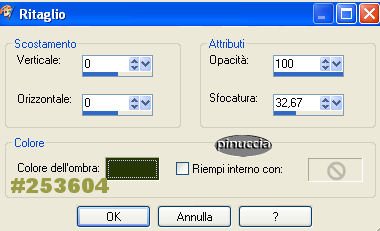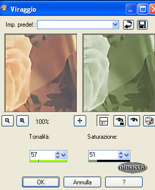 qui puoi trovare qualche risposta ai tuoi dubbi. Se l'argomento che ti interessa non è presente, ti prego di segnalarmelo. Occorrente: Materiale qui Filtri: Ajust Variations qui Penta.com Color dot Simple 4way Average Graphics Plus Cross Shadow Se vuoi condividere i tubes, per favore lascia intatto il livello del copyright. Apri i tubes in PSP. Apri il frattale. Posizionati sul livello raster 1 e vai a Modifica>Copia. Quindi Modifica>Incolla>Incolla come nuova immagine. Questa sarà l'immagine sulla quale continuerai a lavorare. Nuovo livello raster. Riempi il livello con il colore #334e05.Livelli>Disponi>Sposta sotto. Livelli>Nuovo livello raster. Seleziona tutto. Apri il tube Marif decor 022 e vai a Modifica>copia. Torna al tuo lavoro e vai a Modifica>Incolla>Incolla nella selezione. Livelli>Disponi>Porta in alto. Regola>Saturazione e tonalità>Viraggio: ![]() Nella paletta dei livelli cambia la modalità di miscelatura in Sovrapponi. Apri il tube "Marif oefentube" e vai a Modifica>copia. Torna al tuo lavoro e vai a Modifica>Incolla>Incolla come nuovo livello. Spostalo in basso al centro.Vedi come esempio la tag finale. Apri il tube Marif Fleurs034 e vai a Modifica>Copia. Torna al tuo lavoro e vai a Modifica>Incolla>Incolla come nuovo livello. Posizionalo nell'angolo superiore destro.Apri il tube Marif Fleurs031 e vai a Modifica>Copia. Torna al tuo lavoro e vai a Modifica>Incolla>Incolla come nuovo livello. Posizionalo ![]() Apri il tube di Marcio con il viso e vai a Modifica>Copia. Torna al tuo lavoro e vai a Modifica>Incolla>Incolla come nuovo livello. Spostalo completamente a sinistra.Controlla che ogni tube sia al suo posto. Dovresti avere qualcosa di simile a questo: ![]() Attiva lo strumento Gomma e cancella dal viso della donnai segni degli altri tubes (ricordati di posizionarti sul livello cui appartengono i segni da cancellare). Se tutto è a posto: Livelli>Unisci>Unisci tutto (appiattisci). Effetti>Plugins>Ajust / Variations. Clicca una volta su More red. Modifica>Copia (così avrai la tua immagine in memoria). Immagine>Aggiungi bordatura, 1 pixel, simmetriche, con il colore #606a20. Immagine>Aggiungi bordatura, 10 pixels, simmetriche, con il colore bianco. Seleziona il bordo con la bacchetta magica ,antialias e interno selezionati, tolleranza e sfumatura 0. Modifica>Incolla>Incolla nella selezione. Regola>Sfocatura>Sfocatura gaussiana, raggio 30. Effetti>Plugins>Penta.com / Color dot con i settaggi standard: ![]() Selezione>Inverti. Effetti>Effetti 3D>Ritaglio, con i seguenti settaggi, colore #253604. ![]() Selezione>Nessuna selezione. Immagine>Aggiungi bordatura, 1 pixel, simmetriche, con il colore #606a20. Immagine>Aggiungi bordatura, 15 pixels, simmetriche, con il colore bianco. Seleziona il bordo con la bacchetta magica ![]() Modifica>Incolla>Incolla nella selezione (la tua immagine è ancora in memoria). Regola>Sfocatura>Sfocatura gaussiana, raggio 30. Effetti>Plugins>Simple / 4way Average. Effetti>Plugins>Graphics Plus / Cross Shadow: ![]() Selezione>Nessuna selezione. Immagine>Aggiungi bordatura, 1 pixel,simmetriche, con il colore #606a20. Immagine>Aggiungi bordatura, 20 pixels, simmetriche, con il colore bianco. Seleziona il bordo con la bacchetta magica .Modifica>Incolla>Incolla nella selezione (la tua immagine è ancora in memoria). Regola>Sfocatura>sfocatura gaussiana, raggio 30. Effetti>Plugins>Penta.com / Color dot, con i settaggi standard. Selezione>Nessuna selezione. Immagine>Aggiungi bordatura, 1 pixel, simmetriche, con il colore #606a20. Aggiungi il tuo nome o il tuo watermark e salva in formato jpg. ![]() Se hai problemi o dubbi, o trovi un link non funzionante, o anche soltanto per un saluto, scrivimi Settembre 2006 |