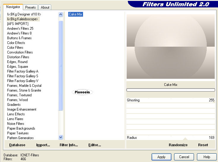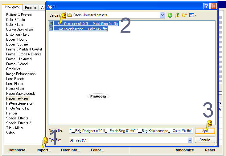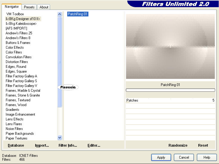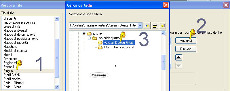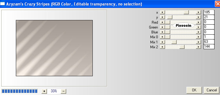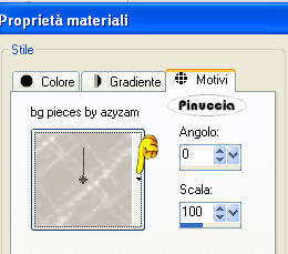 qui puoi trovare qualche risposta ai tuoi dubbi. Se l'argomento che ti interessa non è presente, ti prego di segnalarmelo. Questo tutorial è stato scritto con PSP XI. Per tradurlo, l'ho eseguito con PSP X. Occorrente: Materiale qui Se intendi condividere i tubes, mantienili al loro stato originale. Filtri: Filters Unlimited 2 qui Azyzam Designs Filters --> Crazy Stripes (lo trovi nello zip del materiale). Dopo aver scompattato lo zip del materiale, vedrai oltre ai tubes, due cartelle: la prima - Azyzam Design Filters - contiene il filtro di Azyzam. In PSP: File>Preferenze File>Percorsi file: 1. seleziona Plugin-in; 2. Clicca su Aggiungi; 3. Cerca e seleziona la cartella Azyzam Design Filters e clicca ok. ![]() La seconda cartella - Filters Unlimited - contiene due preset per questo filtro. Metti i due file nella cartella del filtro Unlimited. Apri tutto il materiale in PSP. Apri una nuova immagine trasparente 750 x 550 pixels. Imposta il colore di primo piano con #a39a92. Imposta il colore di sfondo con #fcf3eb. Passa il colore di primo piano a Gradiente di primo piano/sfondo, con i seguenti settaggi: ![]() Riempi l'immagine trasparente con questo gradiente.Effetti>Plugins>Filters Unlimited - &Bkg Kaleidoscope - Cake Mix, con i seguenti settaggi: 255-169: ![]() se non trovi i preset nella schermata del filtro, clicca su import (1), cerca la cartella dove li hai conservati, selezionali (2) e clicca Apri(3) ![]() Effetti>Plugins>Filters Unlimited 2 - &BKg Designers sf10II - PatchRing 01, patches 5: ![]() Livelli>Nuovo livello raster. Riempi il nuovo livello con lo stesso gradiente.Immagine>Capovolgi. Effetti>Plugins>Azyzam Designs Filters - Crazy Stripes, con i seguenti settaggi: ![]() Cambia la modalità di miscelatura di questo livello in Moltiplica, e abbassa l'opacità all'80%. Livelli>Duplica. Cambia la modalità di miscelatura di questo livello in Scurisci, e abbassa l'opacità al 60%. Attiva il tube Marif_2007_03Mars_misted_decor0139, e vai a Modifica>Copia. Torna al tuo lavoro e vai a Modifica>Incolla come nuovo livello. Lascialo come sta. Non occorre spostarlo. Attiva il tube Yoka-Photo's-sewing160407-small, e vai a Modifica>Copia. Torna al tuo lavoro e vai a Modifica>Incolla come nuovo livello. Sposta il tube in basso a destra, vedi il mio esempio.Livelli>Duplica. Regola>Sfocatura>Sfocatura gaussiana, raggio 30. ![]() Livelli>Disponi>Sposta giù. Attiva il tube Yoka_JdL_PerfumeBottle4, e vai a Modifica>Copia. Torna al tuo lavoro e vai a Modifica>Incolla come nuovo livello. Sposta il tube in basso a sinistra.Livelli>Disponi>Sposta giù. Cambia la modalità di miscelatura di questo livello in Luminanza (Esistente). Attiva "pinkscratches_torn paper_Myangel236" e vai a Modifica>Copia. Torna al tuo lavoro e vai a Modifica>Incolla come nuovo livello. Regola>Saturazione e Tonalità>Viraggio: ![]() Sposta il tube in basso, come nel mio esempio.Regola>Correzione gamma (Shift+G) e imposta tutto a 0,70. ![]() Attiva lo strumento Puntatore (o clicca la lettera D sulla tastiera).se stai usando PSP 9 è lo strumento Deformazione ![]() e "tira" il tube per tutta la larghezza della tela. ![]() Livelli>Duplica. Immagine>Capovolgi. Immagine>Rifletti. Assicurati che sia attivo il livello superiore. Attiva "scraptube1_joluvsdogs" e vai a Modifica>Copia. Torna al tuo lavoro e vai a Modifica>Incolla come nuovo livello. Immagine>Ridimensiona, all'85%, tutti i livelli non selezionato. Immagine>Ruota per gradi - 15 gradi a destra. ![]() Regola>Saturazione e tonalità>Viraggio: ![]() Spostalo nell'angolo in alto a sinistra.Attiva il tube dello spillo "pin", e vai a Modifica>Copia. Torna al tuo lavoro e vai a Modifica>Incolla come nuovo livello. Spostalo nell'angolo in alto a destra della striscia.Livelli>Duplica. Immagine>Rifletti, e avrai un altro spillo nell'angolo in basso a sinistra. Immagine>Aggiungi bordatura, 2 pixels, simmetriche, con il colore #fcf3eb, Immagine>Aggiungi bordatura, 15 pixels, simmetriche, con il colore #a39a92. Seleziona questo bordo con la bacchetta magica ![]() ![]() Apri il motivo "bgpieces by azyzam" e minimizzalo nella tua area di lavoro. Passa il colore di primo piano su Motivi e cercalo nella lista dei motivi disponibili. Seleziona il motivo con i seguenti settaggi: ![]() Riempi la selezione con questo motivo.Effetti>Effetti di bordo>Aumenta. Selezione>Deseleziona. Immagine>Aggiungi bordatura, 2 pixels, simmetriche, con il colore #fcf3eb. Selezione>Seleziona tutto. Selezione>Modifica>Contrai, di 19 pixels. Livelli>Nuovo livello raster. Effetti>Effetti 3D>Ritaglio, con i seguenti settaggi, colore nero: ![]() Selezione>Deseleziona. Livelli>Duplica. Immagine>Capovolgi. Immagine>Rifletti. Attiva il file di testo "Azywam word art-just me" e vai a Modifica>Copia. Torna al tuo lavoro e vai a Modifica>Incolla come nuovo livello. Spostalo dove preferisci.Abbassa l'opacità di questo livello al 75%. Aggiungi il tuo nome e/o il tuo watermark e salva in formato jpg. ![]() Se hai problemi o dubbi, o trovi un link non funzionante, o anche soltanto per un saluto, scrivimi. 11 Luglio 2007 |