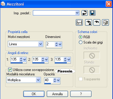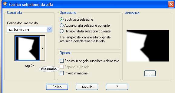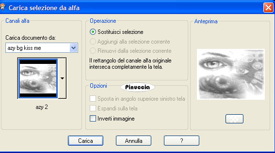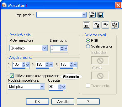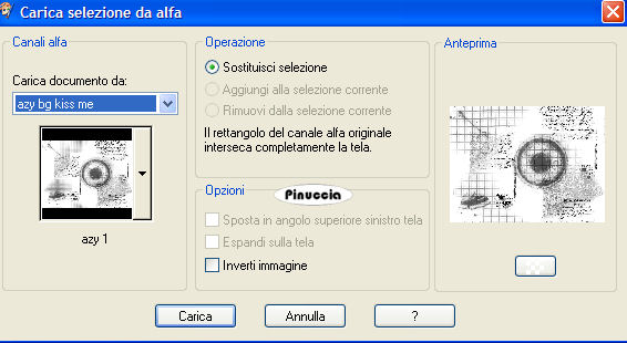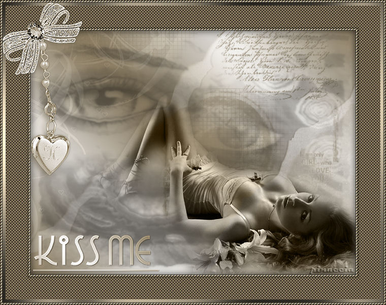qui puoi trovare qualche risposta ai tuoi dubbi. Se l'argomento che ti interessa non è presente, ti prego di segnalarmelo. Questo tutorial è stato scritto e tradotto con PSP X. Occorrente: Materiale qui Se vuoi condividere i tubes, per favore mantienili al loro stato originale. Filtro: Graphics Plus qui Apri tutti i tubes in PSP. Apri il file "azy bg kiss me". Questa sarà la base del tuo lavoro. Livelli>Nuovo livello raster. Riempi il nuovo livello con il colore #82745a.Selezione>Carica/Salva selezione>Carica selezione da canale alfa. Cerca e carica la selezione Azy 1. ![]() Premi sulla tastiera il tasto CANC ![]() Selezione>Deseleziona. Sullo stesso livello: Selezione>Carica/Salva selezione>Carica selezione da canale alfa. Cerca e carica la selezione Azy 2a. ![]() Premi sulla tastiera il tasto canc. ![]() Selezione>Deseleziona. Abbassa l'opacità di questo livello all'80%. Livelli>Nuovo livello raster. Riempi il nuovo livello con il colore #23201b.Selezione>Carica/Salva selezione>Carica selezione da canale alfa. Cerca e carica la selezione azy 2. ![]() Premi sulla tastiera il tasto canc. ![]() Selezione>Deseleziona. Apri il tube "Pink torn_Myangel236" e vai a Modifica>Copia. Torna al tuo lavoro e vai a Modifica>Incolla come nuovo livello. Spostalo nell'angolo in basso a destra,facendolo uscire un po' fuori dal bordo destro: ![]() Abbassa l'opacità di questo livello al 43%. Apri il tube "red torn_Myangel236" e vai a Modifica>Copia. Torna al tuo lavoro e vai a Modifica>Incolla come nuovo livello. Spostalo nell'angolo in alto a sinistra.Abbassa l'opacità di questo livello al 18%. Attiva il tube della donna "Giada_lili_dream" e vai a Modifica>Copia. Torna al tuo lavoro e vai a Modifica>Incolla come nuovo livello. Immagine>Ridimensiona, all'85%, tutti i livelli non selezionato. Spostalo nell'angolo in basso a destra,vedi il mio esempio. Cambia la modalità di miscelatura di questo livello in Luminanza (esistente). Controlla che tutti i tubes siano al posto giusto. Se necessario, puoi ancora spostarli, per sistemarli meglio. Imposta il colore di primo piano sul colore scuro #2f2819. Imposta il colore di sfondo sul colore chiaro #a29782. Immagine>Aggiungi bordatura, 1 pixel, simmetriche, con il colore #2f2819. Selezione>Seleziona tutto. Selezione>Modifica>Contrai, di 1 pixel. Effetti>Effetti 3d>Ritaglio, con i seguenti settaggi, colore nero. ![]() Ripeti l'Effetto Ritaglio, ma cambiando verticale e orizzontale a -3. Selezione>Deseleziona. Immagine>Aggiungi bordatura, 3 pixels, simmetriche, con il colore #a29782. Immagine>Aggiungi bordatura, 1 pixel, simmetriche, con il colore #2f2819. Seleziona il bordo da 3 pixels con la bacchetta magica , così impostata:![]() Effetti>Effetti artistici>Mezzitoni: ![]() Effetti>Effetti di bordo>Aumenta. Selezione>Deseleziona. Immagine>Aggiungi bordatura, 50 pixels, simmetriche, con il colore #a29782. Seleziona il bordo con la bacchetta magica , così impostata:![]() Effetti>Effetti artistici>Mezzitoni: ![]() Selezione>Deseleziona. Immagine>Aggiungi bordatura, 1 pixel, simmetriche, con il colore #2f2819. Immagine>Aggiungi bordatura, 3 pixels, simmetriche, con il colore #a29782. Immagine>Aggiungi bordatura, 1 pixel, simmetriche, con il colore #2f2819. Seleziona il bordo da 3 pixels, con la bacchetta magica così impostata:![]() Effetti>Effetti artistici>Mezzitoni: ![]() Effetti>effetti di bordo>Aumenta. Selezione>Deseleziona. Livelli>Nuovo livello raster. Selezione>Seleziona tutto. Selezione>Modifica>Contrai, di 5 pixels. Riempi con il colore #a29782.Selezione>Modifica>Contrai, di 6 pixels. Premi sulla tastiera il tasto CANC. Selezione>Deseleziona. Seleziona l'ultimo bordo con la bacchetta magica ![]() Effetti>Plugins>Graphics Plus - Cross Shadow, con i settaggi standard. ![]() Regola>Messa a fuoco>Metti a fuoco. Selezione>Deseleziona. Apri il cuore e vai a Modifica>Copia. Torna al tuo lavoro e vai a Modifica>Incolla come nuovo livello. Spostalo nell'angolo in alto a sinistra.Apri il testo "Kiss me" e vai a Modifica>Copia. Torna al tuo lavoro e vai a Modifica>Incolla come nuovo livello. Spostalo nell'angolo in basso a sinistra.Aggiungi il nome o il tuo watermark e salva in formato jpg. ![]() Se hai problemi o dubbi, o trovi un link non funzionante, o anche soltanto per un saluto, scrivimi. 14 Aprile 2007 |