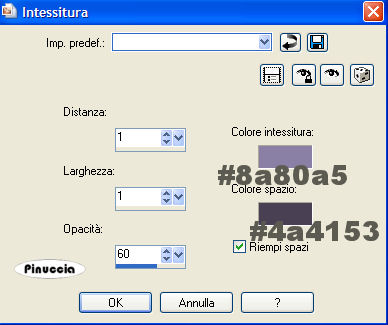 qui puoi trovare qualche risposta ai tuoi dubbi. Se l'argomento che ti interessa non è presente, ti prego di segnalarmelo. Occorrente: Materiale qui Filtro: Graphics Plus qui Se vuoi condividere i tubes, per favore lascia intatto il livello del copyright. Apri i tubes in PSP. Apri il file di sfondo "my world background-azyzam". Questa sarà la tua area di lavoro. Apri il tube del ponte "bridge misted my azyzam". Posizionati sul livello del tube e vai a Modifica>Copia. Torna al tuo lavoro e vai a Modifica>Incolla>Incolla come nuovo livello. Spostalo un po' in basso.Apri il tube "bridge2 misted my azyzam". Posizionati sul livello del tube. Modifica>Copia. Torna al tuo lavoro e vai a Modifica>Incolla>Incolla come nuovo livello. Spostalo in alto a destra.![]() Apri il tube della donna "tubed by Monique42_1260" e vai a Modifica>Copia. Torna al tuo lavoro e vai a Modifica>Incolla>Incolla come nuovo livello. Spostalo a sinistra.Apri il file di testo "my world textart by azyzam" e vai a Modifica>Copia. Torna al tuo lavoro e vai a Modifica>Incolla>Incolla come nuovo livello. Spostalo in basso a destra.Immagine>Aggiungi bordatura, 2 pixels, simmetriche, con il colore #4a4153. Immagine>Aggiungi bordatura, 10 pixels, simmetriche, con il colore #8a80a5. Seleziona il bordo con la bacchetta magica ![]() ![]() Effetti>Effetti di trama>Intessitura: ![]() Selezione>Nessuna selezione. Immagine>Aggiungi bordatura, 2 pixels, con il colore #4a4153. Immagine>Aggiungi bordatura, 25 pixels, simmetriche, con il colore #8a80a5. Seleziona il bordo con la bacchetta magica ![]() ![]() Effetti>Plugins>Graphics Plus - Cross shadow, con i settaggi standard. ![]() Selezione>Nessuna selezione. Immagine>Aggiungi bordatura, 2 pixels, simmetriche, con il colore #4a4153. Immagine>Aggiungi bordatura, 10 pixels, simmetriche, con il colore #8a80a5. seleziona il bordo con la bacchetta magica ![]() ![]() Effetti>Effetti di trama>Intessitura: ![]() Selezione>Nessuna selezione. Immagine>Aggiungi bordatura, 2 pixels, simmetriche, con il colore #4a4153. Aggiungi il tuo nome o il tuo watermark e salva in formato jpg. ![]() Se hai problemi o dubbi, o trovi un link non funzionante, o anche soltanto per un saluto, scrivimi. 6 Febbraio 2007 |