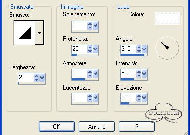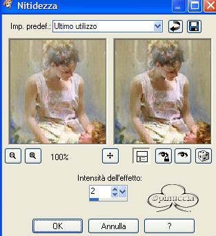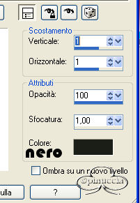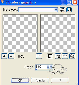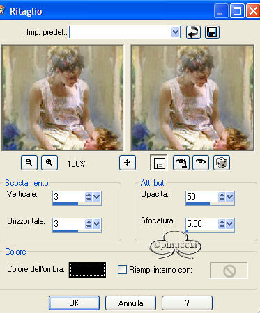 qui puoi trovare qualche risposta ai tuoi dubbi. Se l'argomento che ti interessa non è presente, ti prego di segnalarmelo. Occorrente: Materiale qui Filtri: Pentacom / Dot and cross qui Metti il pennello nella cartella pennelli di PSP. Apri i tubes e il file di sfondo in PSP. Comincia a lavorare con l'immagine di sfondo (botanicaleden). Livelli>Innalza livello di sfondo. Immagine>Dimensioni tela, con i seguenti settaggi: ![]() Clicca sulla freccia centrale destra, per spostare tutto lo spazio vuoto a sinistra. Selezione>Seleziona tutto. Selezione>Mobile. Selezione>Innalza selezione a livello. Selezione>Nessuna selezione. Immagine>Rifletti. Livelli>Unisci>Unisci visibile. Nella paletta dei livelli abbassa l'opacità al 75%. Apri il tube della donna con il bambino e vai a Modifica>Copia. Torna al tuo lavoro e vai a Modifica>Incolla>Incolla come nuovo livello. Spostalo in basso al centro.vedi come esempio l'immagine finale. Apri il tube della donna "Vrouwlinks" e vai a Modifica>Copia. Torna al tuo lavoro e vai a Modifica>Incolla>Incolla come nuovo livello. Spostalo completamente a sinistra nell'angolo in basso.Apri il tube della donna "Vrouwrechts" e vai a Modifica>Copia. Torna al tuo lavoro e vai a Modifica>Incolla>Incolla come nuovo livello. Spostalo a destra nell'angolo in basso.Apri il tube del vaso con il fiore ("Pot met bloemen) e vai a Modifica>copia. Torna al tuo lavoro e vai a Modifica>Incolla>Incolla come nuovo livello. Spostalo alla sinistra della donna con il bambino.Chiudi il livello di sfondo. Livelli>Unisci>Unisci visibile. Livelli>Duplica. Apri il livello di sfondo. Livelli>Unisci>Unisci tutto. Regola>Luminosità e contrasto>Nitidezza: ![]() Selezione>Seleziona tutto. Selezione>Modifica>Contrai di 8 pixels. Selezione>Inverti. Regola>Sfocatura>Sfocatura gaussiana, raggio 8. ![]() Effetti>Plugins>Penta.com / Dot and cross, con i settaggi standard. ![]() Effetti>Effetti 3D>Smusso a incasso, con i settaggi standard, ma cambiando la larghezza a 2. ![]() Selezione>Inverti. Effetti>Effetti 3D>Ritaglio: ![]() Ripeti l'Effetto Ritaglio, ma cambiando verticale e orizzontale a -3. Selezione>Nessuna selezione. Livelli>Nuovo livello raster. Attiva lo strumento Pennello ![]() Cerca il pennello azy-relaxing in the garden e applicalo sull'immagine come preferisci. Io l'ho applicato con il colore bianco. Se stai usando PSP 9, il pennello potrebbe non funzionare. Nonostante sia caricato, potrebbe non apparire nella lista dei pennelli disponibili. In tal caso apri il file azy-playing e vai a File>Esporta>Pennello personalizzato: ![]() dai un nome al pennello (diverso da quello originale, altrimenti riceverai il messaggio che esiste già) ![]() e clicca ok. Non far caso a eventuali messaggi di errore che potrebbero apparire. Chiudili. Il pennello sarà disponibile nel menu dei pennelli con il nome che gli avrai assegnato. Effetti>Effetti 3D>Sfalsa ombra, con i seguenti settaggi: ![]() Io ho duplicato il livello del pennello: Livelli>Duplica. Aggiungi il tuo nome o il watermark. Livelli>Unisci>Unisci tutto. Salva in formato .jpg. ![]() Se hai problemi o dubbi, o trovi un link non funzionante, o anche soltanto per un saluto, scrivimi. Luglio 2006 |