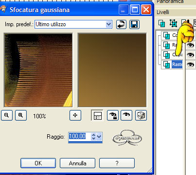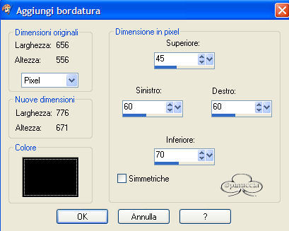 qui puoi trovare qualche risposta ai tuoi dubbi. Se l'argomento che ti interessa non è presente, ti prego di segnalarmelo. Occorrente: Filtri: Transparency/Eliminate black qui Penta.com / Dot and Cross qui Xero Porcelain qui Materiale qui Il frattale è una creazione di Azyzam. Non usatelo per altri tutorial. Per favore, rispettate questa richiesta. Non so chi ha fatto il tube, se lo sapete, per favore fatemelo conoscere. Partiamo con il frattale di sfondo. Apri il frattale e vai a Immagine>Dimensione tela, con questi settaggi: ![]() Seleziona con la bacchetta magica i bordi bianchie riempili con il nero (sfumatura e tolleranza 0).Nella paletta dei livelli clicca con il tasto destro del mouse sul livello e e scegli Innalza livello di sfondo. Livelli>Duplica. Effetti>Plugins>Transparency - Eliminate Black. Immagine>Rifletti. Livelli>Duplica. Livelli>Unisci>Unisci giù. Apri il tube "June" e vai a Modifica>copia. Torna al tuo lavoro e vai a Modifica>Incolla>Incolla come nuovo livello. Spostalo un po' in basso, vedi il mio esempio.Livelli>Duplica. Effetti>Plugins>Xero / Porcelain, con i settaggi standard. ![]() Posizionati sul livello inferiore per attivarlo. Regola>Sfocatura>Sfocatura gaussiana, raggio 100. ![]() Regola>Aggiungi/Rimuovi disturbo>Aggiungi disturbo, con i seguenti settaggi: ![]() Posizionati sul livello successivo. ![]() Livelli>Duplica. Immagine>Rifletti. Livelli>Unisci>Unisci tutto. Immagine>Aggiungi bordatura, 1 pixel, simmetriche, con il colore #dfad4c. Immagine>Aggiungi bordatura, 1 pixel, simmetriche, con il colore nero. Immagine>Aggiungi bordatura, 1 pixel, simmetriche, con il colore #dfad4c. Immagine>Aggiungi bordatura, non simmetriche, con i seguenti settaggi: ![]() Seleziona>seleziona tutto. Seleziona>Modifica>Contrai di 100 pixels. Modifica>Copia. Selezione>Nessuna selezione. Attiva la bacchetta magica (sfumatura e tolleranza 0, antialias selezionato).Seleziona il bordo nero. Modifica>Incolla>Incolla nella selezione l'immagine che hai appena copiato. Regola>Sfocatura>Sfocatura gaussiana, raggio 15. Effetti>Filtri>Penta.com /Dot and cross: ![]() Selezione>Nessuna selezione. Immagine>Aggiungi bordatura, 1 pixel, simmetriche, con il colore #dfad4c. Immagine>Aggiungi bordatura, 1 pixel, simmetriche, con il colore nero. Immagine>Aggiungi bordatura, 1 pixel, simmetriche, con il colore #dfad4c. Attiva lo strumento Testo come vettorecolore di sfondo #c9b53d, e scrivi il tuo testo. Effetti>Effetti 3D>Sfalsa ombra, con i seguenti settaggi e l'ombra in un secondo livello: ![]() Nella paletta dei livelli, posizionati sul livello del testo (non su quello dell'ombra) e abbassa l'opacità al 60%. Aggiungi il tuo nome o il watermark e salva in formato jpg. ![]() Se hai problemi o dubbi, o trovi un link non funzionante, o anche soltanto per un saluto, scrivimi. Giugno 2006 |