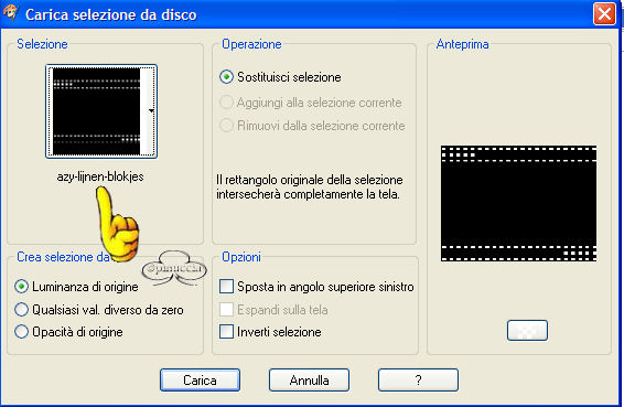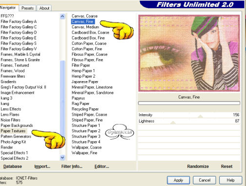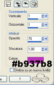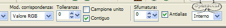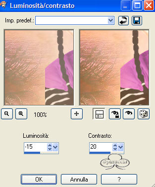 qui puoi trovare qualche risposta ai tuoi dubbi. Se l'argomento che ti interessa non è presente, ti prego di segnalarmelo. Occorrente: Materiale qui Filtro: Filtro Unlimited 2 qui Apri i tubes e lo sfondo in PSP. Metti la selezione nella cartella Selezioni di PSP. Apri il file Azy-softsummerbg. Livelli>Innalza livello di sfondo. Premi Shift + D per fare una copia e mettila da parte, perchè ti servirà dopo. Apri il tube della ragazza e vai a Modifica>copia. Torna al tuo sfondo e vai a Modifica>Incolla>Incolla come nuovo livello. Spostalo sul lato destro.Nella paletta dei livelli abbassa l'opacità al 50%. Fai attenzione che i lati sopra e sotto coincidano bene con i limiti dell'immagine eventualmente potrai spostarli dopo. Posizionati sul livello inferiore. Livelli>Nuovo livello raster. Selezione>Carica/Salva selezione/carica selezione da disco. Cerca e carica la selezione azy-lijnen blokies. ![]() Nella paletta dei colori passa il colore di primo piano a Motivi e seleziona l'immagine di sfondo che hai duplicato prima. Riempi la selezione con questo pattern.Ti sembrerà che non sia cambiato niente, ma il risultato verrà dopo. Selezione>Nessuna selezione. Effetti>Effetti 3D>Sfalsa ombra, con i seguenti settaggi: ![]() Immagine>Rifletti. Immagine>Capovolgi. Livelli>Duplica (hai duplicato il livello dei quadratini). Posizionati nuovamente sul livello inferiore. Apri il tube dell'occhio e vai a Modifica>Copia. Torna al tuo lavoro (sei sempre sul livello inferiore) e vai a Modifica>Incolla>Incolla come nuovo livello. Nella paletta dei livelli abbassa l'opacità al 50% e posizionalo ![]() Livelli>Unisci>Unisci tutto (appiattisci). Immagine>Aggiungi bordatura, 2 pixels, simmetriche, con un colore verde. Seleziona il bordo con la bacchetta magica eriempilo con un pattern dorato.Immagine>Aggiungi bordatura, 10 pixels, simmetriche, con il colore #cc7689. Seleziona il bordo con la bacchetta magica , sfumatura,antialias interno:![]() Effetti>Plugins>Unlimited - Paper Texture - Canvas fine, con i settaggi standard: ![]() Immagine>Aggiungi bordatura, 2 pixels, simmetriche, con lo stesso colore verde usato prima. Seleziona il bordo con la bacchetta magica eriempilo con il pattern dorato.Aggiungi un testo a scelta e il tuo watermark. Livelli>Unisci>Unisci tutto. Regola>Luminosità e contrasto: ![]() Ripeti questo passo ancora una volta. Salva in formato jpg. ![]() Se hai problemi o dubbi, o trovi un link non funzionante, o anche soltanto per un saluto, scrivimi. Giugno 2006