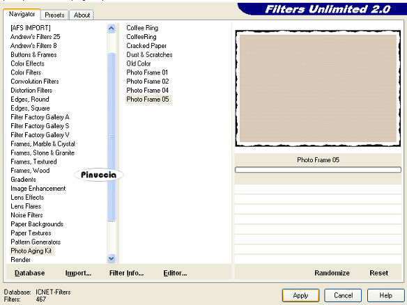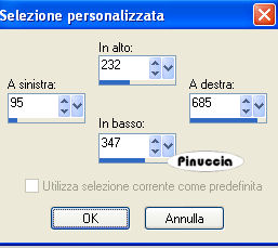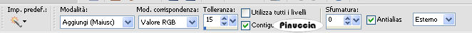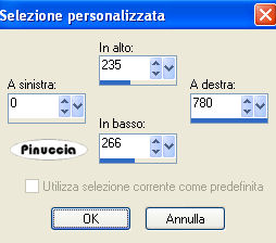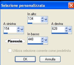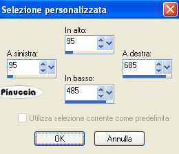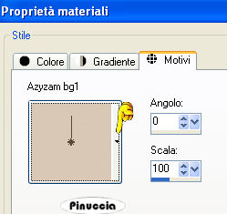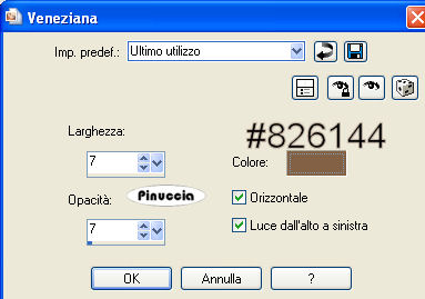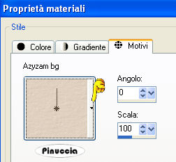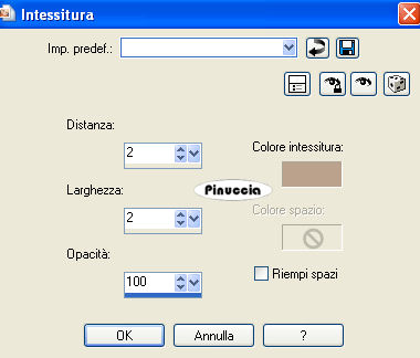 qui puoi trovare qualche risposta ai tuoi dubbi. Se l'argomento che ti interessa non è presente, ti prego di segnalarmelo. Questo tutorial è stato scritto con PSP XI. Per tradurlo, l'ho eseguito con PSP X. Occorrente: Materiale qui Se vuoi condividere i tubes, mantienili al loro stato originale. Filtri: Filters Unlimited 2.0 qui Photo Aging Kit qui Per usare Photo Aging Kit, devi importarlo nel filtro Unlimited. Come fare vedi qui Apri in PSP i tubes e le immagini di sfondo. 1. Apri una nuova immagine trasparente 780 x 580 pixels. Passa il colore di primo piano a Motivi. Apri il menu cliccando sulla freccia a fianco del box e cerca il motivo "Azyzam bg". avendolo aperto in PSP, lo troverai nella lista dei motivi disponibili. ![]() Riempi l'immagine trasparente con questo motivo.Livelli>Nuovo livello raster. Selezione>Seleziona tutto. Selezione>Modifica>Contrai, di 50 pixels. Imposta il colore di primo piano con il secondo Motivo che hai trovato nello zip "Azyzam bg 1" ![]() Riempi la selezione con questo motivo.Effetti>Plugins>Filters Unlimited - Photo Aging Kit - Photo frame 05. ![]() Selezione>Nessuna selezione. Attiva lo strumento Bacchetta magica , tolleranza 15, antialias, esterno selezionati.![]() Seleziona il bordo nero: ![]() Selezione>Modifica>Espandi, di 2 pixels. Premi sulla tastiera il tasto canc ![]() Selezione>Deseleziona. Effetti>Effetti 3D>Sfalsa ombra, con i seguenti settaggi, colore nero: ![]() Livelli>Nuovo livello raster. Selezione>Seleziona tutto. Selezione>Modifica>Contrai, di 90 pixels. Riempi la selezione con il colore #d9c7b5.Effetti>Effetti di trama>Veneziana, con i seguenti settaggi, colore ##826144. ![]() Mantieni selezionato. Livelli>Nuovo livello raster. Riempi con il bianco (#ffffff).Selezione>modifica>Contrai, di 5 pixels. Premi sulla tastiera il tasto canc ![]() Selezione>Deseleziona. Livelli>Unisci>Unisci giù. ![]() 2. Livelli>Nuovo livello raster. Attiva lo strumento Selezione, rettangolo, selezione personalizzata ![]() con i seguenti settaggi: ![]() Riempi la selezione con il bianco.Selezione>Deseleziona. Livelli>Duplica. Immagine>Ruota per gradi, 90 gradi a destra. ![]() Attiva lo strumento Selezione, rettangolo, selezione personalizzata, con i seguenti settaggi: ![]() Selezione>Inverti, e premi sulla tastiera il tasto canc. Livelli>Unisci>Unisci giù. Selezione>Deseleziona. Effetti>Effetti di trama>Veneziana, con i settaggi precedenti. Abbassa l'opacità di questo livello al 40%. ![]() 3. Attiva il livello sotto quello della croce bianca. ![]() Livelli>Duplica. Livelli>Disponi>Porta in alto. Immagine>Ridimensiona, all'80%, tutti i livelli non selezionato. Immagine>Ruota per gradi, 5 gradi a destra. Livelli>Duplica. Immagine>Ruota per gradi, 10 gradi a sinistra. Livelli>Duplica. Immagine>Ruota per gradi, 5 gradi a destra. ![]() Attiva il tube di Tarkan e vai a Modifica>copia. Torna al tuo lavoro e vai a Modifica>Incolla come nuovo livello. Immagine>Ridimensiona, all'80%, tutti i livelli non selezionato. Posiziona il tube al centro della cornice.Attiva lo strumento Selezione, selezione personalizzata, con i seguenti settaggi: ![]() Selezione>Inverti, e premi sulla tastiera il tasto canc. In questo modo saranno cancellate le tracce del tube all'esterno della selezione. Selezione>Deseleziona. 4. Attiva il tube Cross stitches e vai a Modifica>Copia. Torna al tuo lavoro e vai a Modifica>Incolla come nuovo livello. Spostalo in alto, come nel mio esempio.Livelli>Duplica. Immagine>Capovolgi. Attiva il tube Flower e vai a Modifica>Copia. Torna al tuo lavoro e vai a Modifica>Incolla come nuovo livello. Spostalo nell'angolo in alto a destra.Livelli>Duplica. Immagine>Rifletti. Immagine>Capovolgi. Sistema il fiore nell'angolo in basso a sinistra.5. Livelli>Nuovo livello raster. Attiva lo strumento Selezione, selezione personalizzata, con i seguenti settaggi: ![]() Riempi la selezione con il colore bianco.Selezione>Modifica>Contrai, di 4 pixels. Riempi con il colore rosa di primo piano #d9c7b7.Effetti>Effetti di trama>Intessitura, con i seguenti settaggi, colore dell'intessitura #bba28d. ![]() Selezione>Deseleziona. Immagine>Ruota per gradi, 30 gradi a sinistra. Sposta la striscia nell'angolo in alto a sinistra, come nel mio esempio.Livelli>Duplica. Immagine>Capovolgi. Immagine>Rifletti. Sposta il duplicato nell'angolo in basso a destra.Attiva il tube del fiocco "Strikje" e vai a Modifica>Copia. Torna al tuo lavoro e vai a Modifica>Incolla come nuovo livello. Posiziona il fiocco al centro della striscia a destra, come nel mio esempio.Livelli>Duplica, due volte, e posiziona i fiocchi come nel mio esempio.Attiva il tube del cuore "hangertje" e vai a Modifica>Copia. Torna al tuo lavoro e vai a Modifica>Incolla come nuovo livello. Sposta il tube in alto a sinistra.Immagine>Aggiungi bordatura, 2 pixels, simmetriche, con il colore bianco. Immagine>Aggiungi bordatura, 2 pixels, simmetriche, con il colore rosa. Immagine>Aggiungi bordatura, 2 pixels, simmetriche, con il colore bianco. Aggiungi il tuo nome e/o il tuo watermark e salva in formato jpg. ![]() Se hai problemi o dubbi, o trovi un link non funzionante, o anche soltanto per un saluto, scrivimi 21 Luglio 2007 |
