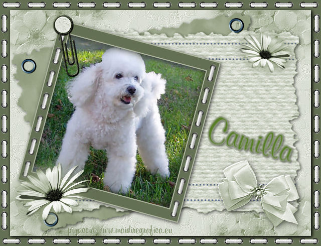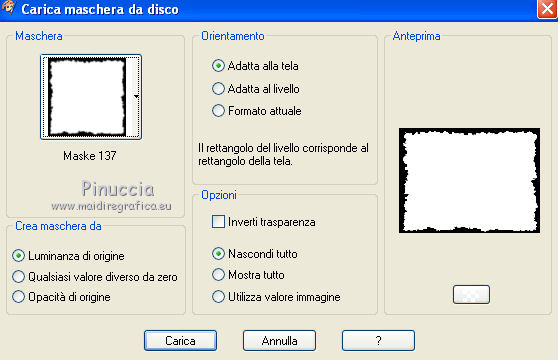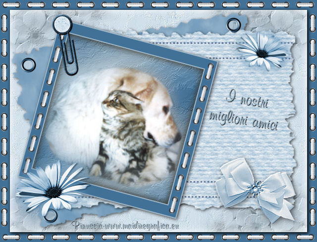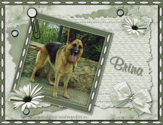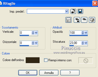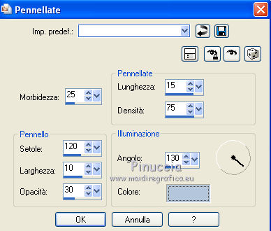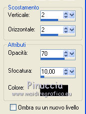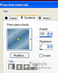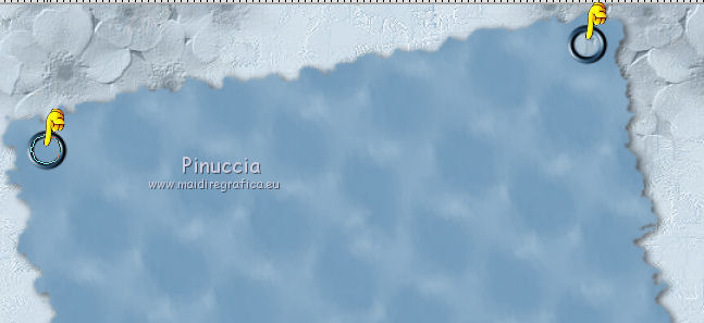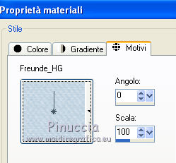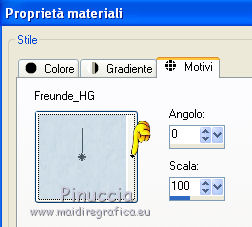 qui puoi trovare qualche risposta ai tuoi dubbi. Se l'argomento che ti interessa non è presente, ti prego di segnalarmelo. Questo tutorial è stato creato con PSP x2, ma può essere eseguito anche con le altre versioni di PSP. Per tradurlo, ho usato PSP X. Questo tutorial è ©Daty*Le-Beatrice e non può essere copiato su altri siti nè essere offerto per il download. Lo stesso vale per la mia traduzione. Il materiale viene da vari gruppi di condivisione. Il copyright appartiene ai rispettivi autori. Grazie ai creatori dei tubes che mettono a disposizione il loro lavoro in vari gruppi di condivisione. Occorrente: Materiale qui Per il materiale grazie Daisy e Gwyn. Rispetta il lavoro degli autori, non cambiare il nome del file e non cancellare il watermark. Filtri: se hai problemi con i filtri, consulta la mia sezione filtri qui FM Tile Tools - Blend Emboss qui Apri il font e minimizzalo. Lo troverai nella lista dei font disponibili quando ti servirà. Metti la maschera maske137 nella cartella Maschere. Imposta il colore di primo piano con #417197, e il colore di sfondo con #9fb8c9. Passa il colore di primo piano a Gradiente Lineare. ![]() Apri una nuova immagine trasparente 330 x 330 pixels, e riempila con il gradiente.Regola>Sfocatura>Sfocatura gaussiana - raggio 5. ![]() Effetti>Effetti tecniche di disegno>Pennellate, con il colore #b4c6dc. ![]() Apri il tube "freunde" e vai a Modifica>Copia. Torna al tuo lavoro e vai a Modifica>Incolla come nuovo livello. Livelli>Nuovo livello raster. Selezione>Seleziona tutto. Riporta il colore di primo piano al colore iniziale. Riempi il livello con il colore chiaro di sfondo.Selezione>Modifica>Contrai - 2 pixels. Riempi con il colore scuro di primo piano.Selezione>Modifica>Contrai - 20 pixels. Riempi con il colore chiaro.Selezione>modifica>Contrai - 2 pixels. Premi sulla tastiera il tasto CANC. Effetti>Effetti 3D>Ritaglio. ![]() Selezione>Deseleziona. Apri il tube "HDDDRope" e vai a Modifica>Copia. Torna al tuo lavoro e vai a Modifica>Incolla come nuovo livello. Immagine>Ridimensiona, al 93%, tutti i livelli non selezionato (devono rimanere visibili 7 punti della corda). Posiziona il tube sul bordo sinistro.Livelli>Duplica. Immagine>Rifletti. Livelli>Unisci>Unisci tutto e metti da parte questa immagine per il momento. Apri una nuova immagine trasparente 600 x 450 pixels. Apri il file "Freunde_HG1". Questo file è composto da tre livelli con tre differenti motivi. Lascia visibile soltanto il livello "HG1" e minimizza l'immagine. Passa il colore di primo piano a Motivi, apri il menu, cerca e seleziona il motivo con i seguenti settaggi. ![]() Riempi l'immagine trasparente con questo motivo.Apri il tube "flores" e vai a Modifica>Copia. Torna al tuo lavoro e vai a Modifica>Incolla come nuovo livello. Posiziona il tube in basso a sinistra.Livelli>Duplica. Immagine>Rifletti. Livelli>Unisci>Unisci giù. Livelli>Duplica. Immagine>Capovolgi. Livelli>Unisci>Unisci giù. Effetti>Plugins>FM Tile Tools - Blend Emboss, 2 volte con i settaggi standard. ![]() Abbassa l'opacità di questo livello al 50%. Livelli>Unisci>Unisci tutto. Livelli>Nuovo livello raster. Attiva nuovamente il file con i motivi "freunde_HG2". Chiudi il livello HG1 e apri il livello HG2. Sposta la trama in modo che riempia tutta l'ampiezza della tela.![]() Minimizza l'immagine e cerca questo motivo nella lista dei motivi disponibili e impostalo con i settaggi precedenti. ![]() Riempi il nuovo livello con questo motivo.Livelli>Carica/Salva maschera>Carica maschera da disco. Cerca e carica la maschera "Maske 137". ![]() Livelli>Unisci>Unisci gruppo. Effetti>Effetti 3D>Sfalsa ombra, con i seguenti settaggi. ![]() Immagine>Ridimensiona, all'85%, tutti i livelli non selezionato. Immagine>Ruota per gradi - 10 gradi a sinistra. ![]() Sposta l'immagine un po' più a sinistra.Apri il tube "Lo_Ring" e vai a Modifica>Copia. Torna al tuo lavoro e vai a Modifica>Incolla come nuovo livello. Spostalo nell'angolo in alto a sinistra.Livelli>Duplica e posiziona un anello per ogni angolo.Attiva lo strumento Gomma ![]() Posizionati sul livello della carta e cancella la parte al centro dell'anello. ![]() Livelli>Unisci>Unisci tutto. Livelli>Nuovo livello raster. Attiva ancora una volta i motivi "freunde_HG2". Chiudi il livello HG2 e apri il livello HG3 spostando il livello come hai fatto prima. ![]() Minimizza l'immagine e imposta questo motivo con i settaggi precedenti. ![]() Riempi il livello con questo motivo.Livelli>Carica/Salva maschera>Carica maschera da disco. Carica nuovamente la maschera "maske137". Livelli>Unisci>Unisci gruppo. Effetti>Effetti 3D>Sfalsa ombra, con i settaggi precedenti. Immagine>Ridimensiona, all'85%, tutti i livelli non selezionato. Sposta l'immagine un po' più a destra.Apri il tube "Punkte" e vai a Modifica>Copia. Torna al tuo alvoro e vai a Modifica>Incolla come nuovo livello. Sposta le righe sul bordo superiore della carta.Livelli>Duplica, e sposta queste righe sul bordo inferiore.Attiva la piccola immagine che hai minimizzato prima e vai a Modifica>Copia. Torna al tuo lavoro e vai a Modifica>Incolla come nuovo livello. Immagine>Ruota per gradi - 15 gradi a destra. Effetti>Effetti 3D>Sfalsa ombra, con i settaggi precedenti. Aggiungi i tubes che trovi nel materiale e posizionali a tuo piacimento.Attiva lo strumento Testo , font GE Curviture, dimensione 36, pennellata 1,e scrivi il tuo testo. Applica al testo un leggero Sfalsa ombra, a tua scelta. Aggiungi un piccolo bordo a tuo piacimento. Aggiungi il tuo nome e/o il tuo watermark e salva in formato jpg. ![]() ![]() ![]() ![]() ![]() Se hai problemi o dubbi, o trovi un link non funzionante, o anche soltanto per un saluto, scrivimi 28 Febbraio 2011 |