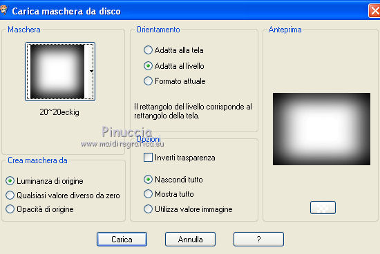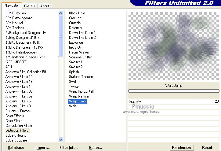 qui puoi trovare qualche risposta ai tuoi dubbi. Se l'argomento che ti interessa non è presente, ti prego di segnalarmelo. Questo tutorial è stato creato con PSP x2, ma può essere eseguito anche con le altre versioni di PSP. Per tradurlo, ho usato PSP X. Questo tutorial è ©Daty*Le-Beatrice e non può essere copiato su altri siti nè essere offerto per il download. Lo stesso vale per la mia traduzione. Il materiale viene da vari gruppi di condivisione. Il copyright appartiene ai rispettivi autori. Grazie ai creatori dei tubes che mettono a disposizione il loro lavoro in vari gruppi di condivisione. Occorrente: Materiale qui Per il materiale grazie Tony Chavarria, Silvie. Rispetta il lavoro degli autori, non cambiare il nome del file e non cancellare il watermark. Filtri: se hai problemi con i filtri, consulta la mia sezione filtri qui Filters Unlimited 2.0 qui Apri il font e minimizzalo. Lo troverai nella lista dei font disponibili quando ti servirà. Metti il pennello nella cartella Pennelli. Attenzione, il pennello è composto da due files che non devono essere separati. Vedi gli appunti sui pennelli qui Metti la maschera nella cartella Maschere e apri il resto del materiale in PSP. Scegli due colori dai tuoi tubes. Per il mio esempio: colore di primo piano #3d3a5b; colore di sfondo #455547. 1. Apri una nuova immagine trasparente 600 x 450 pixels. Attiva lo strumento Pennello ,e seleziona il pennello Daumenabdruk, dimensione 150. Applica il pennello - in maniera casuale - diverse volte con il colore di primo piano e con il colore di sfondo. Pressappoco dovresti avere questo. ![]() 2. Effetti>Plugins>Filters Unlimited 2.0 - Distortion Filters - Warp Jump. ![]() Livelli>Nuovo livello raster. Livelli>Disponi>Porta sotto. Riempi con il colore #b0a1df.Abbassa l'opacità di questo livello al 72%. Abbassa l'opacità del livello con i pennelli al 60%. Livelli>Unisci>Unisci visibile. 3. Livelli>Carica/Salva maschera>Carica maschera da disco. Cerca e carica la maschera 20-20eckig. ![]() Livelli>Unisci>Unisci gruppo. 4. Livelli>Nuovo livello raster. Riempi con il colore #2c0157.Livelli>Disponi>Sposta giù . Attiva nuovamente il livello superiore. Apri il tube "Faecher" e vai a Modifica>Copia. Torna al tuo lavoro e vai a Modifica>Incolla come nuovo livello. Livelli>Duplica. Immagine>Ridimensiona, all'80%, tutti i livelli non selezionato. Sposta questo livello un po' più in basso e a sinistra.Apri il tube Tocha2351 e vai a Modifica>Copia. Torna al tuo lavoro e vai a Modifica>Incolla come nuovo livello. Immagine>Ridimensiona, all'80%, tutti i livelli non selezionato. Abbassa l'opacità di questo livello al 71%. 6. Posiziona le immagini come nel mio esempio.![]() 7. Imposta il colore di primo piano con #2d0655, e il colore di sfondo con #cebad9. Attiva lo strumento Testo , font Luna Bar.![]() Dovrai regolare la dimensione in base al tuo testo e alla versione di PSP che stai usando. Scrivi il tuo testo e posizionalo. Livelli>Converti in livello raster. Effetti>Effetti 3D>Sfalsa ombra. ![]() 8. Livelli>Nuovo livello raster. Selezione>Seleziona tutto. Riempi con il colore di sfondo.Selezione>Modifica>Contrai - 2 pixels. Effetti>Effetti 3D>Ritaglio. ![]() Selezione>Modifica>Contrai - 25 pixels. Riempi con il colore chiaro.Selezione>modifica>Contrai - 1 pixels. Effetti>Effetti 3D>Ritaglio, con i settaggi precedenti. Selezione>Deseleziona. Aggiungi Aggiungi il tuo nome e/o il tuo watermark. Salva in formato jpg. ![]() Se hai problemi o dubbi, o trovi un link non funzionante, o anche soltanto per un saluto, scrivimi 24 Marzo 2011 |