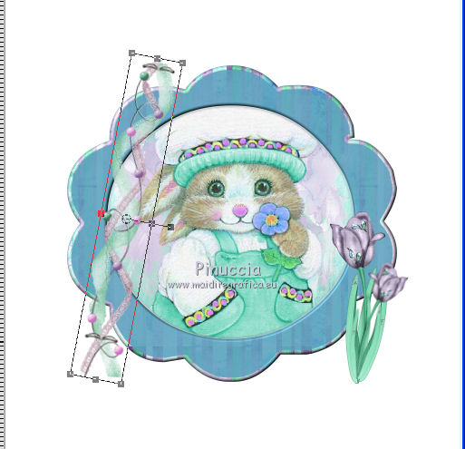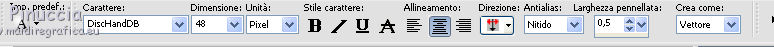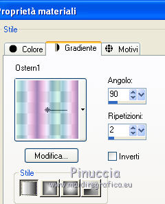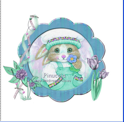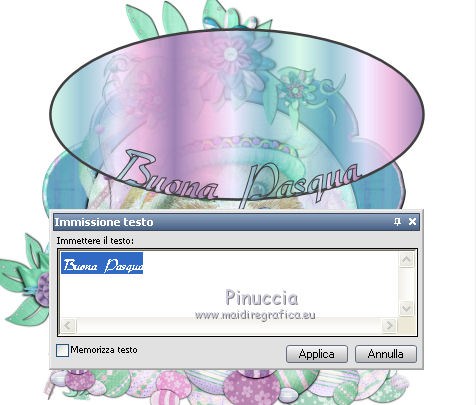qui puoi trovare qualche risposterscrapa ai tuoi dubbi. Se l'argomento che ti interessa non è presente, ti prego di segnalarmelo. Questo tutorial è stato creato con PSP x2, ma può essere eseguito anche con le altre versioni di PSP. Per tradurlo, ho usato PSP X. Questo tutorial è ©Daty*Le-Beatrice e non può essere copiato su altri siti nè essere offerto per il download. Lo stesso vale per la mia traduzione. Il materiale viene da vari gruppi di condivisione. Il copyright appartiene ai rispettivi autori. Grazie ai creatori dei tubes che mettono a disposizione il loro lavoro in vari gruppi di condivisione. Occorrente: Scrap qui Il resto del materiale qui Per il materiale grazie Rebecca. Rispetta il lavoro degli autori, non cambiare il nome del file e non cancellare il watermark. Metti il gradiente nella cartella Gradienti. Apri il font e minimizzalo. Lo troverai nella lista dei font disponibili quando ti servirà. 1. Apri una nuova immagine bianca 500 x 500 pixels. Apri il tube "frame1". Immagine>Ridimensiona, al 20%. Modifica>Copia. Torna alla tua immagine bianca e vai a Modifica>Incolla come nuovo livello. Attiva lo strumento Bacchetta magica ![]() e clicca al centro del cerchio per selezionarlo. Livelli>Nuovo livello raster. Livelli>Disponi>Sposta giù. 2. Apri Paper 6. Immagine>Ridimensiona, al 20%. Modifica>Copia. Torna al tuo lavoro e vai a Modifica>Incolla nella selezione. Mantieni selezionato. Apri il tube "easter12.psp" e vai a Modifica>Copia. Torna al tuo lavoro e vai a Modifica>Incolla come nuovo livello. Immagine>Ridimensiona, al 70%, tutti i livelli non selezionato. Spostalo al centro.Effetti>Effetti 3D>Sfalsa ombra: ![]() Selezione>Inverti. Premi sulla tastiera il tasto CANC. Selezione>Deseleziona. 3. Attiva il livello superiore. Apri il tube "Tulip 1". Immagine>Ridimensiona, al 10%. Modifica>Copia. Torna al tuo lavoro e vai a Modifica>Incolla come nuovo livello. Sposta il tube in basso a destra del cerchio.Livelli>Duplica. Immagine>Ridimensiona, al 70%, tutti i livelli non selezionato. Premi il tasto D per attivare lo strumento Deformazione ![]() e sposta il tube accanto al precedente, ruotandolo leggermente. ![]() 4. Apri il tube "ribbonflow". Immagine>Ridimensiona, al 10%. Modifica>Copia. Torna al tuo lavoro e vai a Modifica>Incolla come nuovo livello. Spostalo a sinistra.Attiva lo strumento Deformazione ![]() (per tutte le versioni di PSP, il tasto D per attivarlo) e ruota il nastro come nell'esempio. ![]() 5. Apri il tube "flower13". Immagine>Ridimensiona, al 10%. Modifica>Copia. Torna al tuo lavoro e vai a Modifica>Incolla come nuovo livello. Immagine>Ridimensiona, al 60%, tutti i livelli non selezionato. Sposta il tube a sinistra, sotto il nastro.![]() Apri il tube "eggpile". Immagine>Ridimensiona, al 10%. Modifica>Copia. Torna al tuo lavoro e vai a Modifica>Incolla come nuovo livello. Spostalo sotto la cornice.Apri il tube "leavescluster". Immagine>Ridimensiona, al 10%. Modifica>Copia. Torna al tuo lavoro e vai a Modifica>Incolla come nuovo livello. Immagine>Ridimensiona, al 90%, tutti i livelli non selezionato. Spostalo sul bordo superiore della cornice.Imposta il colore di primo piano con #404040. Passa il colore di sfondo a Gradiente e seleziona il gradiente Ostern1 con i seguenti settaggi. ![]() Attiva lo strumento Forme predefinite , cerchio,e disegna un cerchio sull'immagine (non preoccuparti della posizione). Immagine>Capovolgi. 6. Attiva lo strumento Testo ![]() ![]() Passa il mouse sul cerchio e, quando vedi la A sottolineata dalla mezzaluna, clicca con il tasto sinistro del mouse per attivare la finestra del testo. Scrivi il tuo testo, controllandone la posizione. se vuoi cambiare qualche impostazione, selezionando il testo puoi fare tutte le variazioni che vuoi finchè non sei soddisfatto del risultato. ![]() Nella paletta dei livelli, apri il menu del livello vettore e chiudi il livello dell'ellisse. ![]() Livelli>Converti in livello raster e l'ellisse che ti è servita da guida per il testo sparirà. Effetti>Effetti 3D>Sfalsa ombra: ![]() Adesso, se necessario, puoi posizionare correttamente il testo in basso. Aggiungi Aggiungi il tuo nome e/o il tuo watermark e salva in formato jpg. ![]() Se hai problemi o dubbi, o trovi un link non funzionante, o anche soltanto per un saluto, scrivimi. 24 Marzo 2011 |