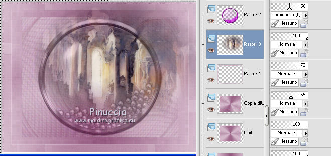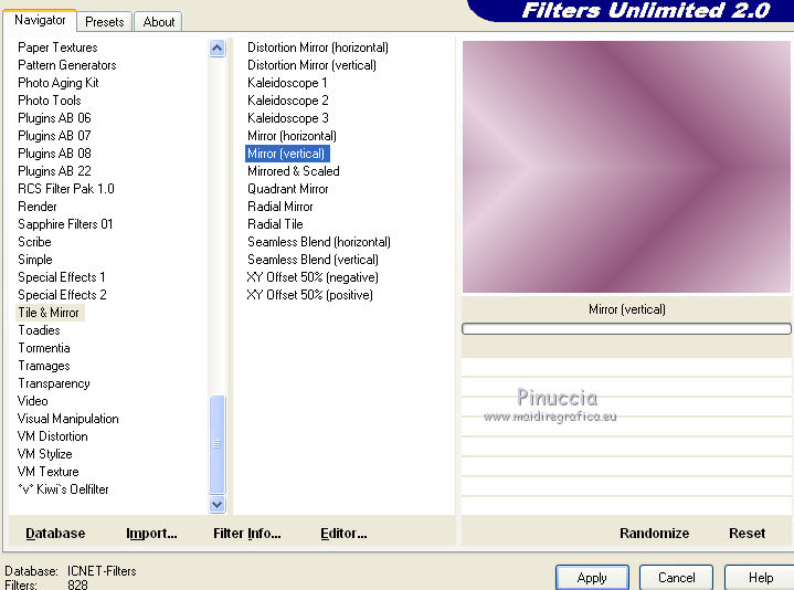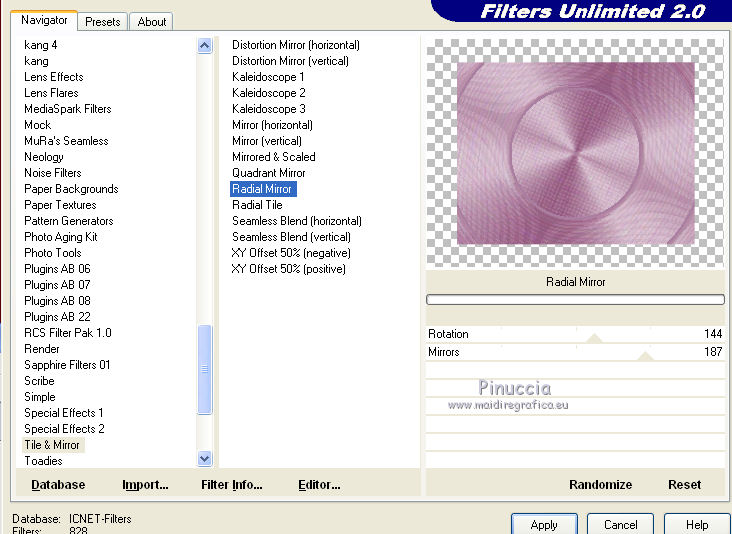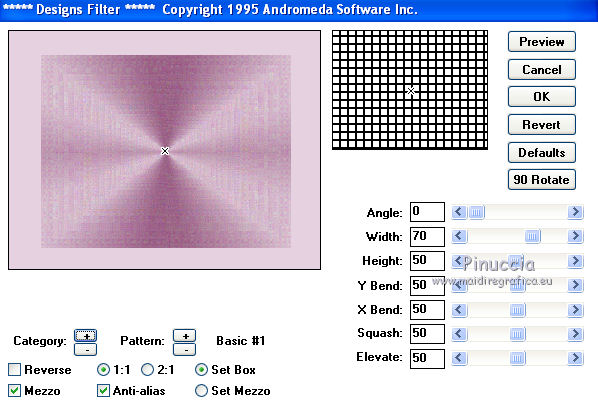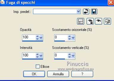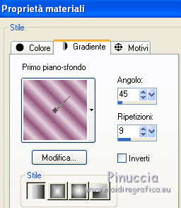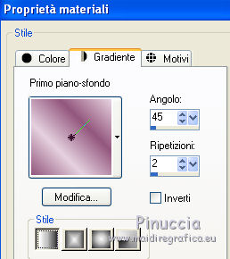 qui puoi trovare qualche risposta ai tuoi dubbi. Se l'argomento che ti interessa non è presente, ti prego di segnalarmelo. Questo tutorial è stato creato con PSP x2, ma può essere eseguito anche con le altre versioni di PSP. Per tradurlo, ho usato PSP X. Questo tutorial è ©Daty*Le-Beatrice e non può essere copiato su altri siti nè essere offerto per il download. Lo stesso vale per la mia traduzione. Il materiale viene da vari gruppi di condivisione. Il copyright appartiene ai rispettivi autori. Grazie ai creatori dei tubes che mettono a disposizione il loro lavoro in vari gruppi di condivisione. Occorrente: Materiale qui Per il materiale grazie Bibiche, Daniela Playtime, Silvie e Querida. Rispetta il lavoro degli autori, non cambiare il nome del file e non cancellare il watermark. Filtri: se hai problemi con i filtri, consulta la mia sezione filtri qui Filters Unlimited 2.0 qui Xero - Clarity qui Andromeda - Designs qui 1. Scegli due colori dai tuoi tubes. Imposta il colore di primo piano con il colore scuro (il mio #93567d), e il colore di sfondo con il colore chiaro (il mio #e5d1df). Passa il colore di primo piano a Gradiente. ![]() Apri una nuova immagine trasparente 650 x 500 pixels, e riempila con il gradiente.Effetti>Plugins>Filters Unlimited 2.0 - Tile & Mirror - Mirror (Vertical). ![]() 2. Livelli>Duplica. Immagine>Rifletti. Abbassa l'opacità di questo livello al 50%. Livelli>Unisci>Unisci visibile. Effetti>Effetti di bordo>Aumenta di più. Effetti>Effetti di bordo>Aumenta. 3. Livelli>Duplica. Immagine>Ridimensiona, all'80%, tutti i livelli non selezionato. Effetti>Effetti di riflesso>Fuga di specchi. ![]() Livelli>Duplica. Effetti>Plugins>Andromeda - Designs. ![]() Abbassa l'opacità di questo livello al 13%. Chiudi il livello inferiore. Livelli>Unisci>Unisci visibile. Riapri il livello inferiore e rimani posizionato sul livello Uniti. 4. Livelli>Duplica. Effetti>Plugins>Filters Unlimited 2.0 - Tile&Mirror - Radial Mirror. ![]() Abbassa l'opacità di questo livello al 55%. Effetti>Effetti di bordo>Aumenta. Apri il tube "Rahmen" e vai a Modifica>Copia. Torna al tuo lavoro e vai a Modifica>Incolla come nuovo livello. Rinomina questo livello "cornice". (se stai usando altri colori: Regola>Tonalità e saturazione>Viraggio, con i valori corrispondenti ai tuoi colori). 5. Apri il tube "Daniela Playtime_lila" e vai a Modifica>Copia. Torna al tuo lavoro e vai a Modifica>Incolla come nuovo livello. Immagine>Ridimensiona, al 93%, tutti i livelli non selezionato. Cambia la modalità di miscelatura di questo livello in Luminanza (esistente), e abbassa l'opacità al 50%. 6. Apri il tube "bibichedeco199" e vai a Modifica>Copia. Torna al tuo lavoro e vai a Modifica>Incolla come nuovo livello. Immagine>Ridimensiona, al 70%, tutti i livelli non selezionato. Spostalo come ti sembra meglio.Livelli>Disponi>Sposta giù. ![]() 7. Attiva il livello superiore. Clicca con la bacchetta magica all'esterno del cerchio.![]() Attiva il livello sottostante del tube e premi sulla tastiera il tasto CANC. Selezione>Deseleziona. Attiva nuovamente il livello superiore. 8. Apri il tube "Dat-Spiral" e vai a Modifica>Copia. Torna al tuo lavoro e vai a Modifica>Incolla come nuovo livello. Spostalo a destra;premi il tasto D per attivare lo strumento Deformazione ![]() e tira il tube fino al bordo superiore. ![]() Livelli>Duplica. Immagine>Rifletti. Abbassa l'opacità di questo livello al 60%. 9. Apri il tube "Sinedot_16.6.2007" e vai a Modifica>Copia. Torna al tuo lavoro e vai a Modifica>Incolla come nuovo livello. Cambia la modalità di miscelatura di questo livello in Luminanza (esistente), e abbassa l'opacità al 50%. Spostalo in basso, come nell'esempio.![]() Livelli>Duplica. Immagine>Capovolgi. Sposta il duplicato un po' più in alto.10. Apri il tube "Woman26Juni_byQuerida26.06.1" e vai a Modifica>Copia. Torna al tuo lavoro e vai a Modifica>Incolla come nuovo livello. Immagine>Ridimensiona, all'80%, tutti i livelli non selezionato. Posiziona il tube come preferisci, o vedi il mio esempio.Effetti>Effetti 3D>Sfalsa ombra: ![]() Effetti>Plugins>Xero - Clarity. ![]() 11. Livelli>Nuovo livello raster. Selezione>Seleziona tutto. Riempi la selezione con il colore di sfondo.Selezione>Modifica>Contrai - 1 pixel. Cambia i settaggi del gradiente. ![]() Riempi la selezione con il gradiente.Selezione>Modifica>Contrai - 1 pixel. Riempi con il colore di sfondo.Selezione>Modifica>Contrai - 1 pixel. Premi sulla tastiera il tasto CANC. Selezione>Deseleziona. Porta il livello della cornice sotto il livello del tube della donna. Aggiungi il tuo nome e/o il tuo watermark e salva in formato jpg. ![]() Se hai problemi o dubbi, o trovi un link non funzionante, o anche soltanto per un saluto, scrivimi 11 Luglio 2011 |