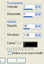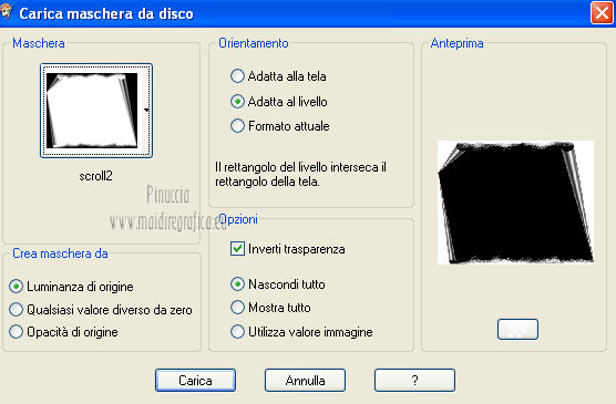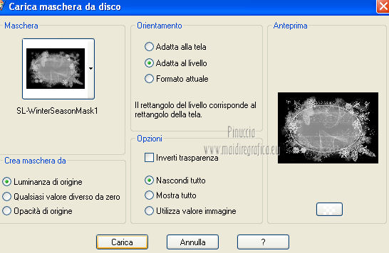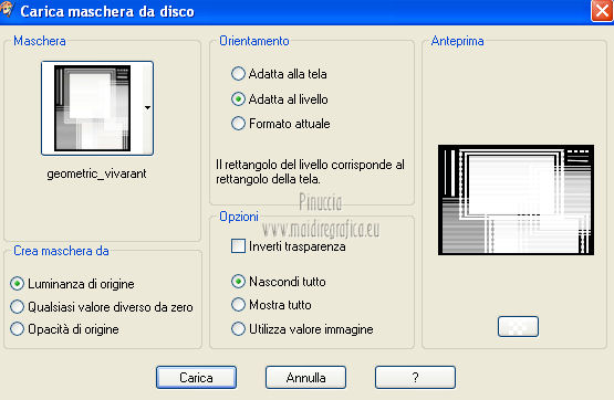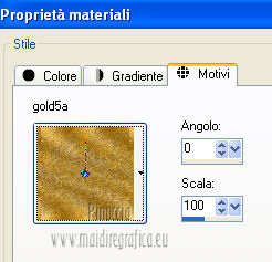 qui puoi trovare qualche risposta ai tuoi dubbi. Se l'argomento che ti interessa non è presente, ti prego di segnalarmelo. Questo tutorial è stato creato con PSP x2, ma può essere eseguito anche con le altre versioni di PSP. Per tradurlo, ho usato PSP X. Questo tutorial è ©Daty*Le-Beatrice e non può essere copiato su altri siti nè essere offerto per il download. Lo stesso vale per la mia traduzione. Il materiale viene da vari gruppi di condivisione. Il copyright appartiene ai rispettivi autori. Grazie ai creatori dei tubes che mettono a disposizione il loro lavoro in vari gruppi di condivisione. Occorrente: Materiale qui Per il materiale grazie Kara e RW. Rispetta il lavoro degli autori, non cambiare il nome del file e non cancellare il watermark. Filtri: se hai problemi con i filtri, consulta la mia sezione filtri qui Xero - Clarity qui Apri il font e minimizzalo. Lo troverai nella lista dei font disponibili quando ti servirà. Metti le maschere nella cartella Maschere. Apri il motivo oro gold5a in PSP e minimizzalo. Lo troverai nella lista dei Motivi disponibili quando ti servirà. 1. Scegli due colori dai tuoi tubes. Imposta il colore di primo piano con il colore chiaro (il mio #d9be89), e il colore di sfondo con il colore scuro (il mio #b49467). Apri una nuova immagine trasparente 700 x 500 pixels, e riempila con il colore chiaro.2. Livelli>Nuovo livello raster. Riempi con il colore scuro.Livelli>Carica/Salva maschera>Carica maschera da disco. Cerca e carica la maschera Brujita_san_valentin_6. ![]() Livelli>Unisci>Unisci gruppo. Abbassa l'opacità di questo livello al 30%. Livelli>Duplica. Immagine>Rifletti. Immagine>Capovolgi. 3. Apri il tube "rw-JingleBellsMusic~mist-11-9-07" e vai a Modifica>Copia. Torna al tuo lavoro e vai a Modifica>Incolla come nuovo livello. Livelli>Nuovo livello raster. Riempi con il colore chiaro.Livelli>Carica/Salva maschera>Carica maschera da disco. Cerca e carica la maschera "SL-winterSeasonMask1". ![]() Livelli>Unisci>Unisci gruppo. Effetti>Plugins>Xero - Clarity. ![]() Effetti>Effetti 3D>Sfalsa ombra. ![]() Livelli>Unisci>Unisci tutto. 4. Livelli>Carica/Salva maschera>Carica maschera da disco. Cerca e carica la maschera "geometric_vivarant". ![]() Livelli>Unisci>Unisci gruppo. Livelli>Nuovo livello raster. Riempi con il colore chiaro.Livelli>Disponi>Porta sotto. 5. Attiva il livello superiore. Livelli>Nuovo livello raster. Riempi con il colore scuro.Livelli>Carica/Salva maschera>Carica maschera da disco. Cerca e carica la maschera "scroll2". ![]() Livelli>Unisci>Unisci gruppo. Di nuovo Livelli>Carica/Salva maschera>Carica maschera da disco. Carica nuovamente la maschera "scroll2", con gli stessi settaggi. Livelli>Unisci>Unisci gruppo. Effetti>Effetti 3D>Sfalsa ombra, con i settaggi precedenti. 6. Apri il tube "KaraT5671" e vai a Modifica>Copia. Torna al tuo lavoro e vai a Modifica>Incolla come nuovo livello. Immagine>Rifletti. Immagine>Ridimensiona, all'80%, tutti i livelli non selezionato. Sposta il tube in basso a sinistra.Effetti>Plugins>Xero - Clarity, con i settaggi precedenti. 7. Apri il tube "B_VictorianSanta" e vai a Modifica>Copia. Torna al tuo lavoro e vai a Modifica>Incolla come nuovo livello. Immagine>Rifletti. Sposta il tube nell'angolo in basso a destra.Abbassa l'opacità di questo livello al 60%. Effetti>Plugins>Xero - Clarity, con i settaggi precedenti. 8. Attiva lo strumento Testo ![]() ![]() Passa il colore di primo piano a Motivi, e - nella categoria Immagini aperte - seleziona il motivo oro "Gold6a". ![]() Scrivi il tuo testo. Immagine>Ruota per gradi - 20 gradi a sinistra. ![]() Livelli>Converti in livello raster. Effetti>Effetti 3D>Sfalsa ombra, con i settaggi precedenti. 8. Apri il tube "St.Cl-Rahmen" e vai a Modifica>Copia. Torna al tuo lavoro e vai a Modifica>Incolla come nuovo livello. Aggiungi il tuo nome e/o il tuo watermark su un nuovo livello. Livelli>Unisci>Unisci tutto e salva in formato jpg. ![]() Se hai problemi o dubbi, o trovi un link non funzionante, o anche soltanto per un saluto, scrivimi 26 Novembre 2012 |